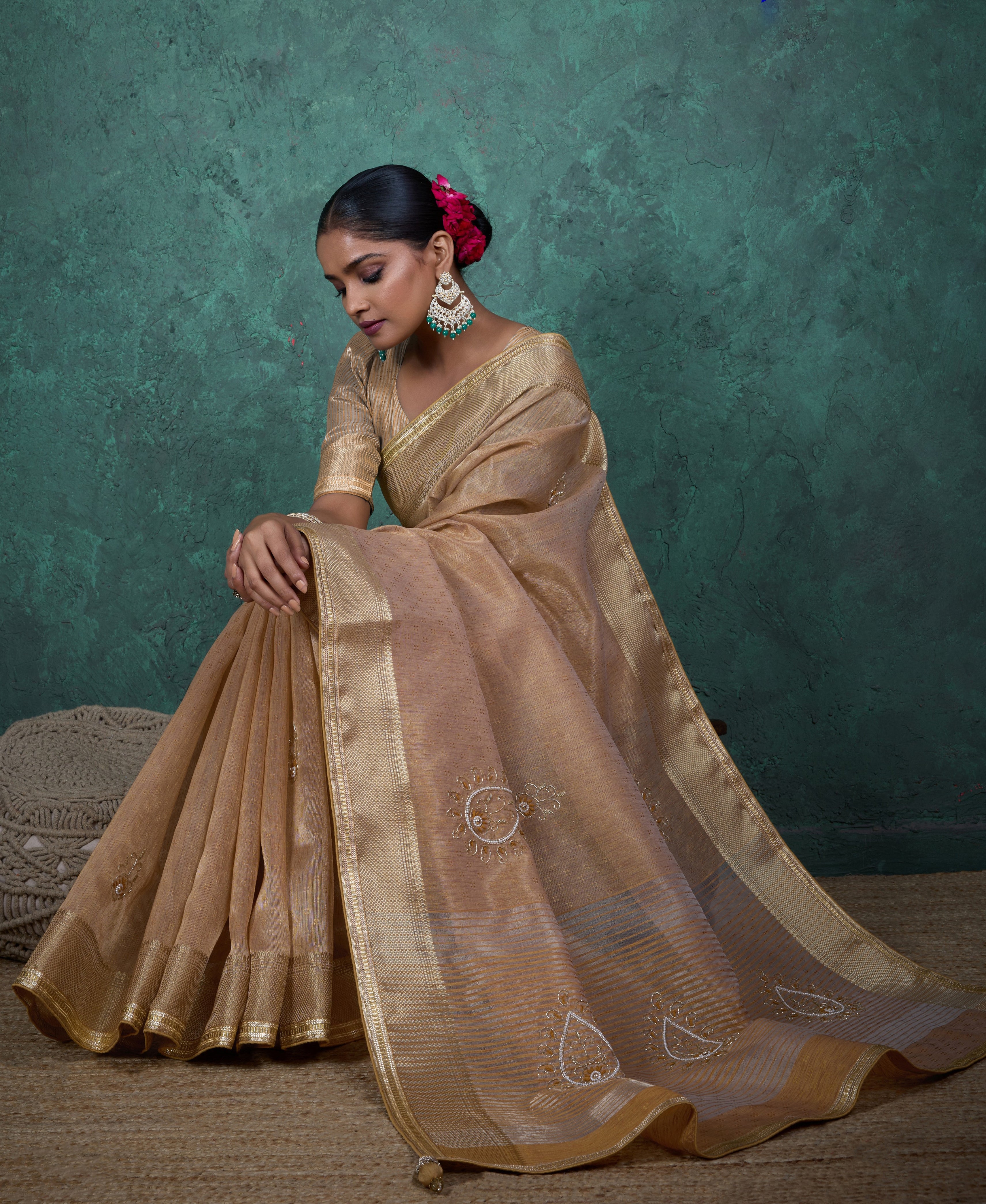 We have ensemble a symphony of enchanting piece to restyle your senses. Make an adorable statement in such a smashy Beige color linen tissue trendy saree. This desirable attire is showing some remarkable handwork khatli work butta. Comes with matching blouse. (Slight variation in color, fabric & work is possible. Model images are only representative.)