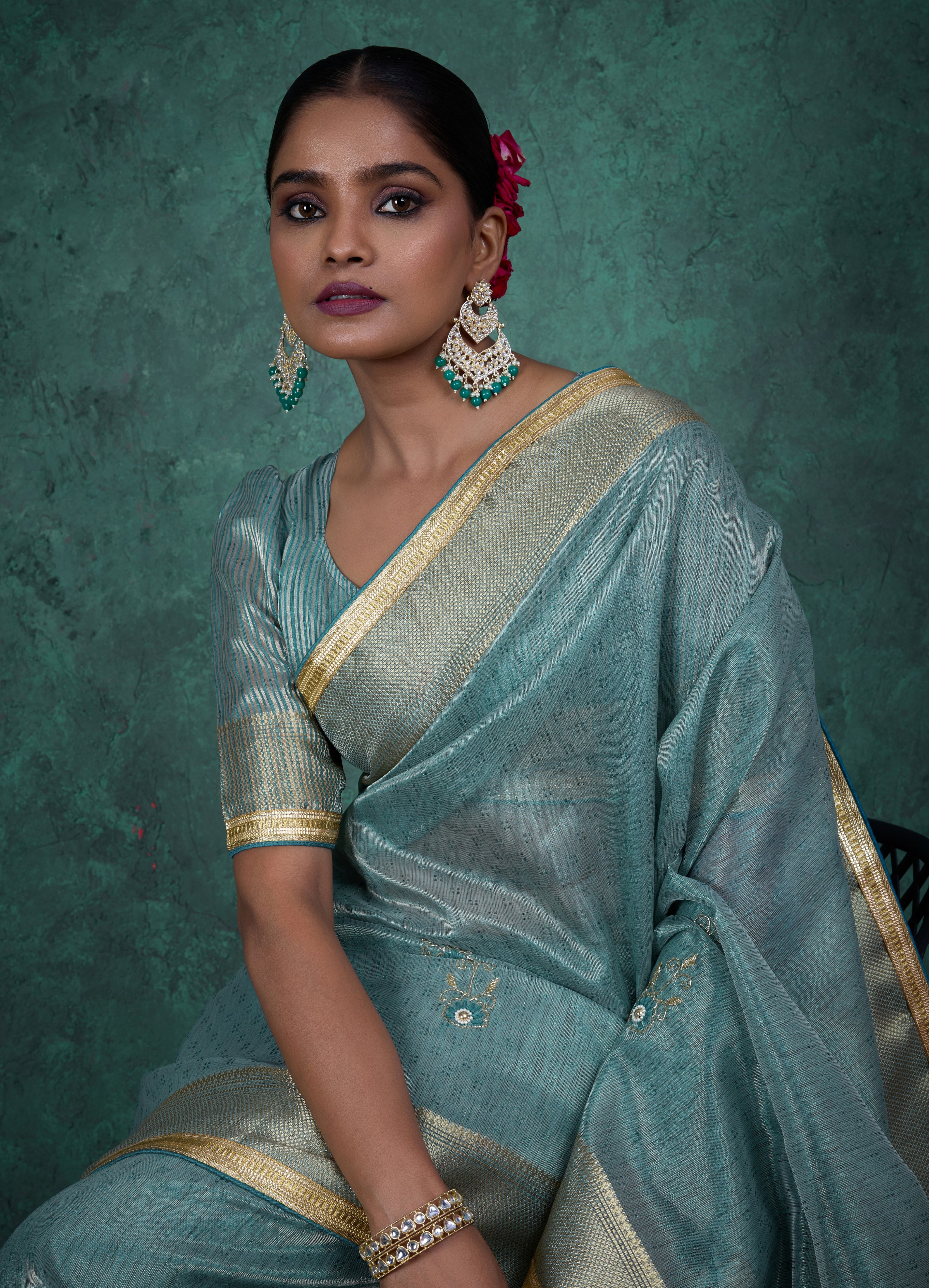 We have ensemble a symphony of enchanting piece to restyle your senses. Make an adorable statement in such a smashy Light blue color linen tissue trendy saree. This desirable attire is showing some remarkable handwork khatli work butta. Comes with matching blouse. (Slight variation in color, fabric & work is possible. Model images are only representative.)