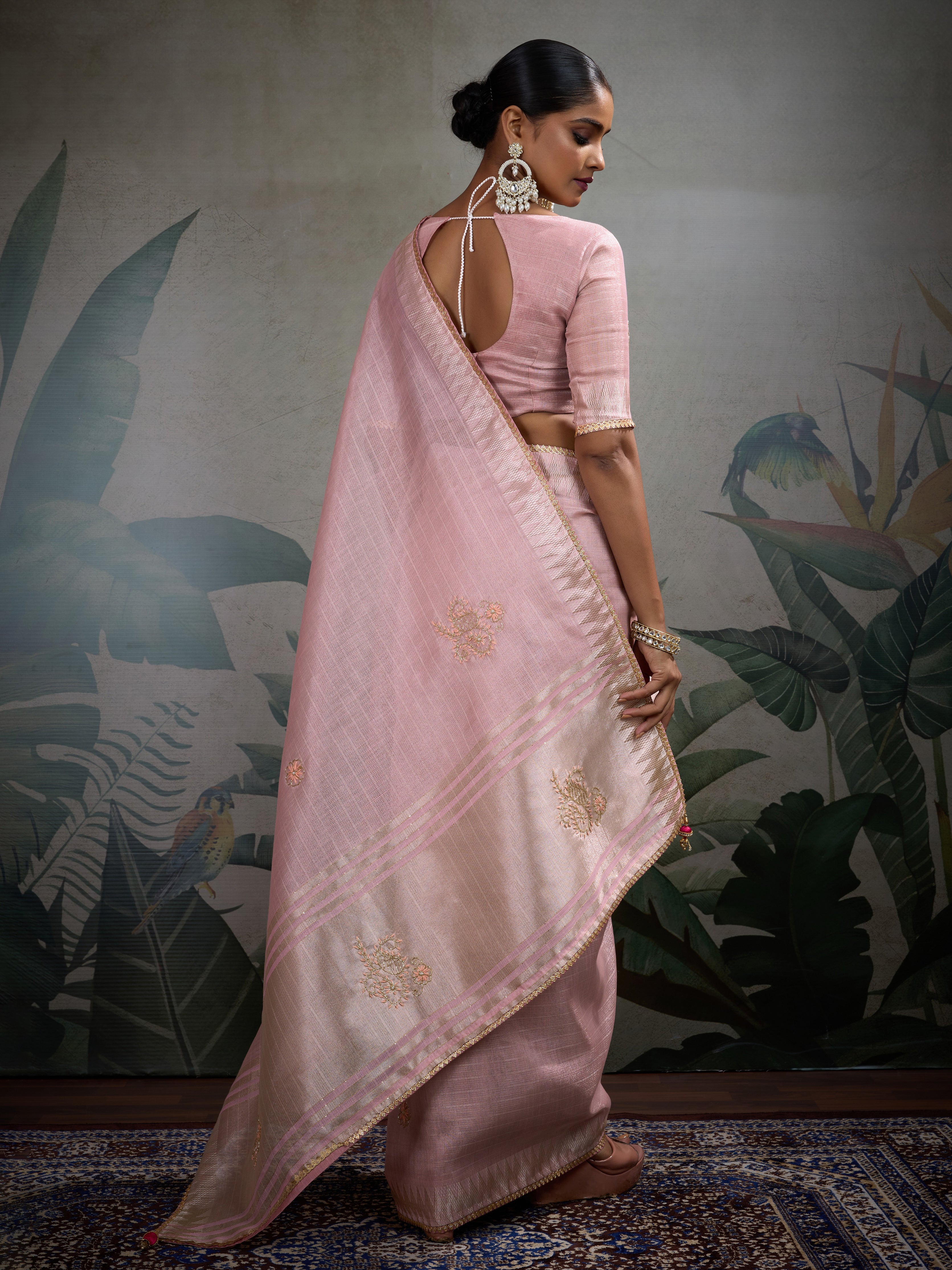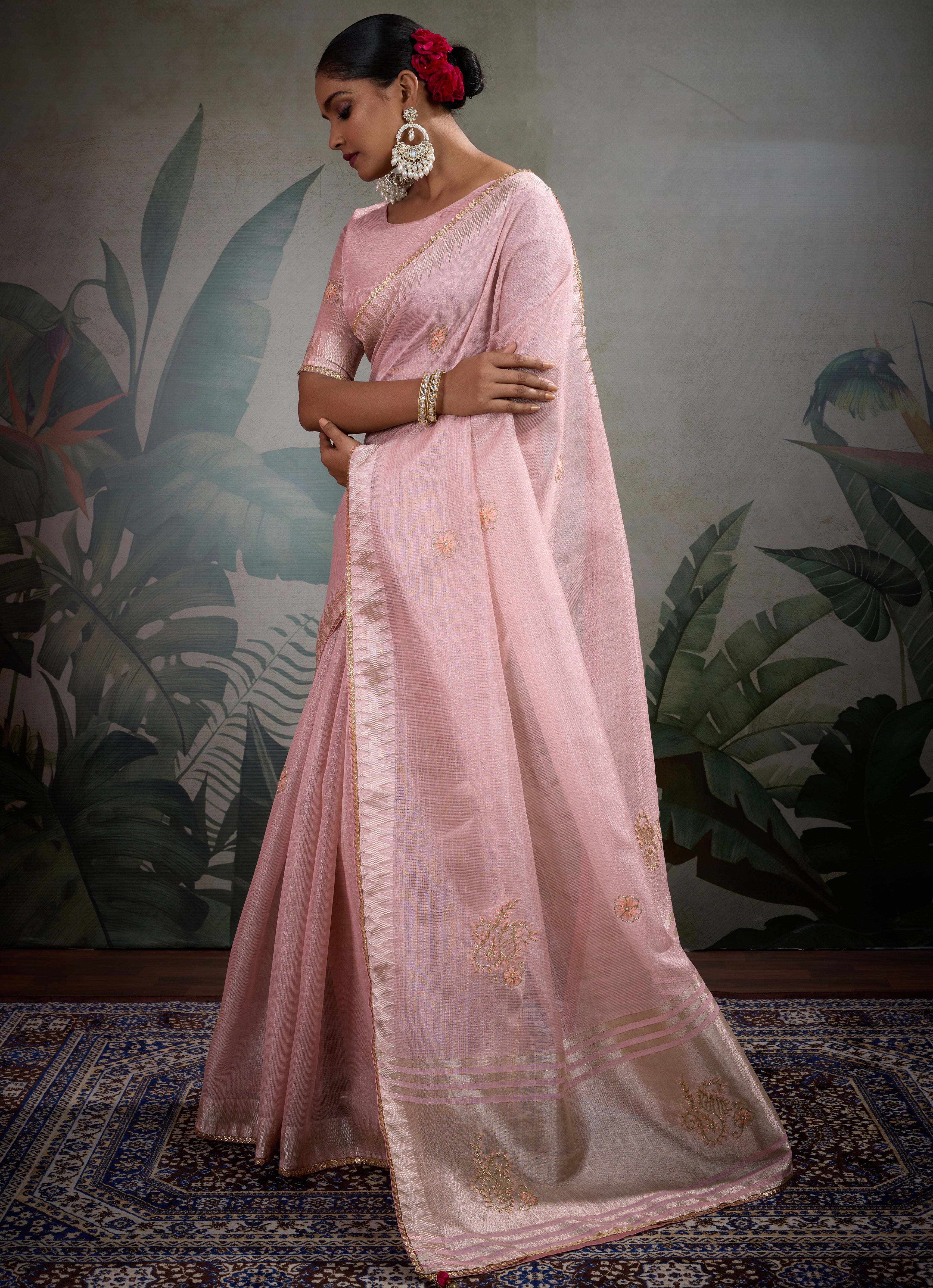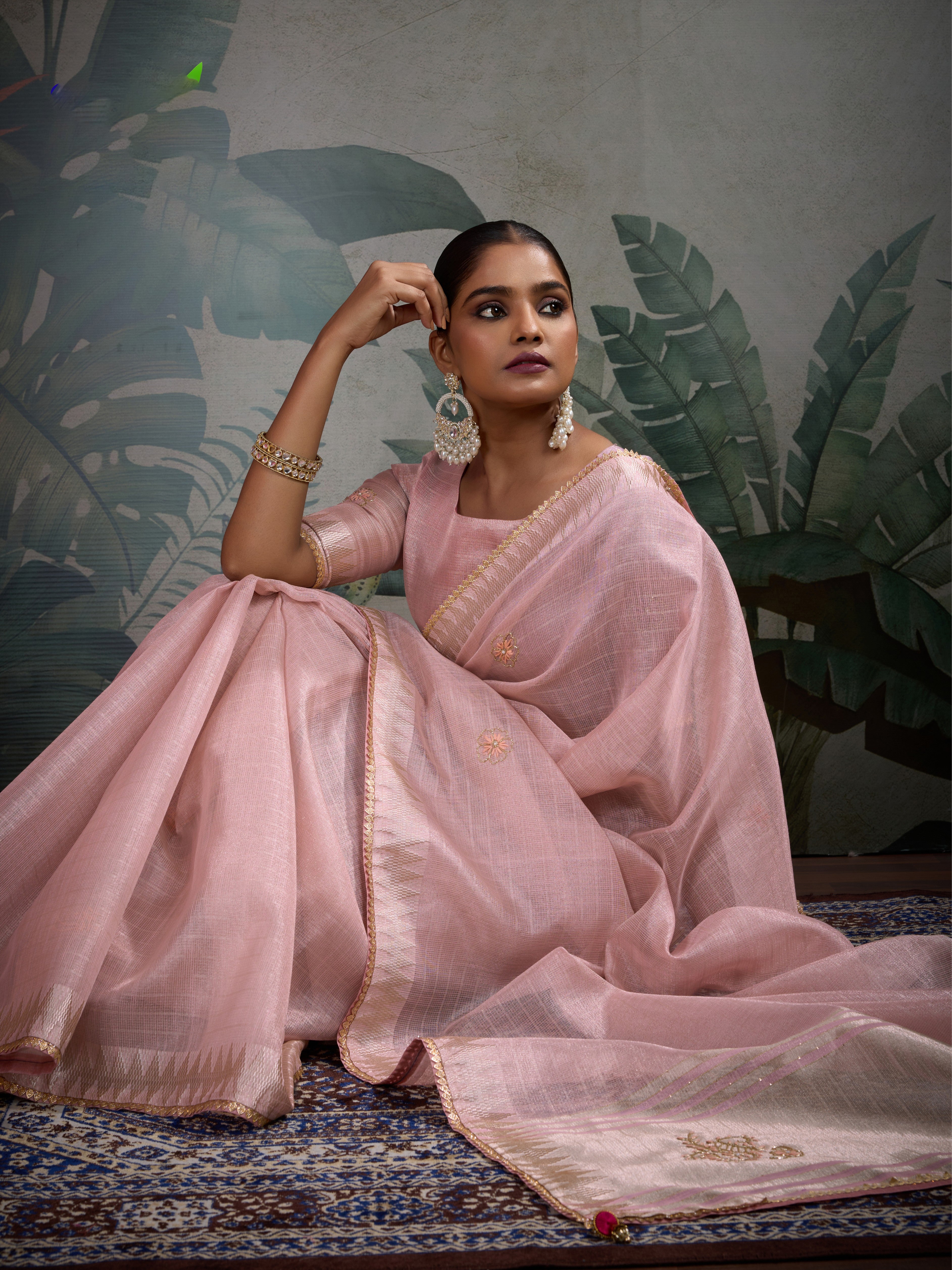 Make the heads turn whenever you costume up in such a stunning light pink Linen Tissue traditional saree.. The border and khatli hand work butta seems chic and great for any party. Comes with matching blouse. (Slight variation in color, fabric & work is possible. Model images are only representative.)