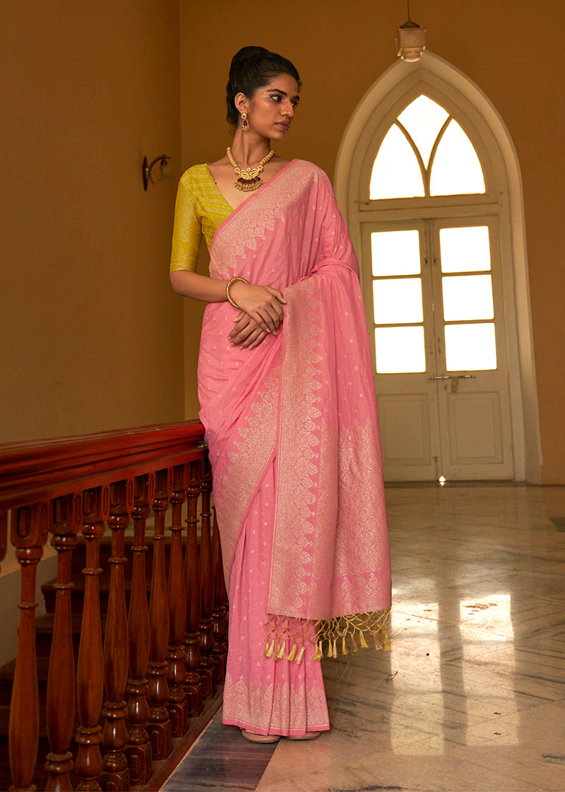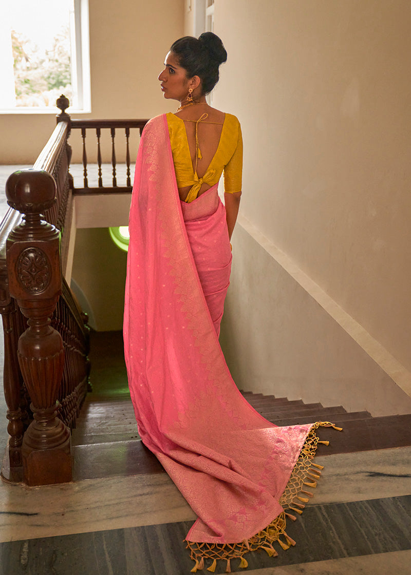 Monjolika Fashion presents drape yourself in timeless elegance with this stunning pink silk saree, adorned with exquisite gold zari weaving. A perfect blend of tradition and luxury, ideal for weddings, festivals, and special occasions.
