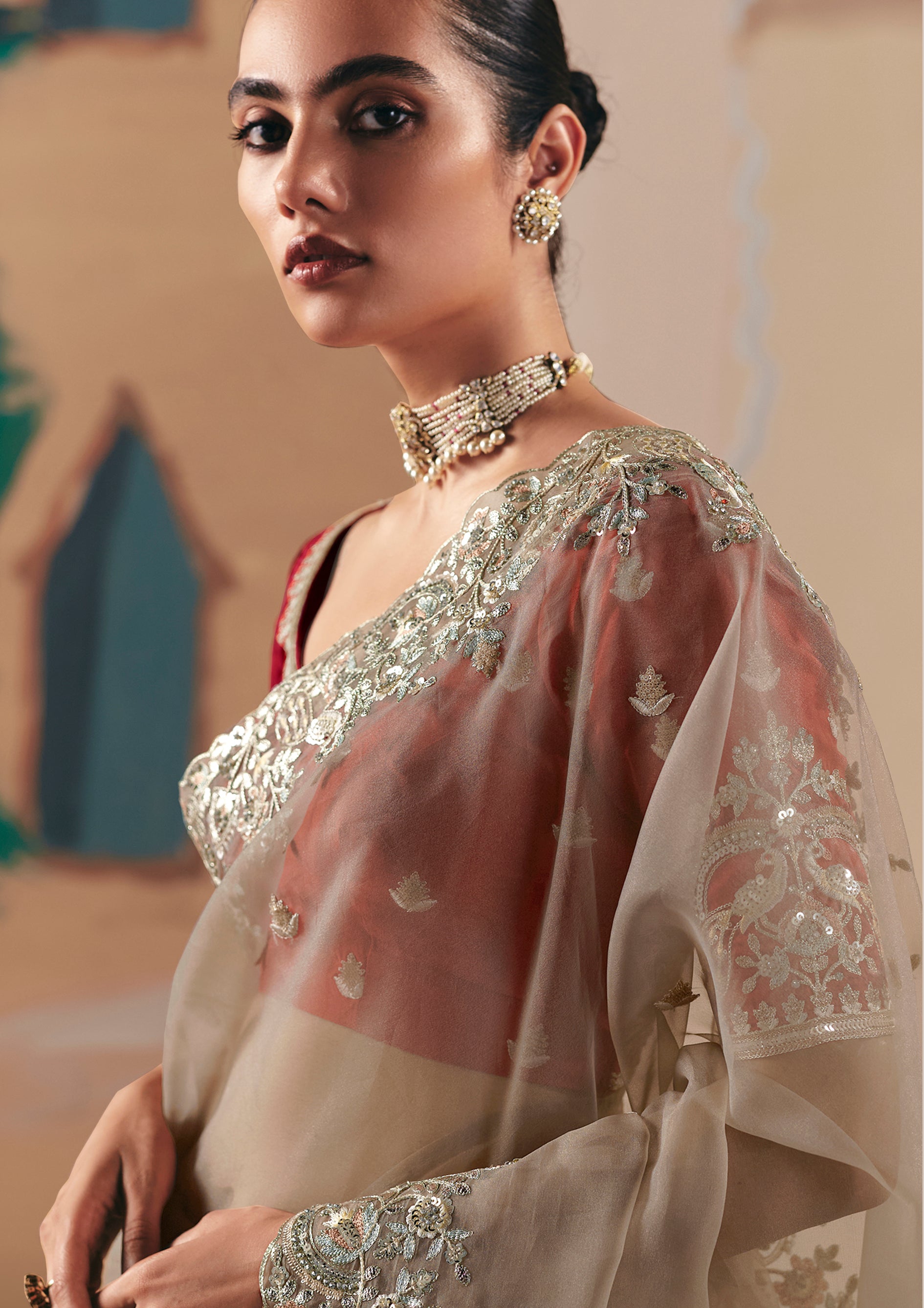 You are confident to make a powerful fashion statement with this Beige fancy fabric designer saree. The interesting cutwork, embroidered, sequins and zari work all through the attire is awe inspiring. Comes with unstiched blouse. (Slight variation in color, fabric & work is possible. Model images are only representative.)