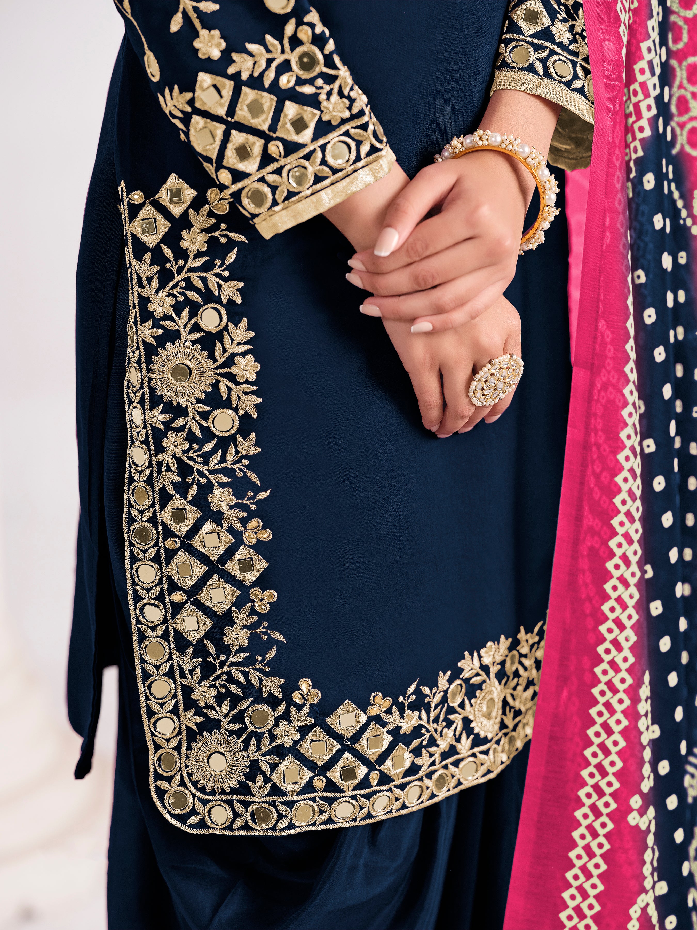 Fashion and trend could be at the peak of your elegance the moment you attire this Navy Blue chanderi silk trendy salwar kameez. The desirable embroidered, mirror and zari work a significant characteristic of this attire. Comes with matching bottom and dupatta. (Slight variation in color, fabric & work is possible. Model images are only representative.)