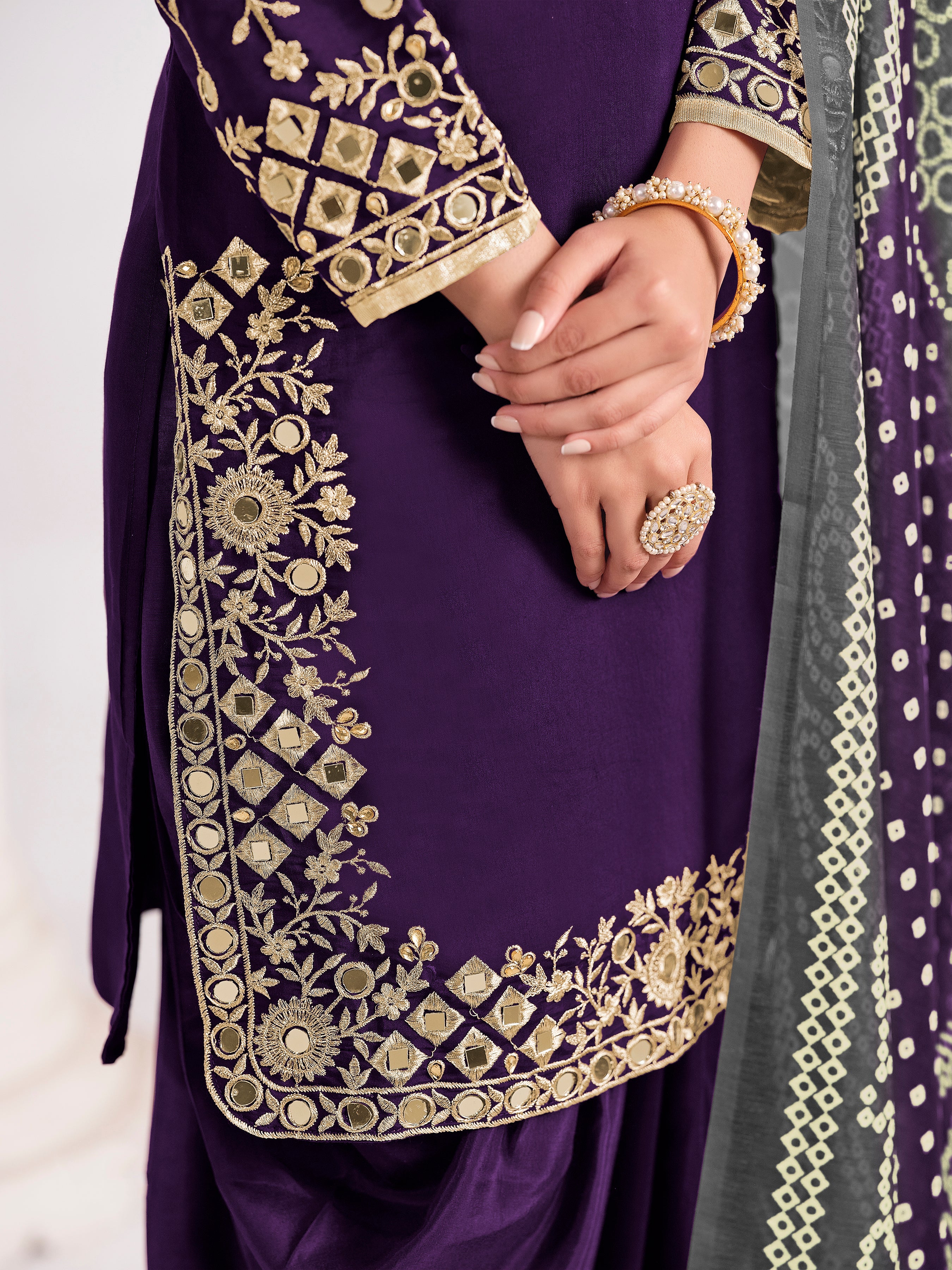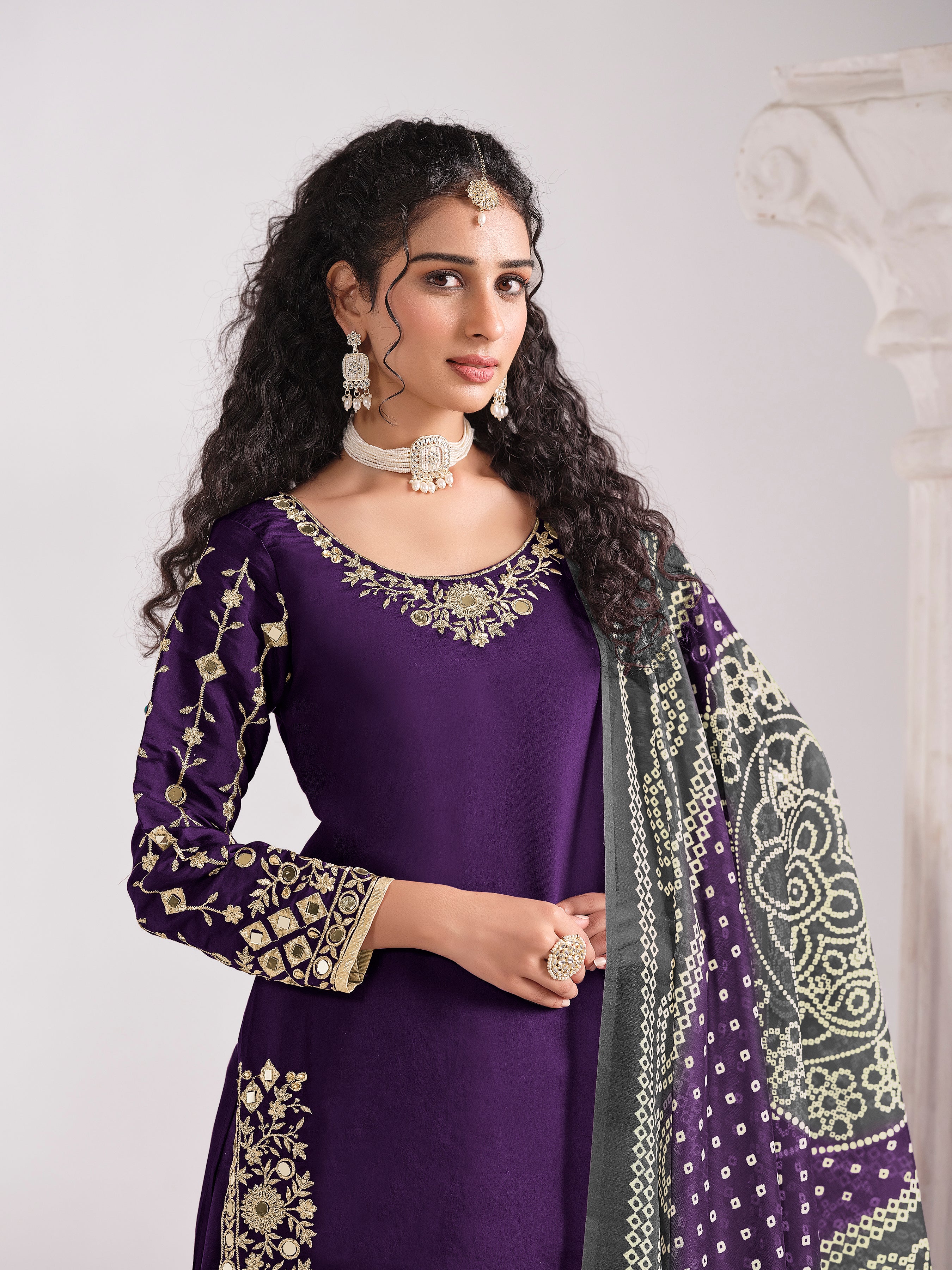 Fashion and trend could be at the peak of your elegance the moment you attire this Purple chanderi silk trendy salwar kameez. The desirable embroidered, mirror and zari work a significant characteristic of this attire. Comes with matching bottom and dupatta. (Slight variation in color, fabric & work is possible. Model images are only representative.)