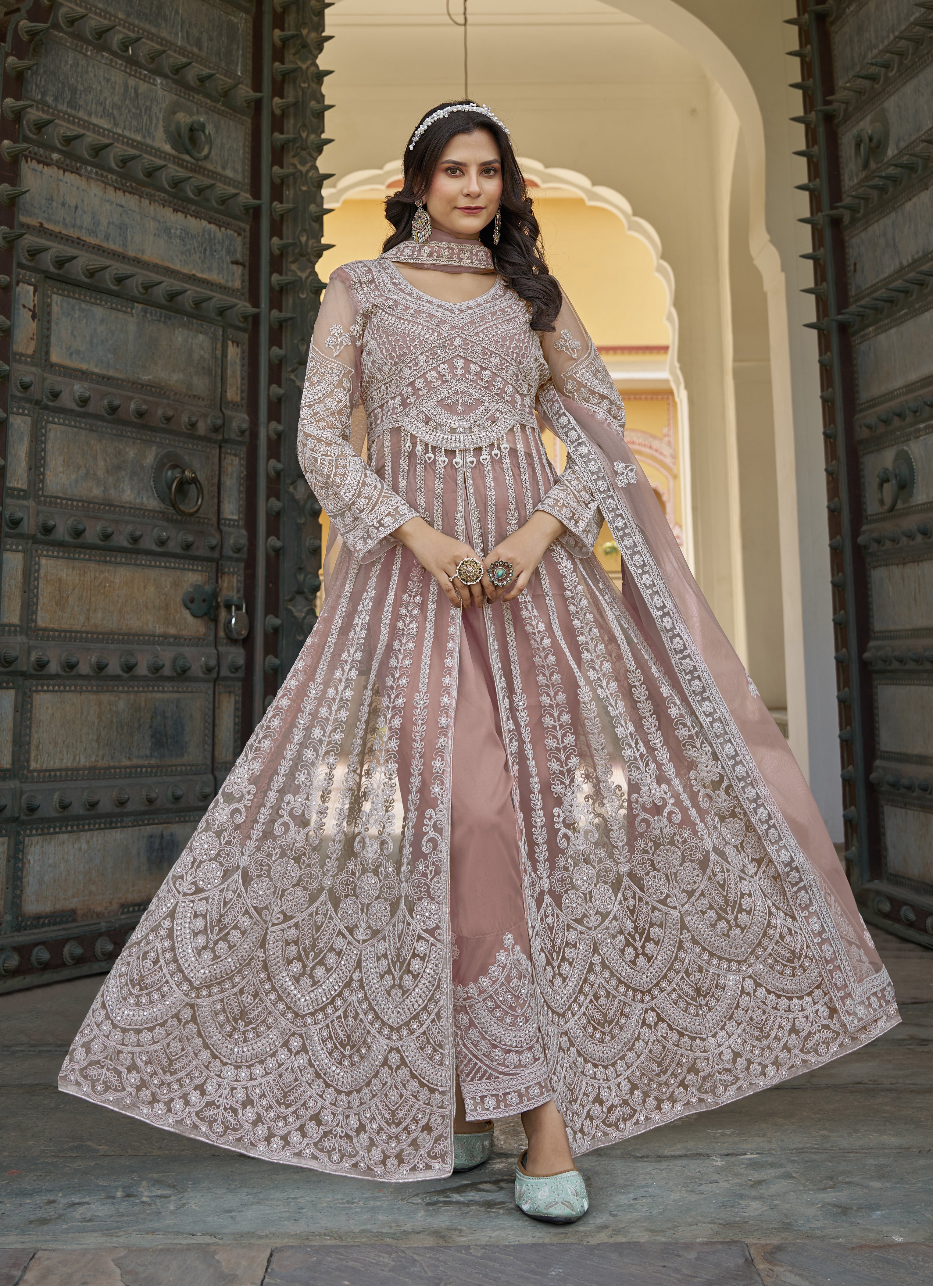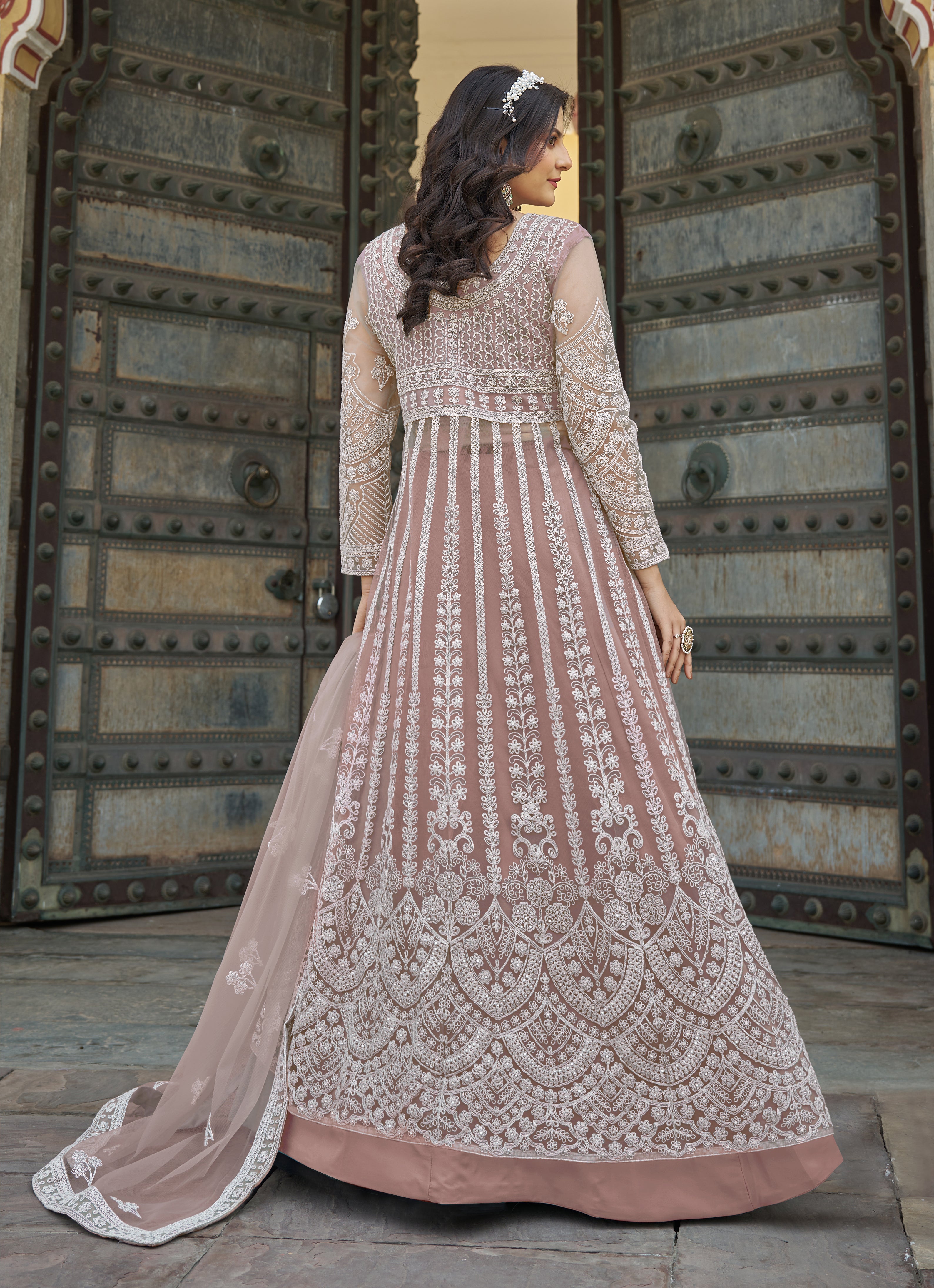 This Peach net designer salwar suit is including the appealing glamorous showing the feel of cute and graceful. The ethnic embroidered and stone work over a attire adds a sign of splendor statement for the look. Comes with matching bottom and dupatta. Note:- Bottom comes unstiched you can stiched bottom as per your requirement skirt or pent. (Slight variation in color, fabric & work is possible. Model images are only representative.)