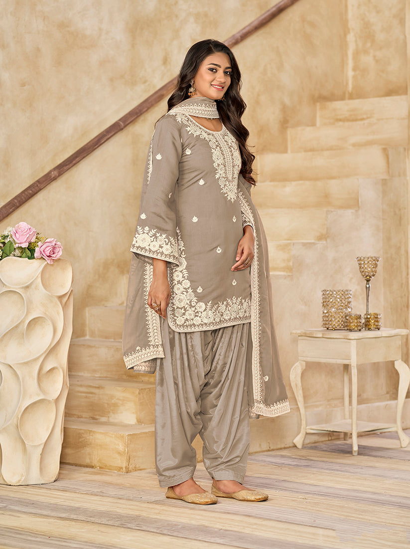 Appear stunningly beautiful in such a Grey Roman silk patiala salwar kameez. The ethnic embroidered work to the attire adds a sign of attractiveness statement with your look. Comes with matching bottom and dupatta. (Slight variation in color, fabric & work is possible. Model images are only representative.)