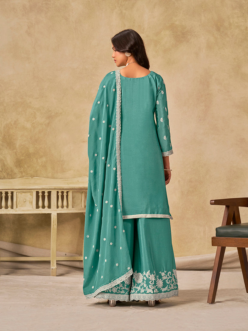 Add grace and charm to your appearance in this Turquoise chinon and silk palazzo salwar suit. The ethnic embroidered work to the dress adds a sign of beauty statement to your look. Comes with matching bottom and dupatta. (Slight variation in color, fabric & work is possible. Model images are only representative.)