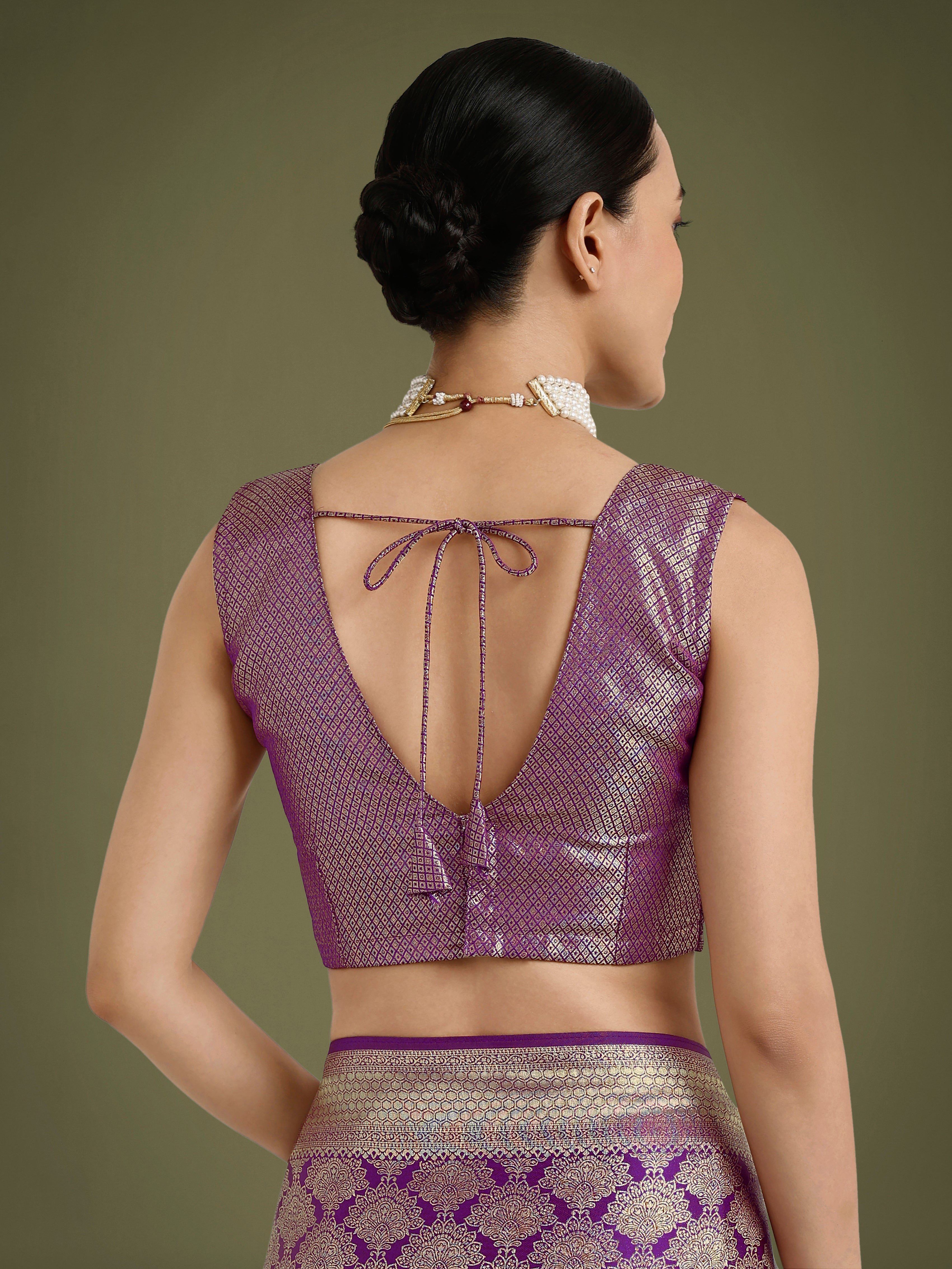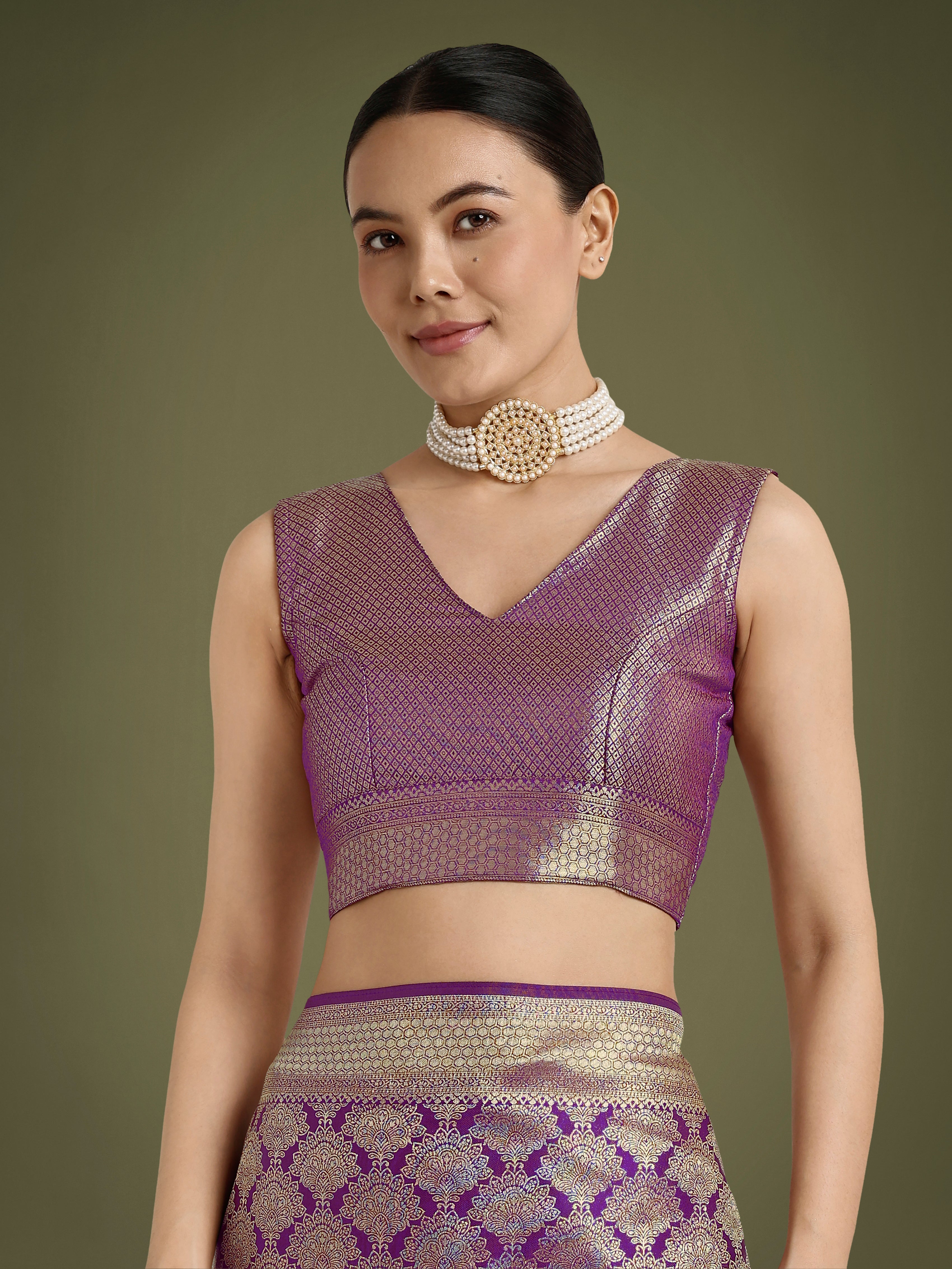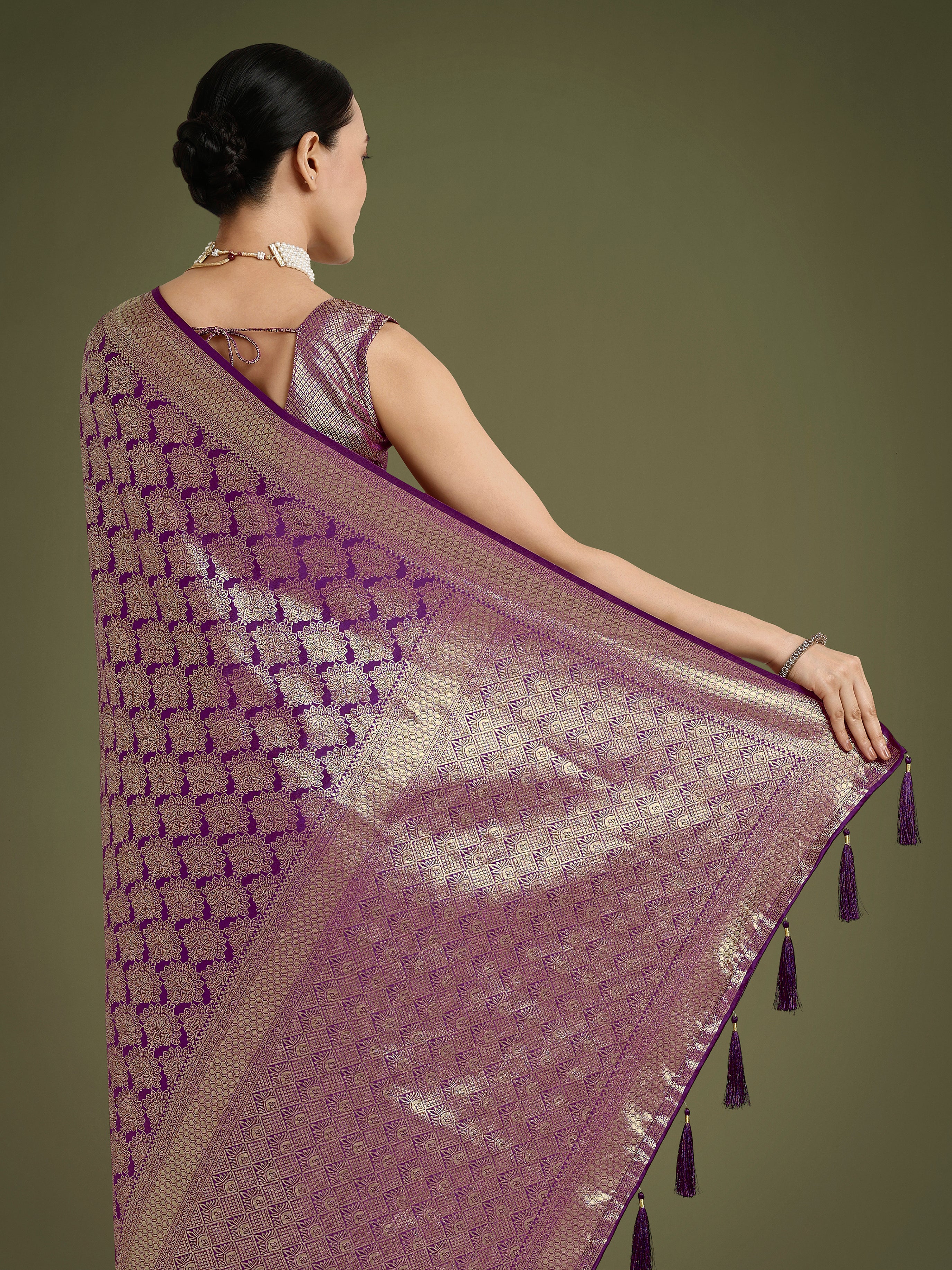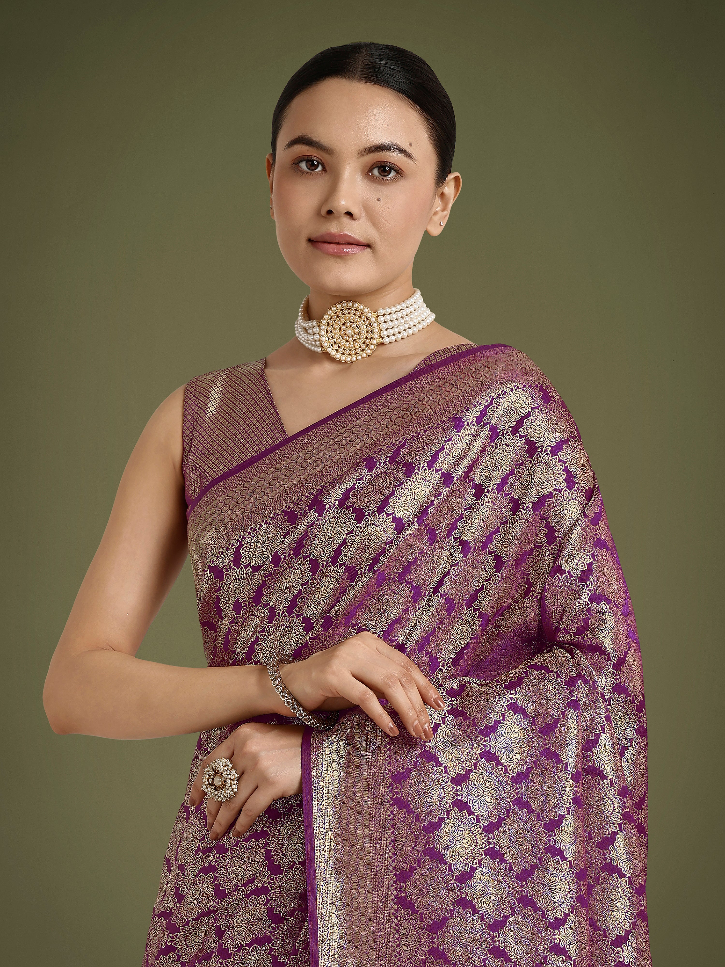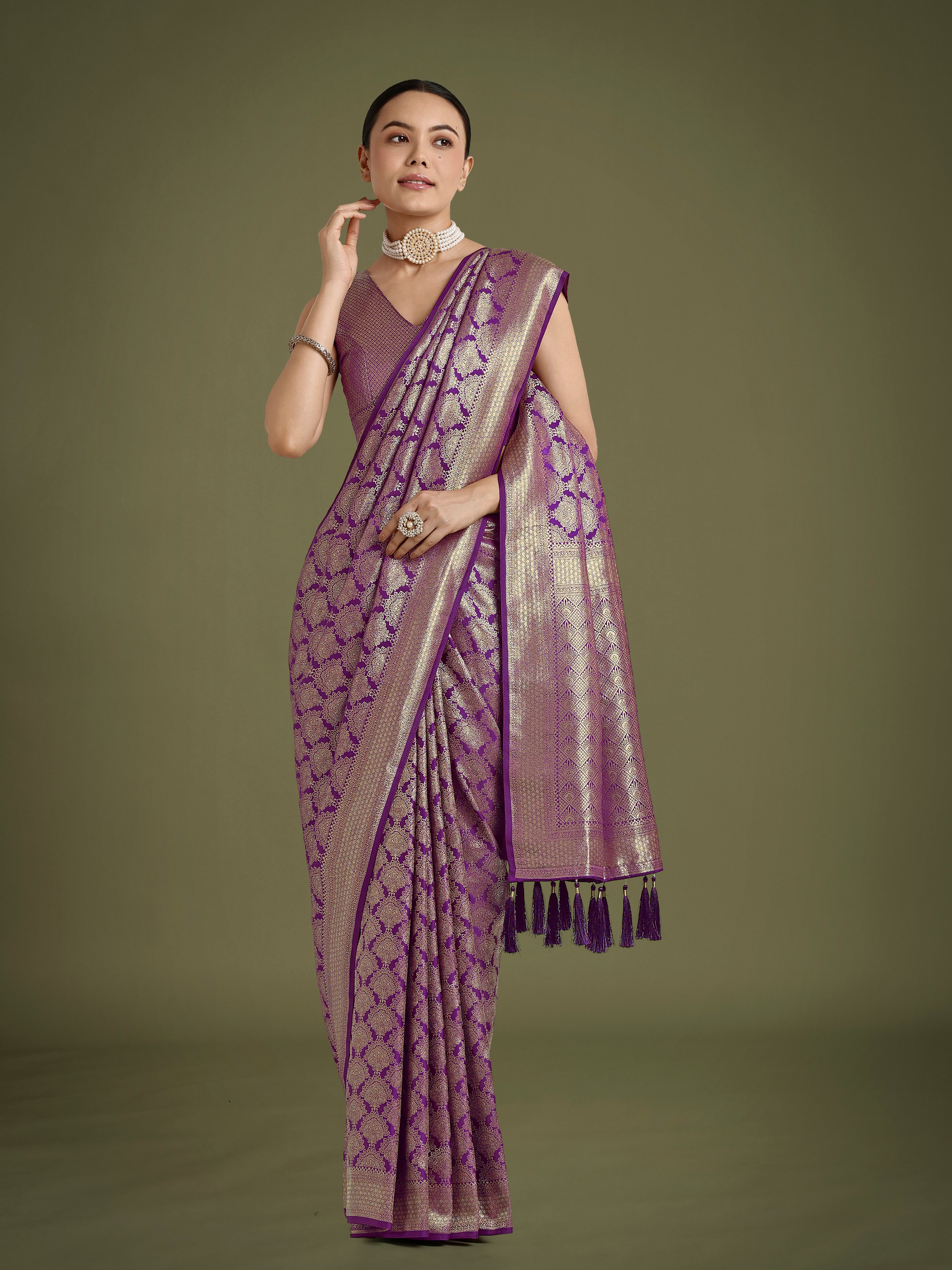 Grab the second look in this elegant attire for this season. We unfurl our the intricacy and exclusivity of our creations highlighted in this lovely Purple banarasi silk designer saree. Beautified and stylized ,fancy,and zari work to give you an attractive look. Comes with matching blouse. (Slight variation in color, fabric & work is possible. Model images are only representative.)