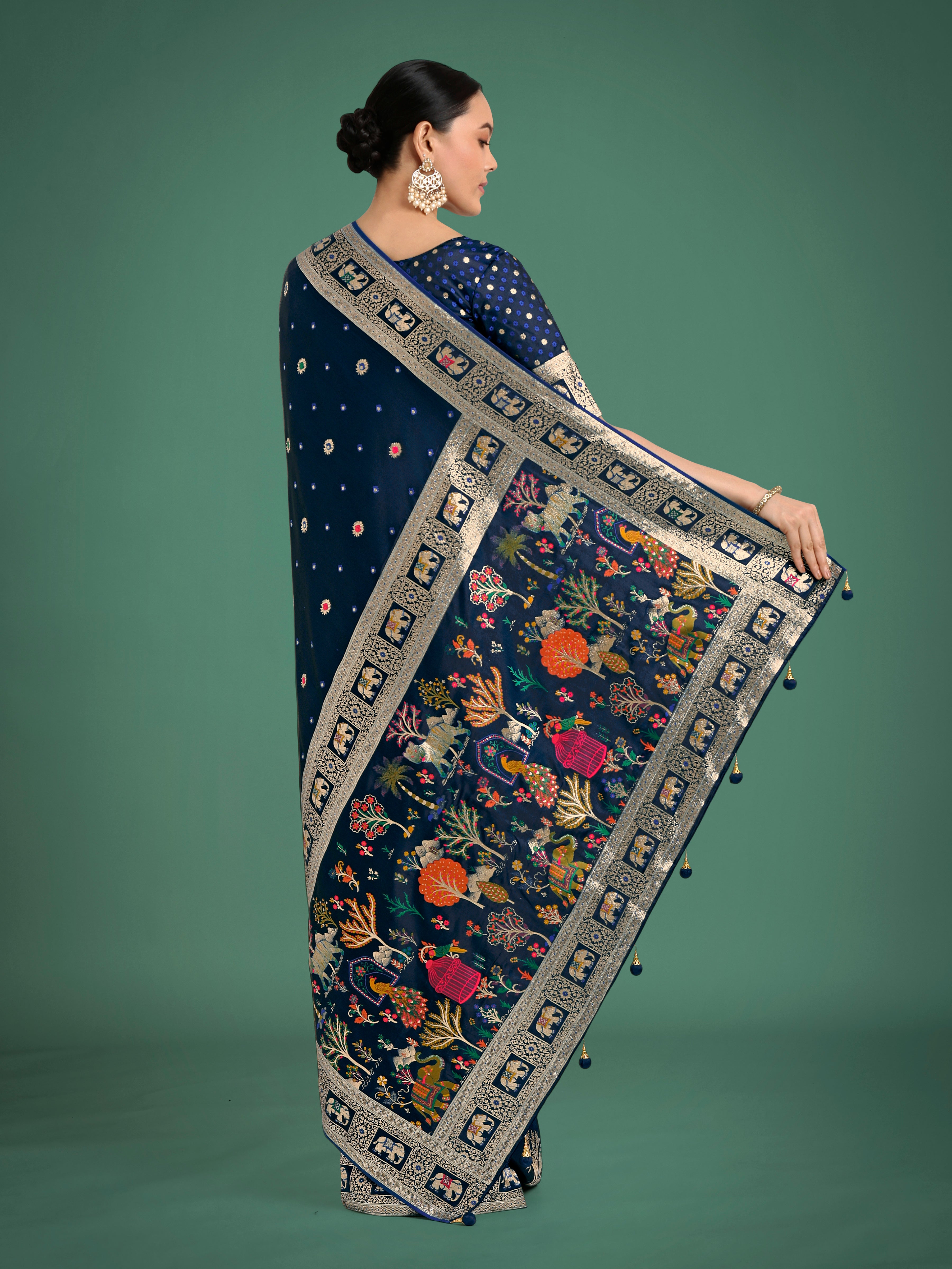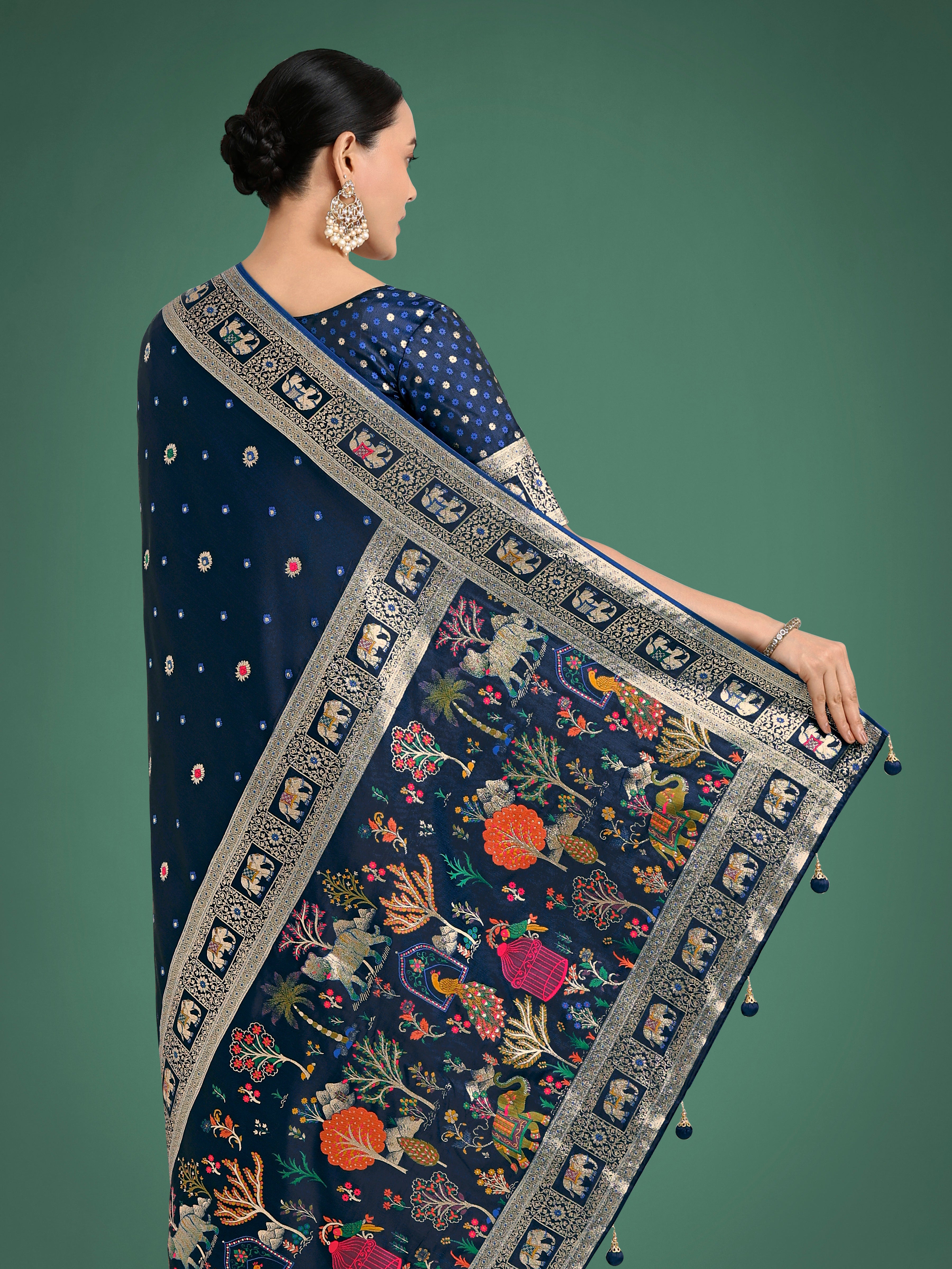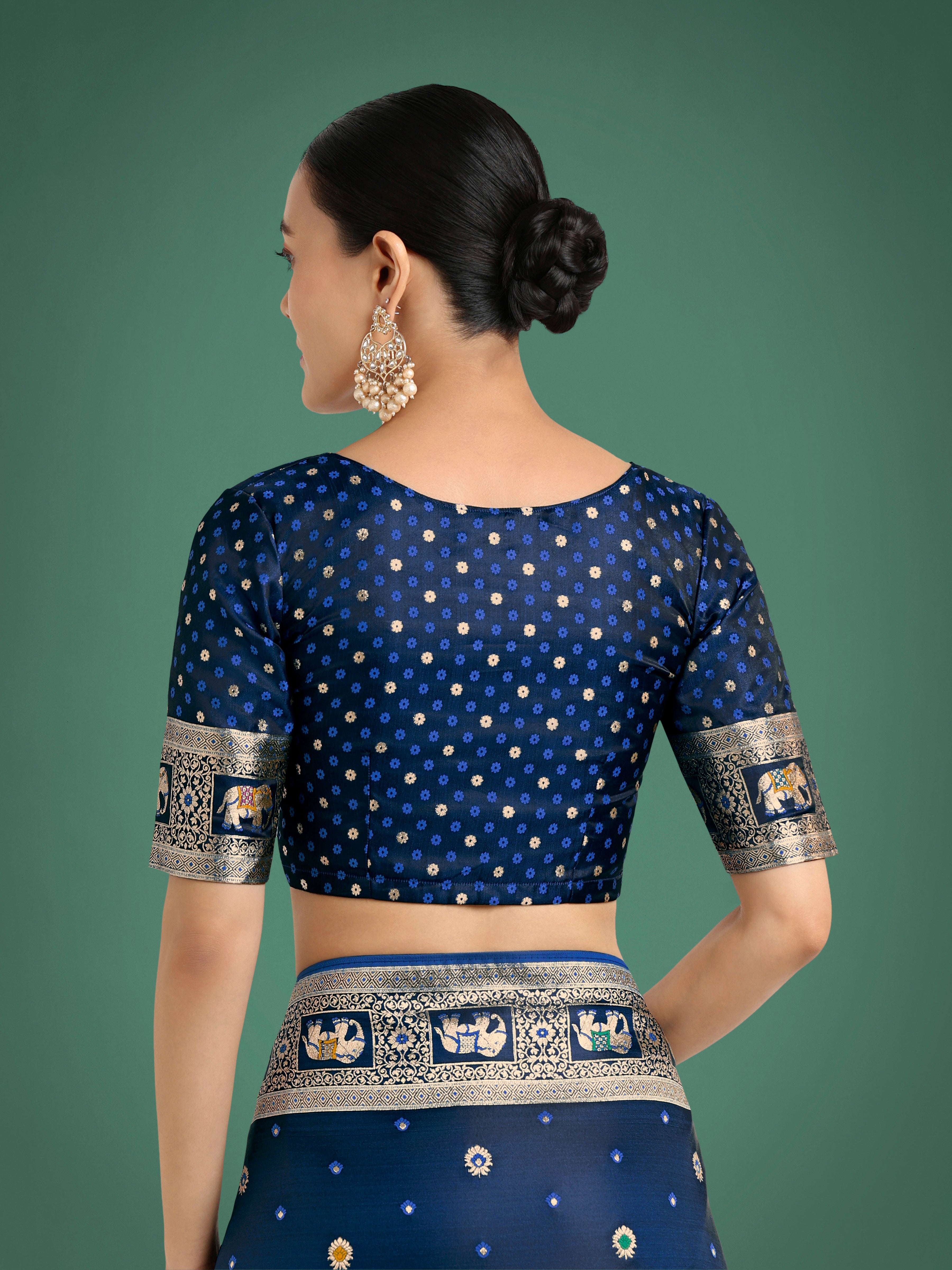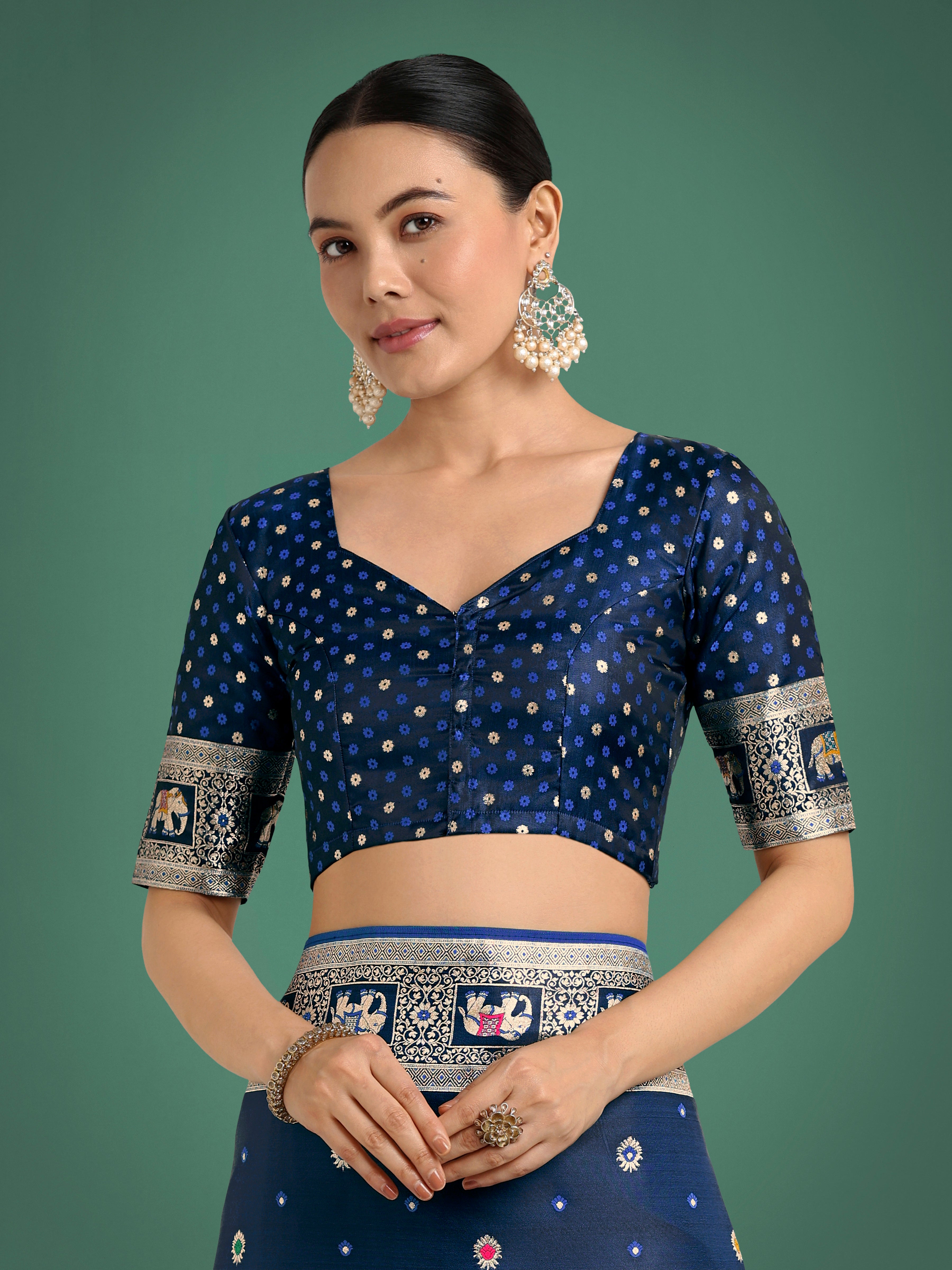 Rich look attire to give your a right choice for any party or function. Include your self of the glamour of a season with this elegant Blue banarasi satin silk trendy saree. The appealing zari weaving work through the attire is awe inspiring. Comes with matching blouse. (Slight variation in color, fabric & work is possible. Model images are only representative.)