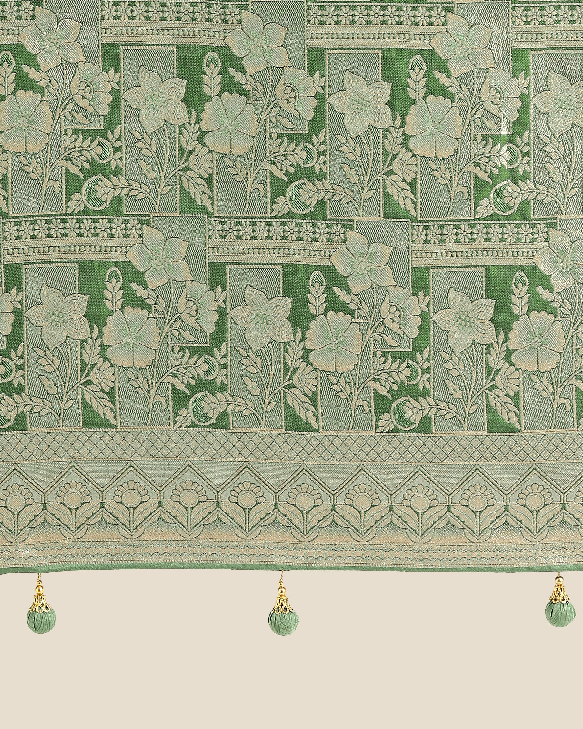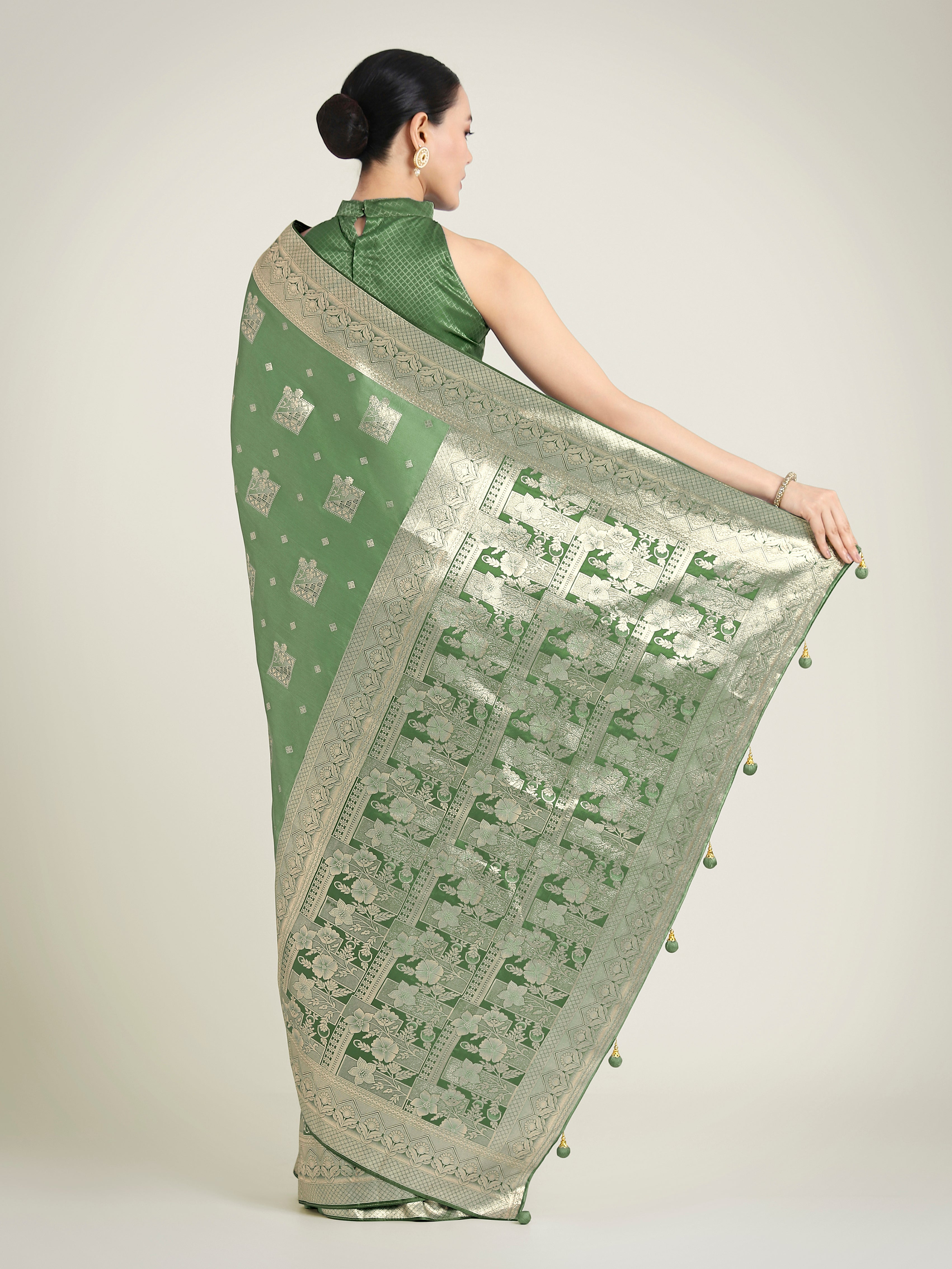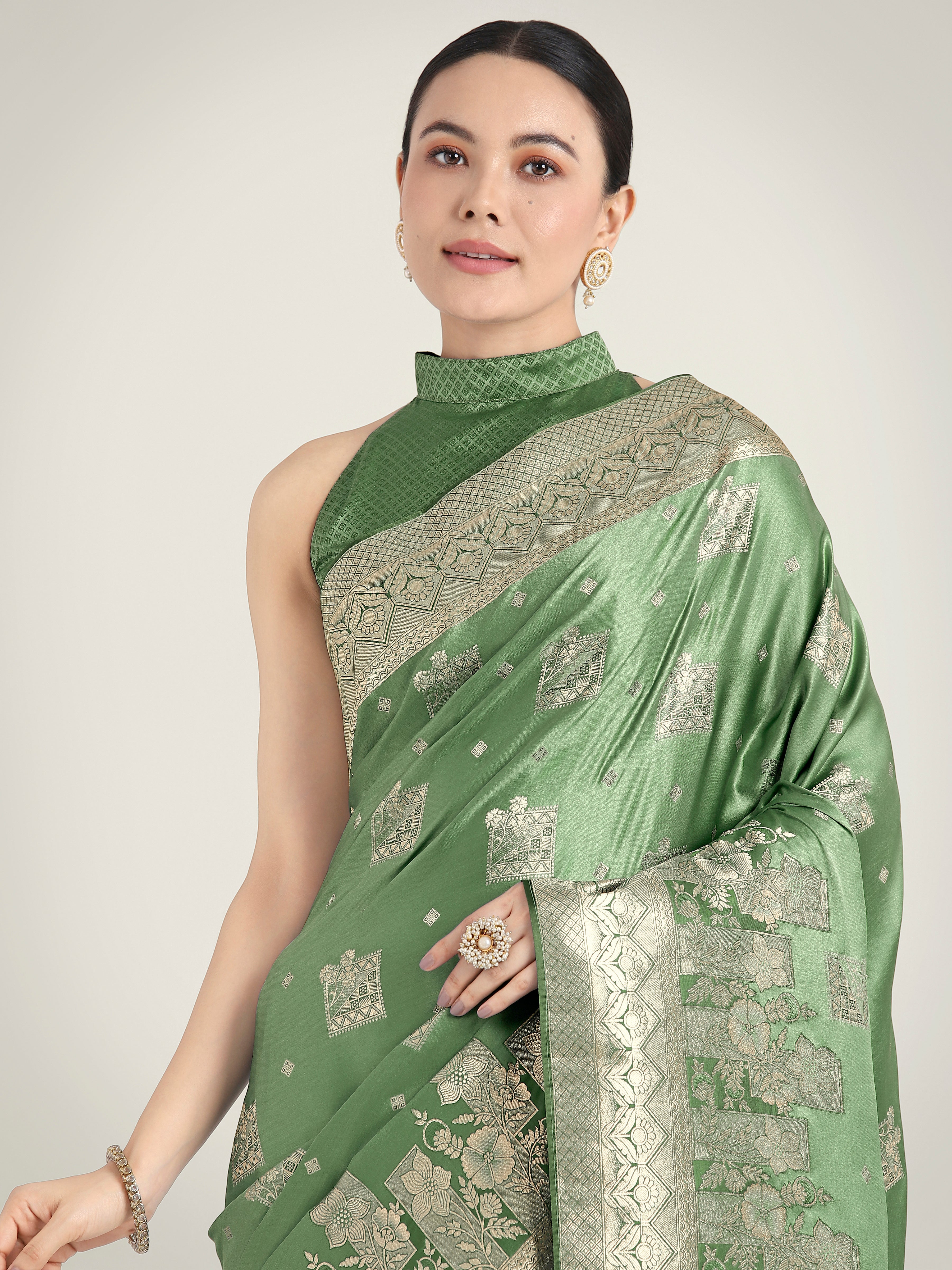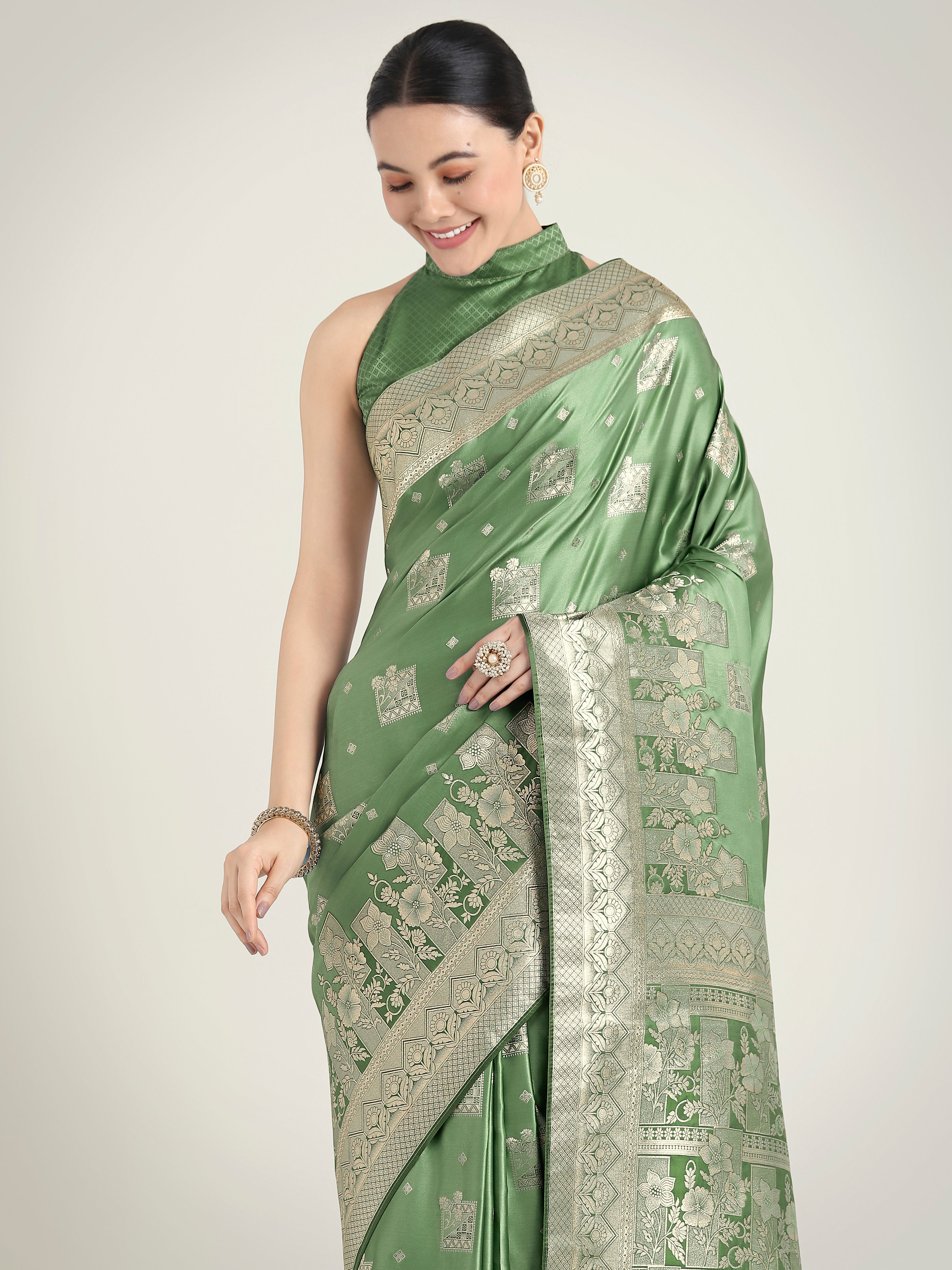 We have ensemble a symphony of enchanting piece to restyle your senses. Real beauty comes out from your dressing style with this Green Banarasi satin silk traditional saree. This attire is showing some really mesmerizing and innovative patterns with weaving work. Comes with matching blouse. (Slight variation in color, fabric & work is possible. Model images are only representative.)