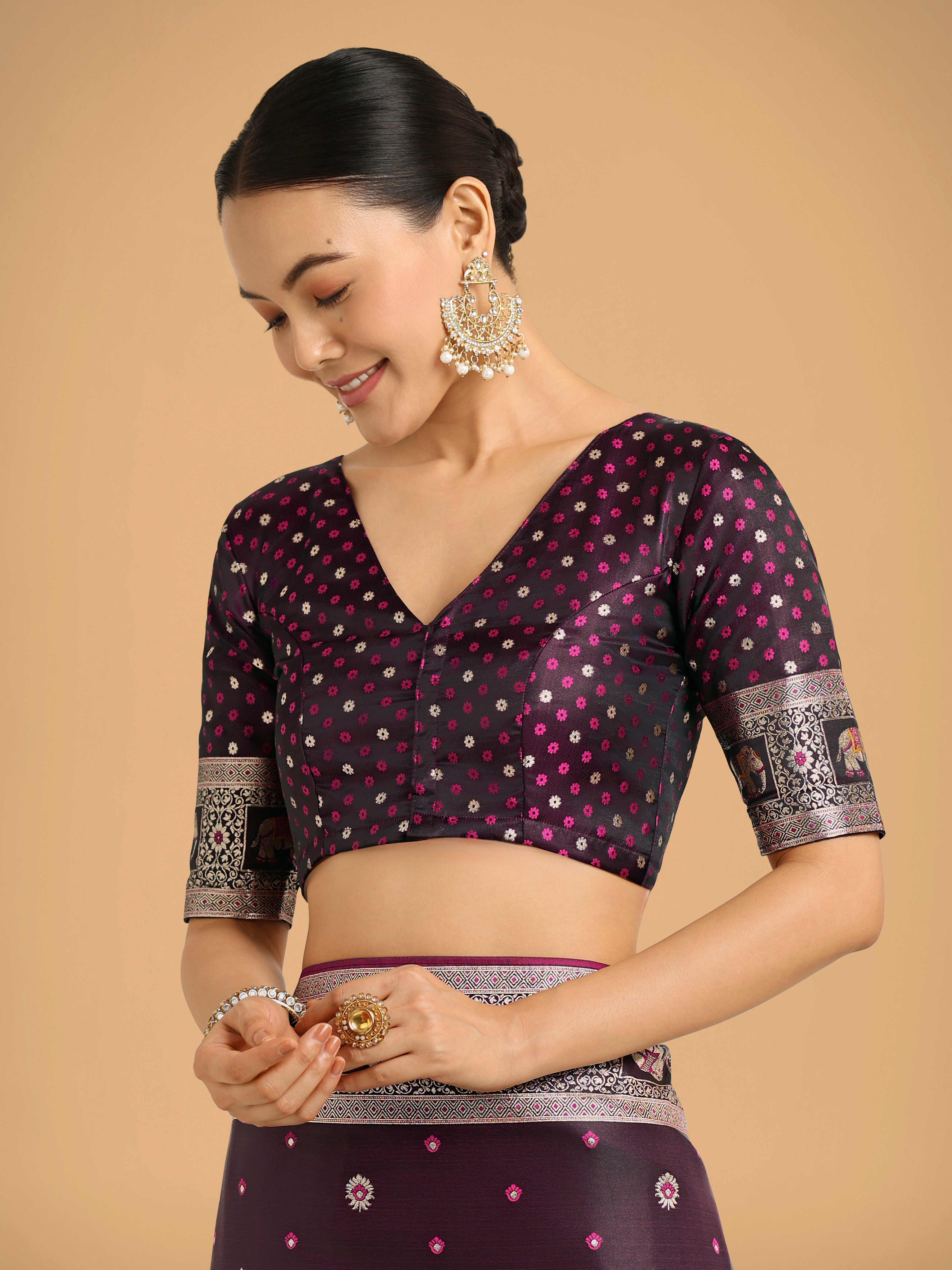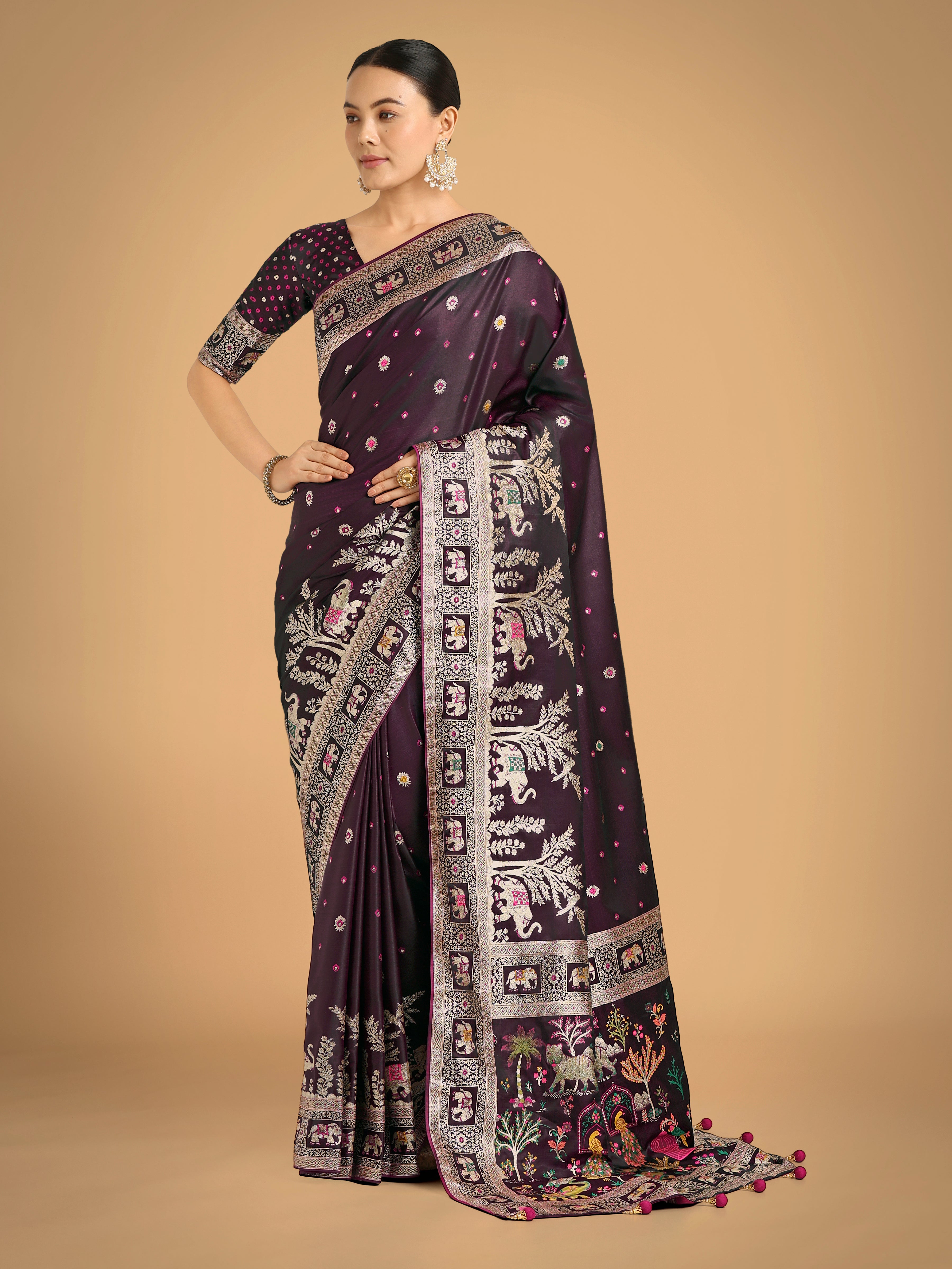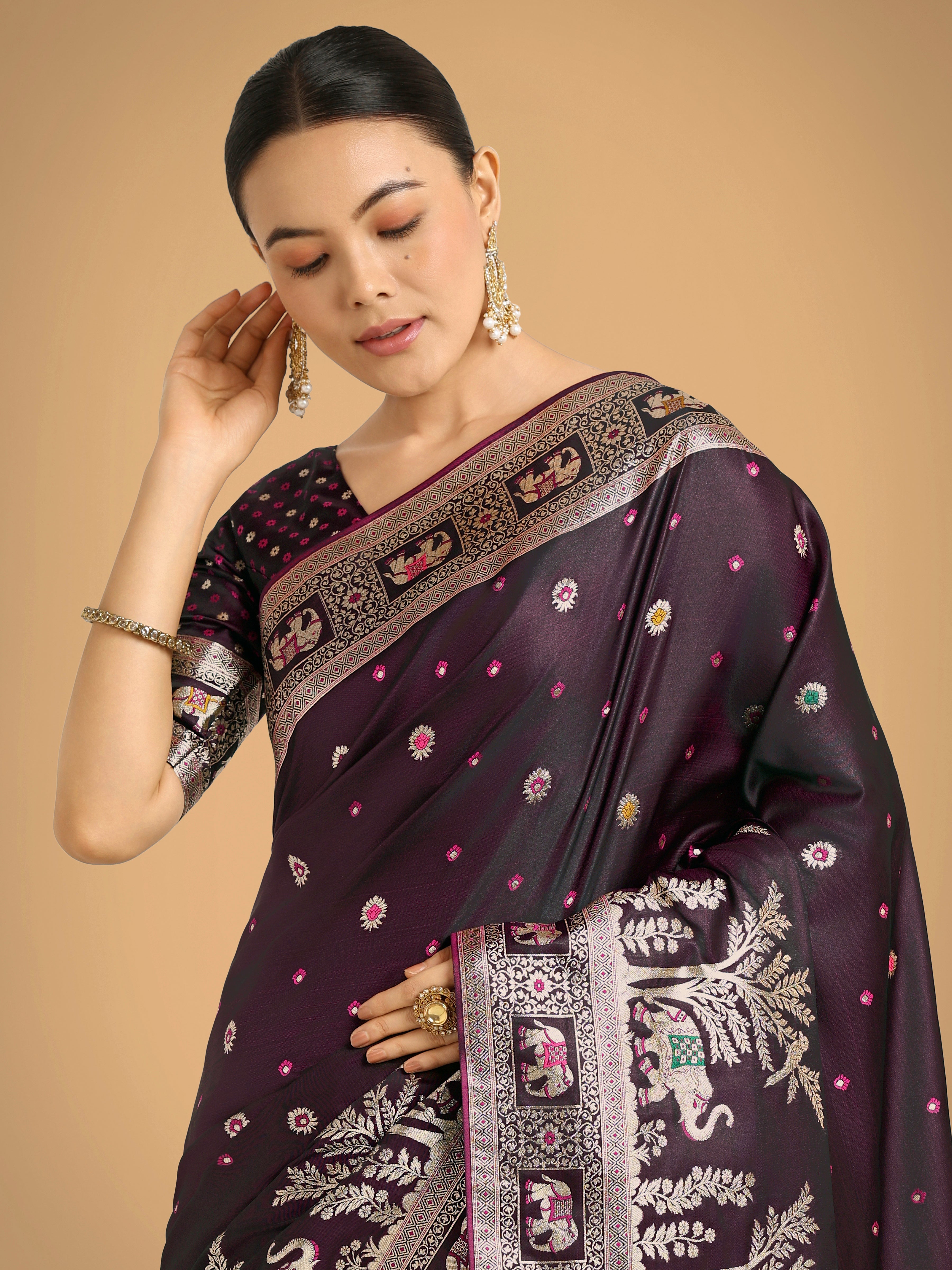Rich look attire to give your a right choice for any party or function. Include your self of the glamour of a season with this elegant Wine banarasi satin silk trendy saree. The appealing zari weaving work through the attire is awe inspiring. Comes with matching blouse. (Slight variation in color, fabric & work is possible. Model images are only representative.)
