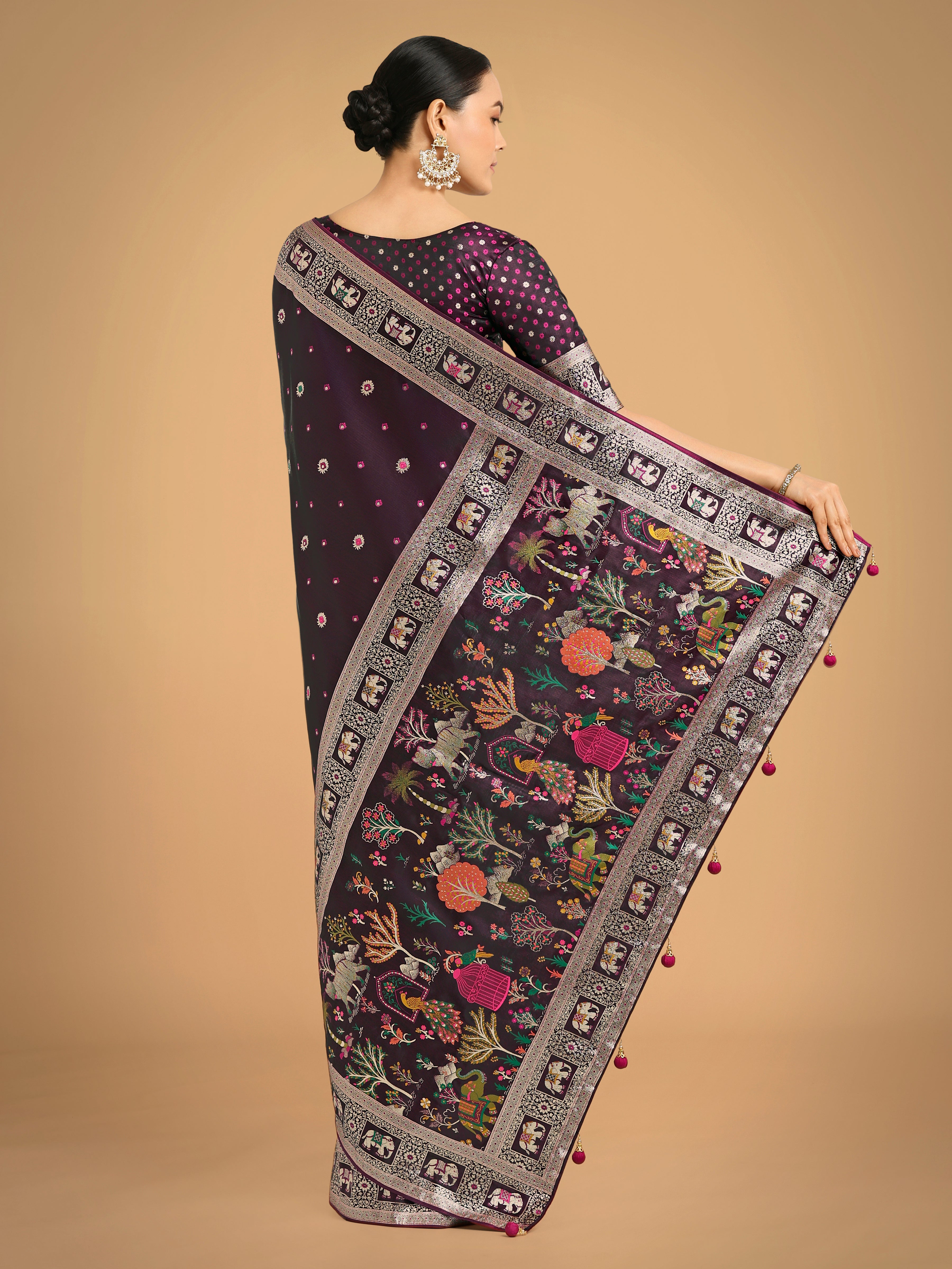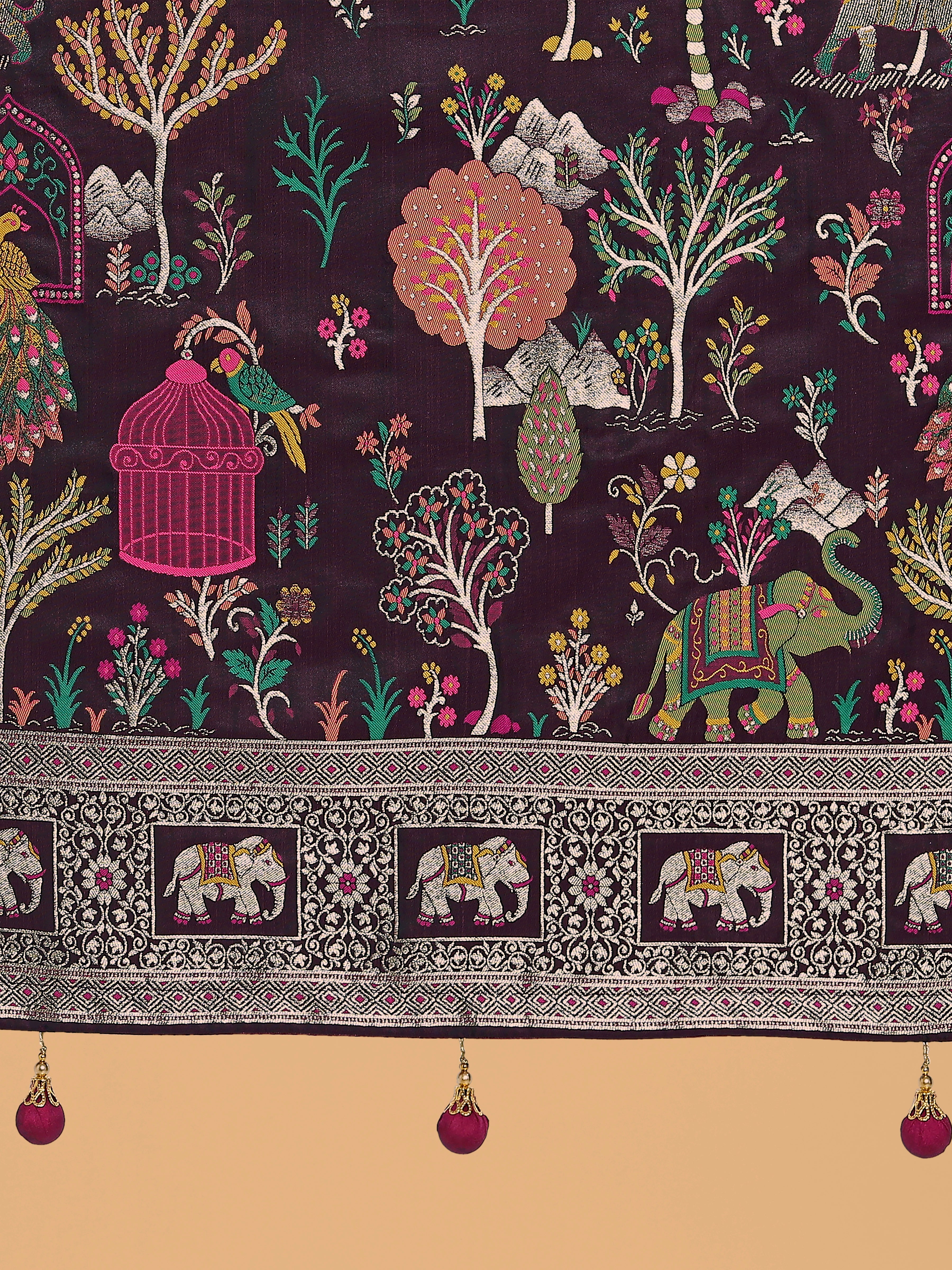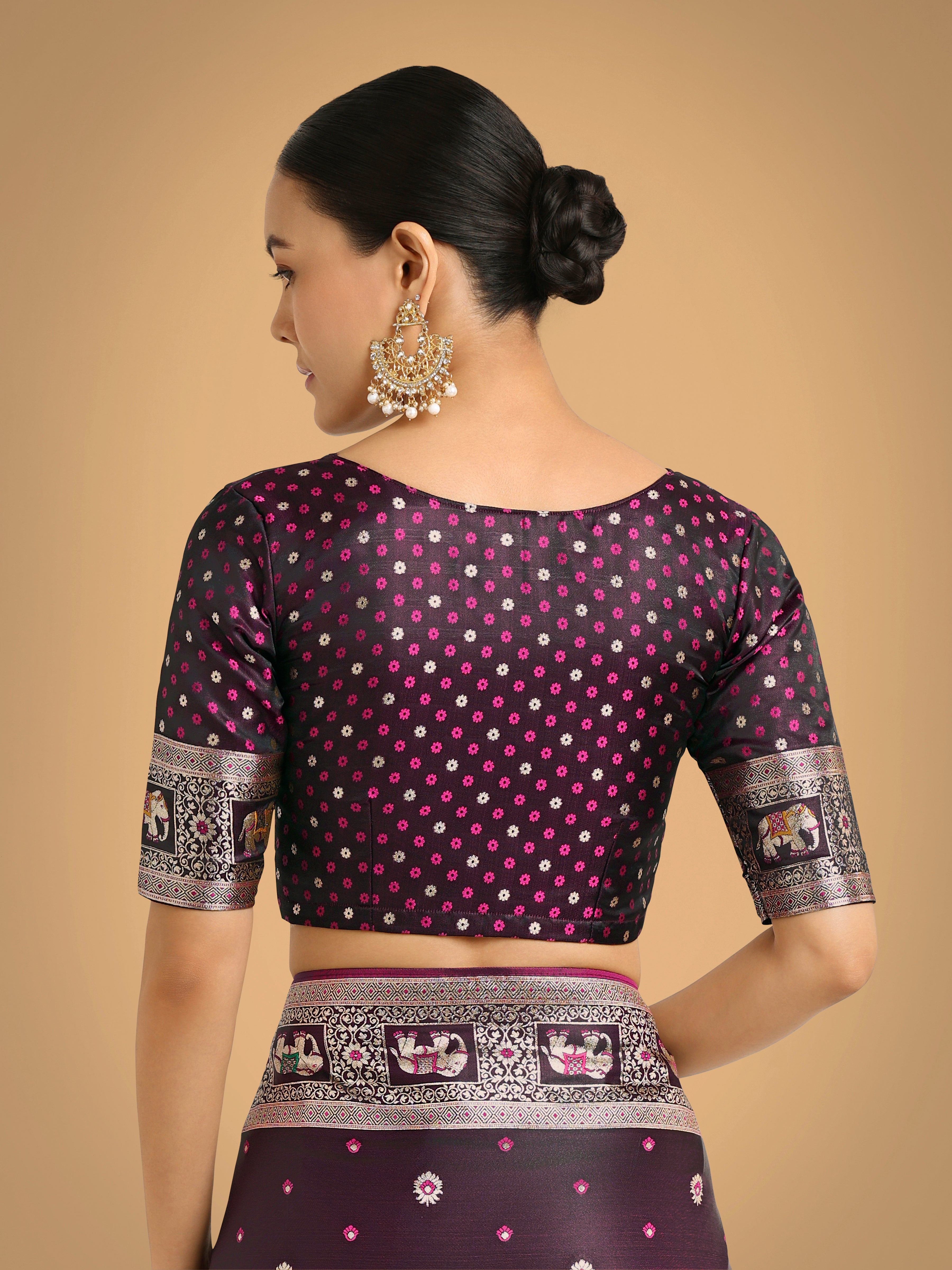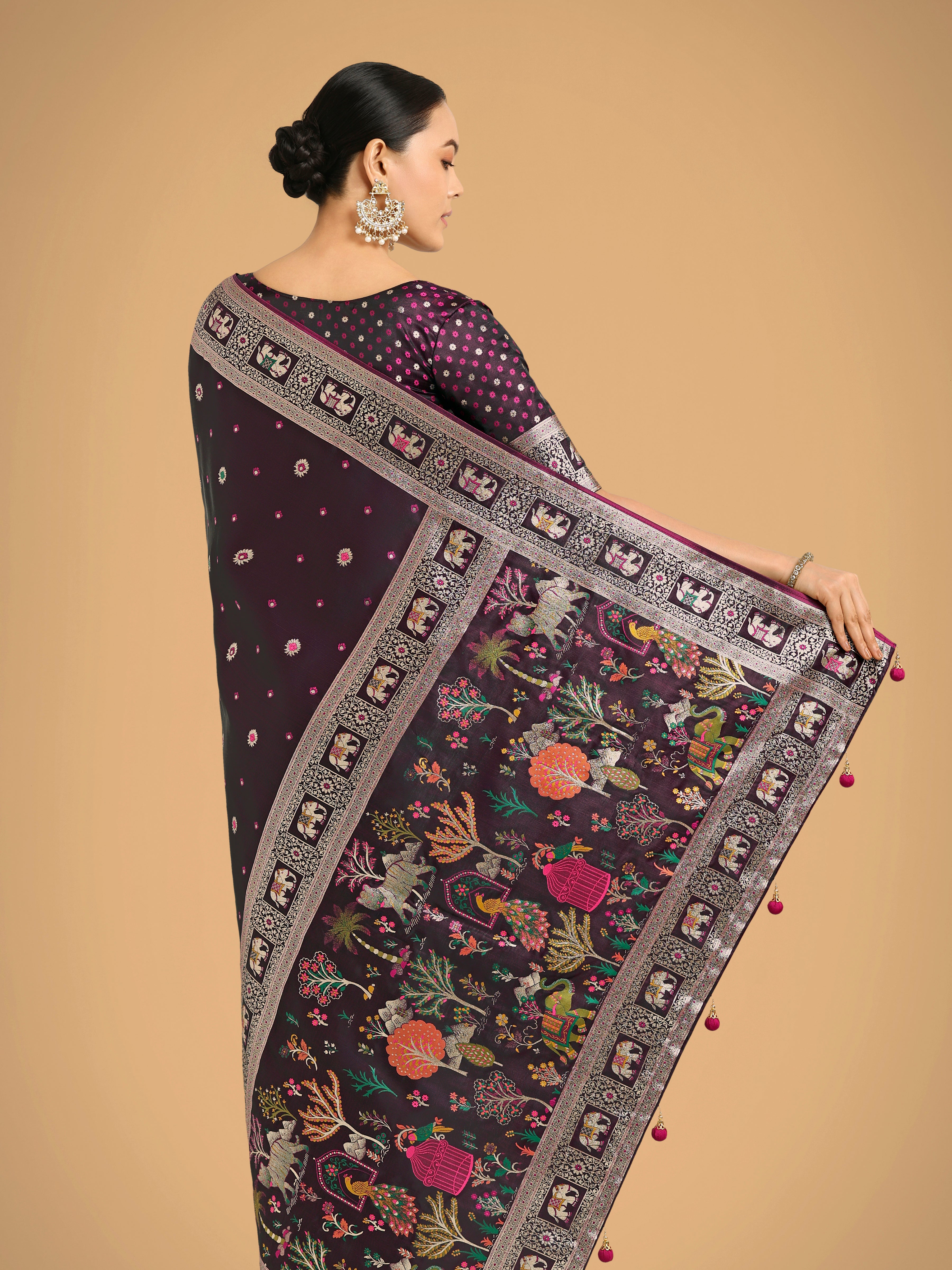 Rich look attire to give your a right choice for any party or function. Include your self of the glamour of a season with this elegant Wine banarasi satin silk trendy saree. The appealing zari weaving work through the attire is awe inspiring. Comes with matching blouse. (Slight variation in color, fabric & work is possible. Model images are only representative.)