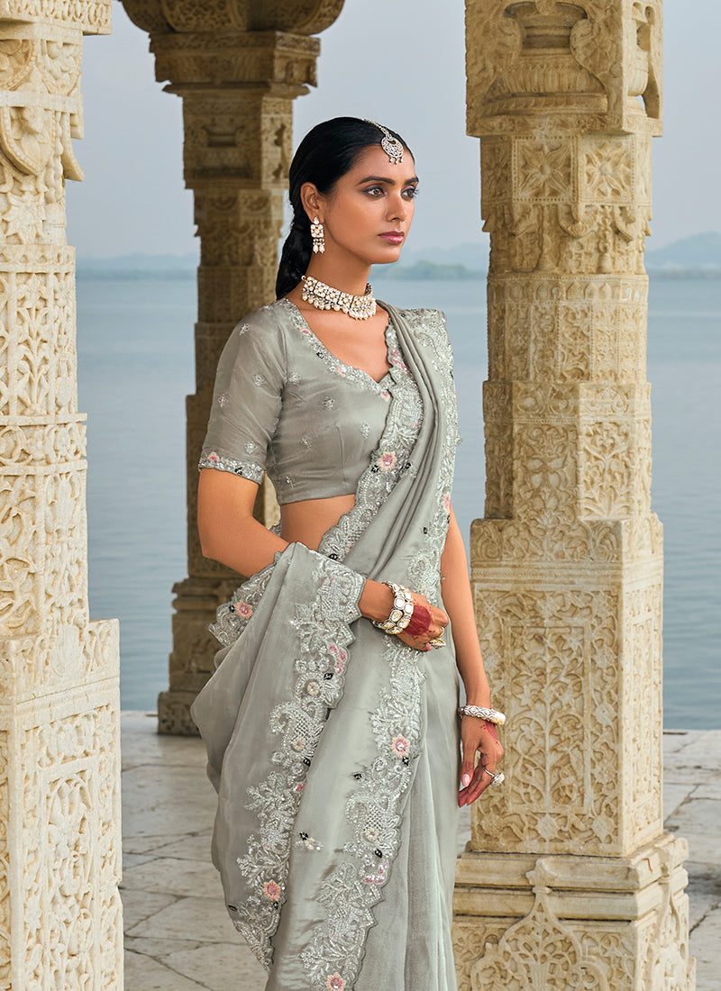 Monjolika Fashion Presents This brilliant array will make you the ultimate classic beauty at the next event you attend. Make the heads turn when you dress up in this charming grey banarasi silk classic saree. This attire is showing some really mesmerizing and innovative patterns embroidered with embroidered, moti, sequins, stone and thread work. Comes with matching blouse.