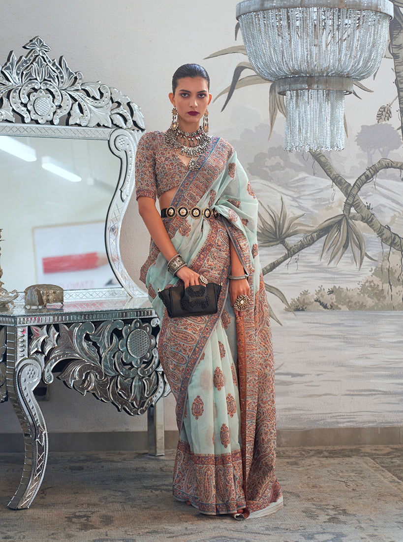 Monjolika Fashion bring out your inner queen with this lightweight silk saree, designed with a pashmina-like finish and adorned with intricate Kashmiri Zari detailing. A celebration of Indian textile artistry in every thread.