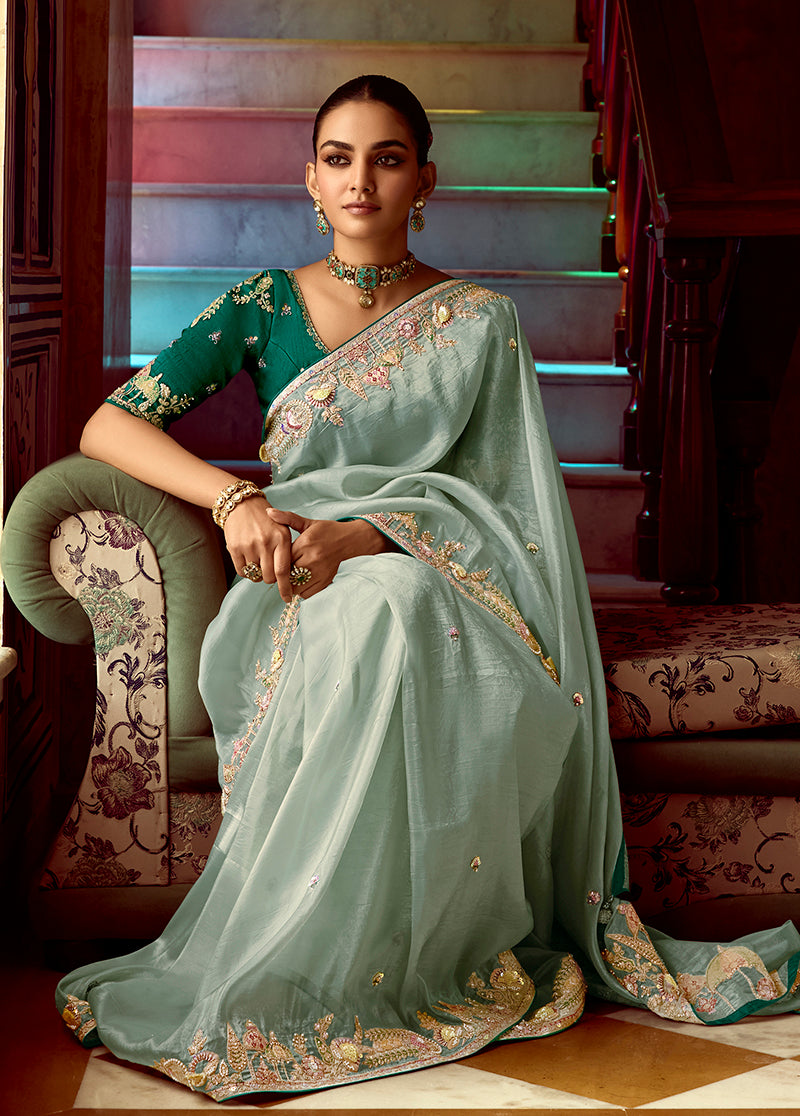 Monjolika Fashion Elevate your ethnic wardrobe with our exquisite Tissue Organza Silk Embroidered Saree, a perfect blend of elegance and modern charm. Crafted from premium quality tissue organza silk, this saree has a soft, sheer texture with a delicate shimmer that gracefully drapes around the body. Pair it with s classic earing will give you a modern look.