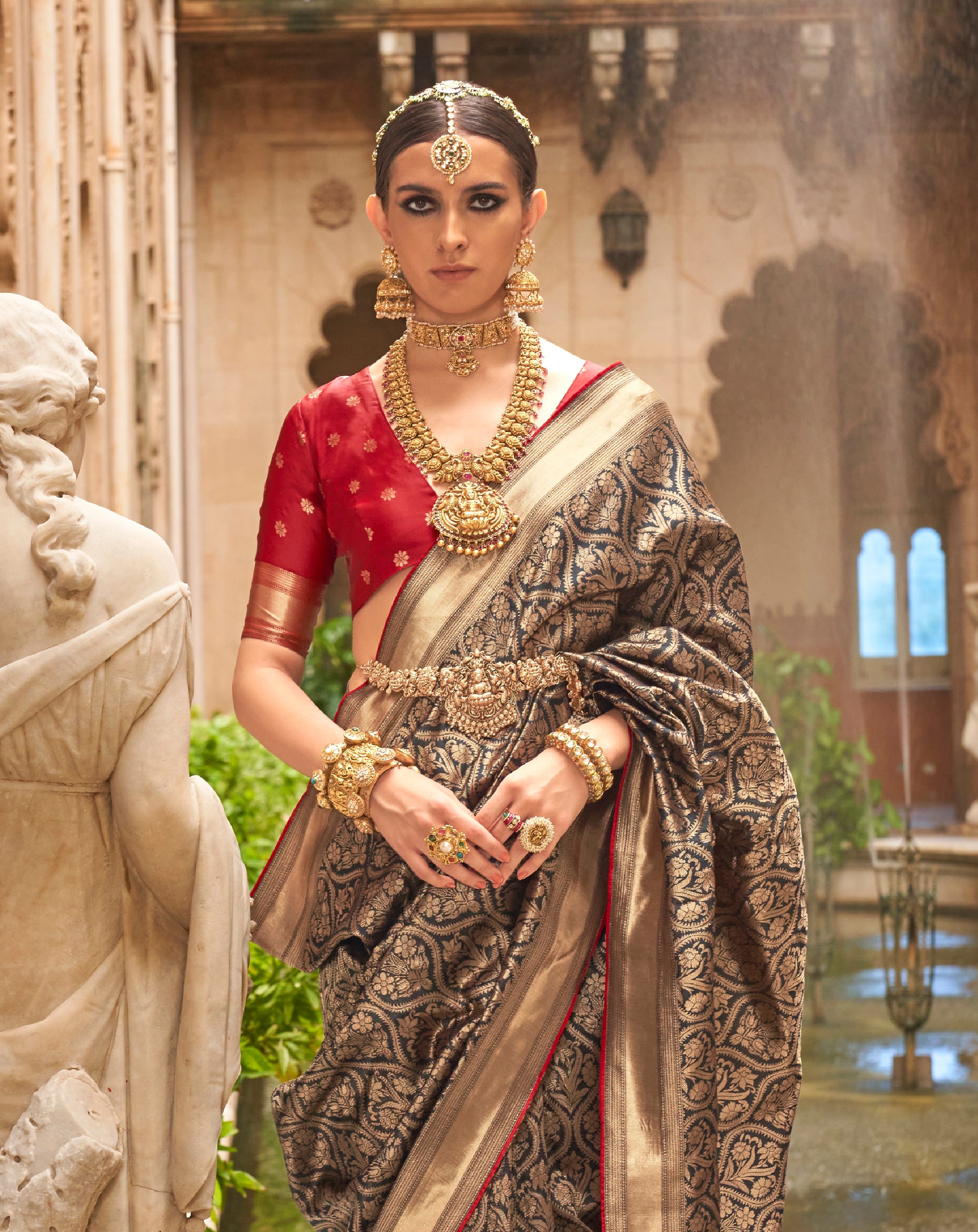 An Outstanding Black Banarasi Silk Trendy Saree Will Make You Appear Too Stylish And Graceful. The Wonderful Dress Creates A Dramatic Canvas With Astounding Jacquard Work And Weaving Work. Comes With Red Blouse. (Slight Variation In Color, Fabric & Work Is Possible. Model Images Are Only Representative.)