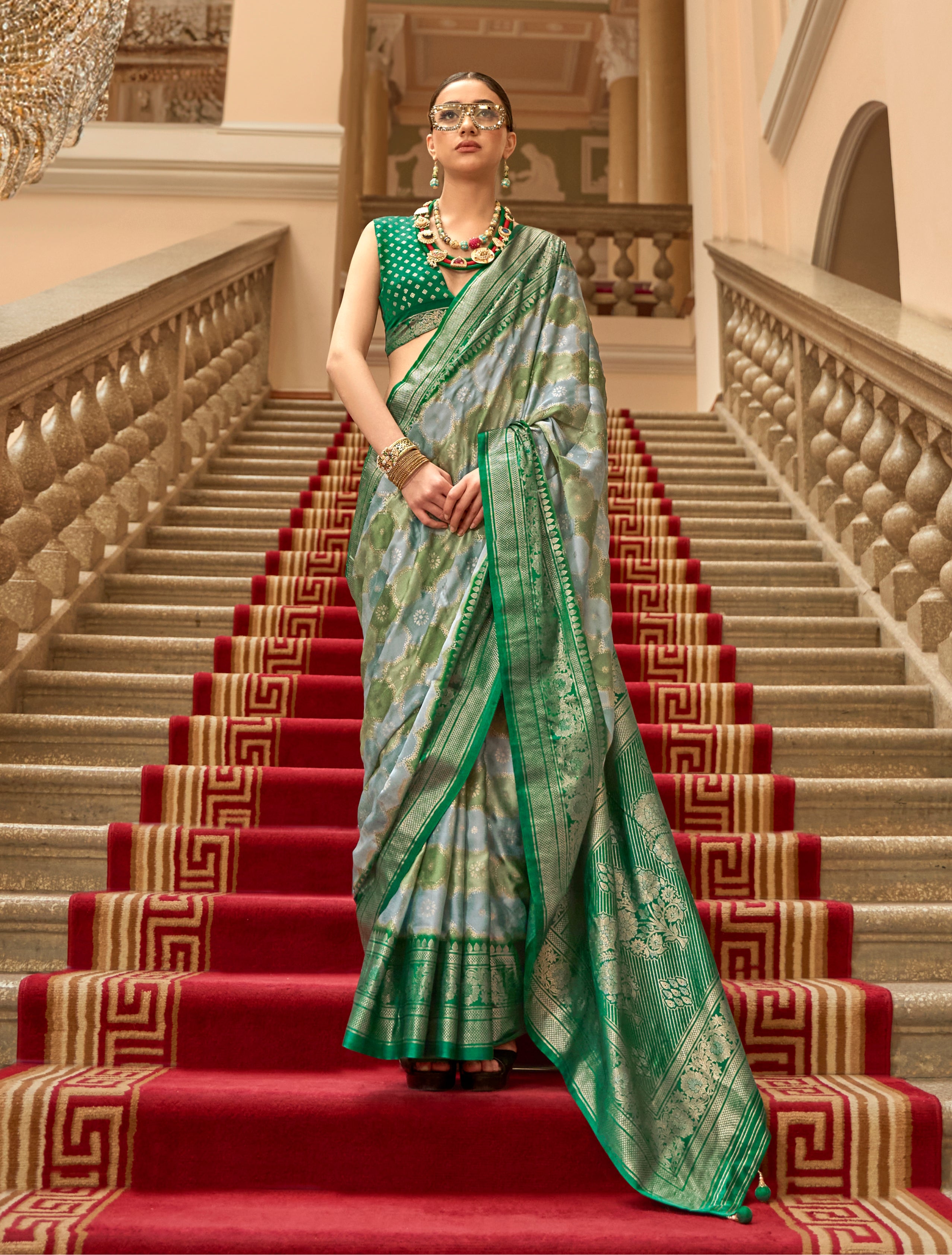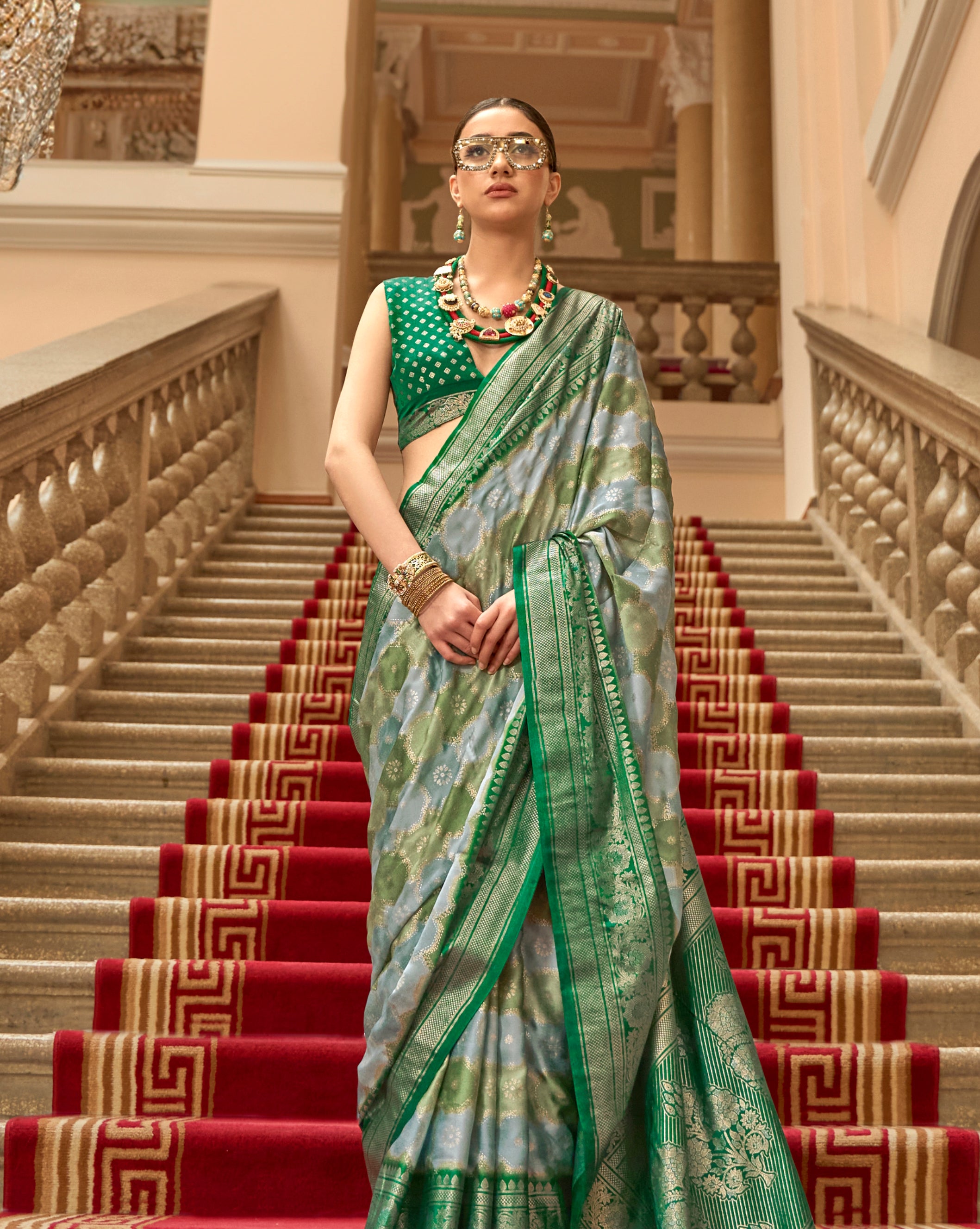 Aspiring to make a mark in the world of style! Here is the attire to breath life into your aspirations. Steal the hearts away with this green satin classic saree. The print and weaving work on attire personifies the entire appearance. Comes with matching blouse. (Slight variation in color, fabric & work is possible. Model images are only representative.)
