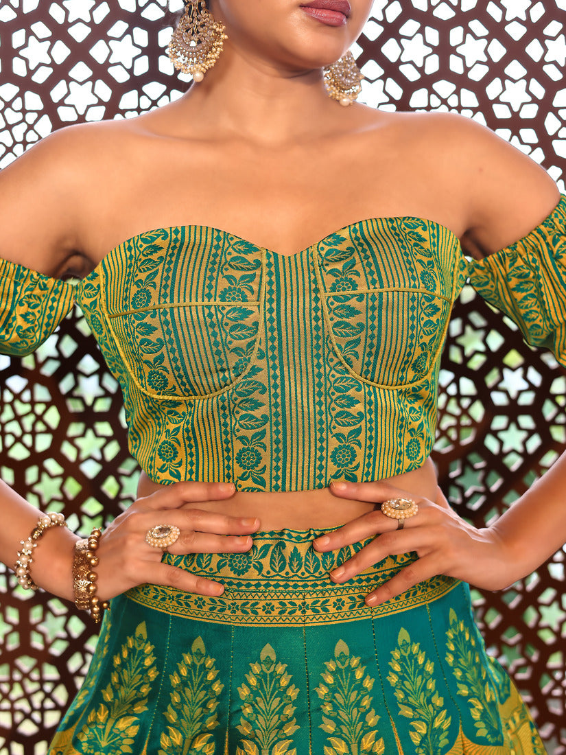 We unfurl our the intricacy and exclusivity of our creations highlighted in this sort of a desirable lime yellow kanjivaram silk trendy lehenga choli. You are able to see some interesting patterns done with weaving and zari work. Comes with matching Unstitched choli and dupatta. The stitched lehenga, Free Size, and unstitched choli bust size can be customized from 34 to 42 inches.