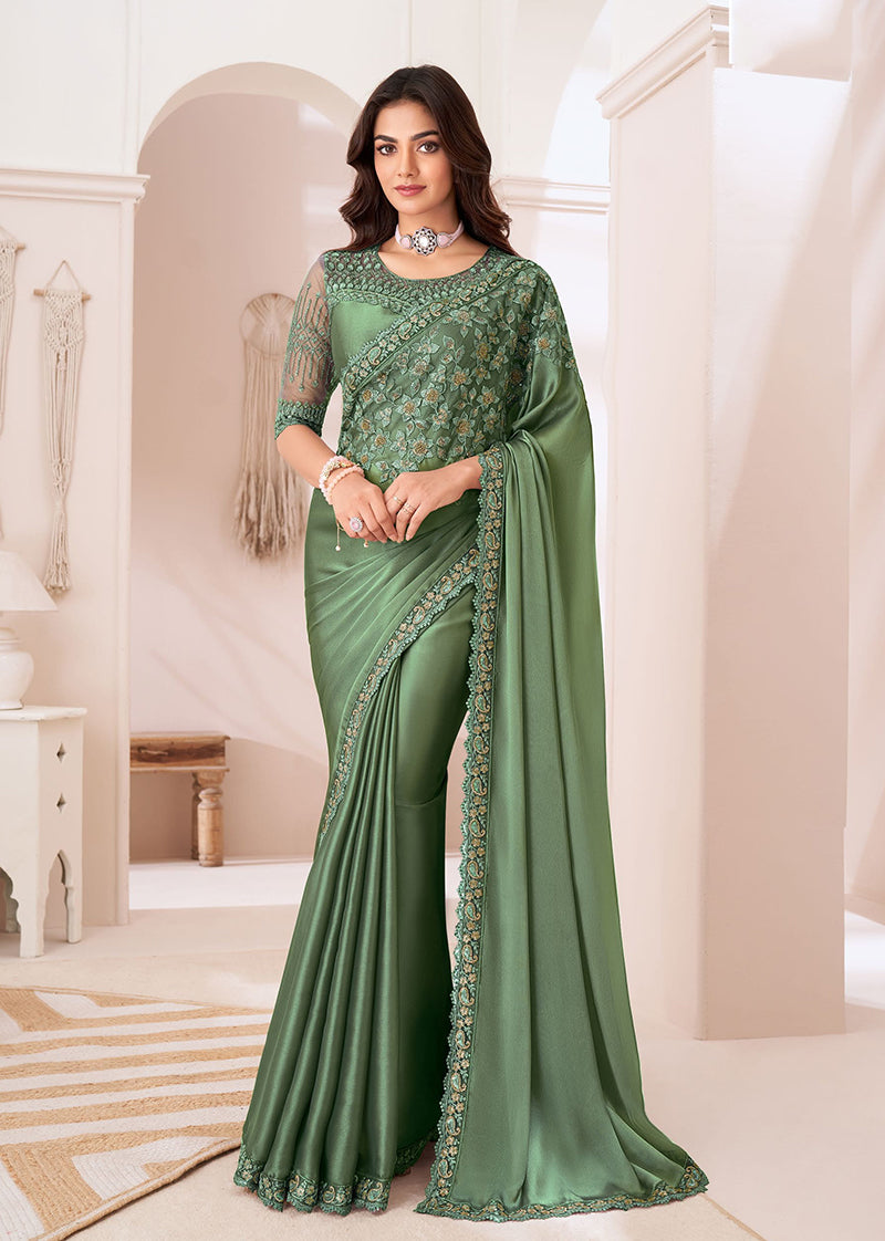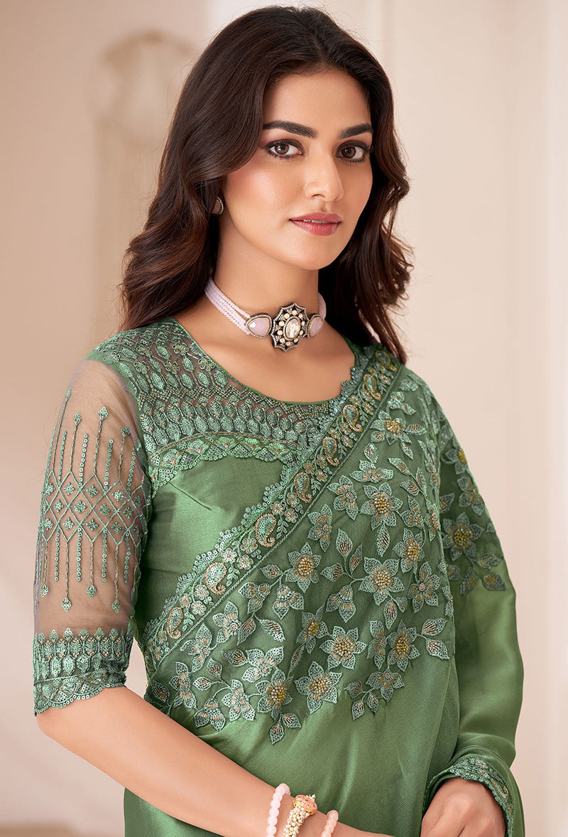 This delightful diva accoutre features unique styling and unusual material. This green georgette satin classic saree add the sense of elegant and glamorous. The brilliant attire creates a dramatic canvas with amazing cord, embroidered and thread work. Comes with matching blouse. (Slight variation in color, fabric & work is possible. Model images are only representative.)