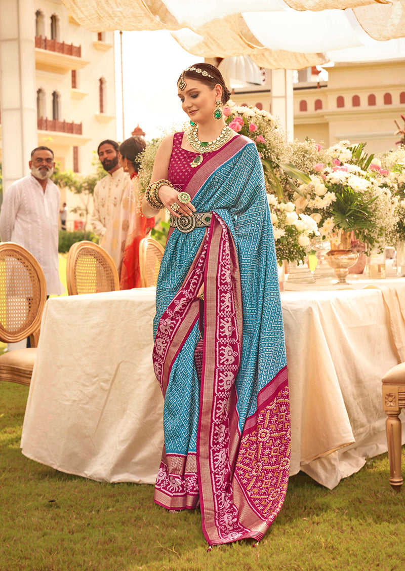 Grab the second look in this elegant attire for this season. Pamper the women in you with this beautiful blue patola silk saree. Beautified with patola print work all synchronized nicely with all the design and style and design of the dress. Comes with unstiched blouse. Do Note: All the accessories shown are for styling purpose only. Slight color variation may occur due to photographic reasons.
