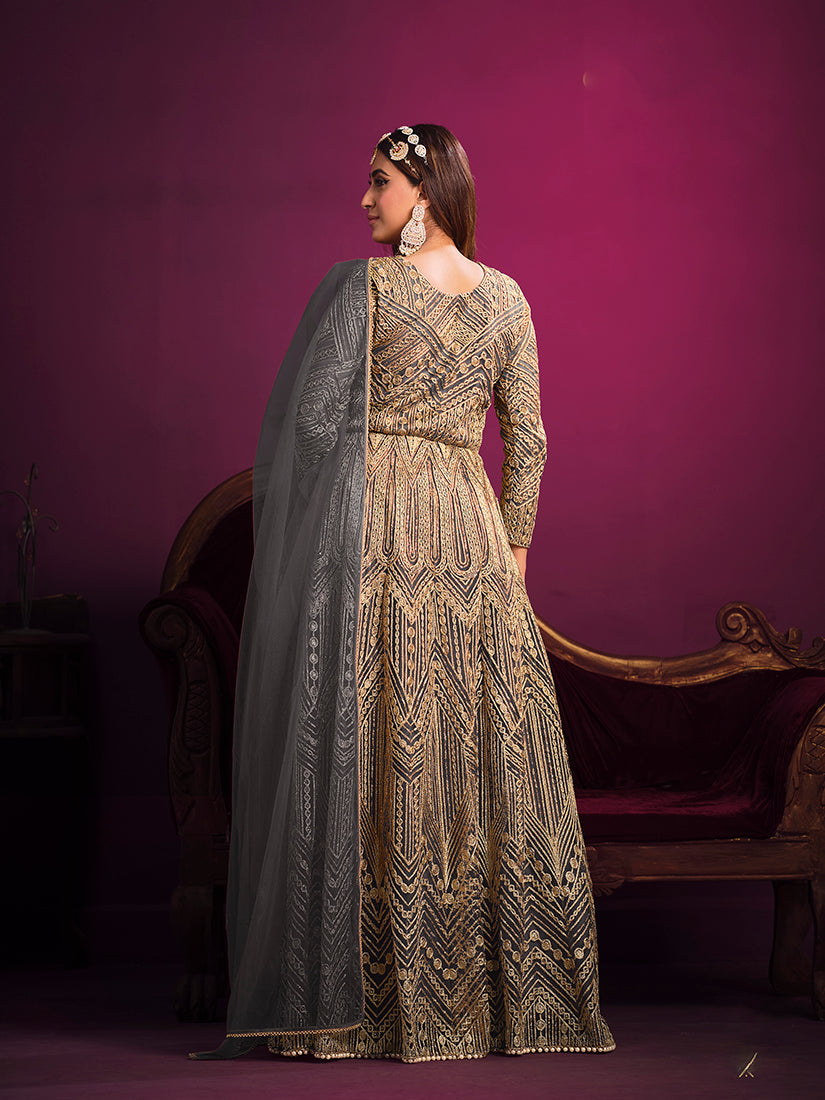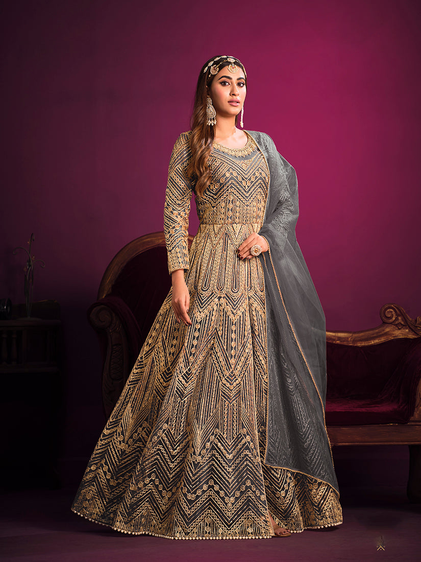 Monjolika Fashion Makes the heads flip when you dress up with this Grey net designer salwar suit. The embroidered and zari work on attire personifies the complete appearance. Comes with matching bottom and dupatta.