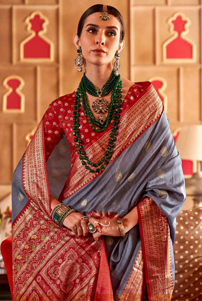 Be the sunshine of anyone’s eyes dressed with this desirable grey patola silk classic saree. Beautified with patola print work all synchronized very well with all the pattern and style of the attire. Comes with maroon blouse. Do Note: All accessories shown are for styling purpose only. Slight color variation may occur due to photographic reasons.