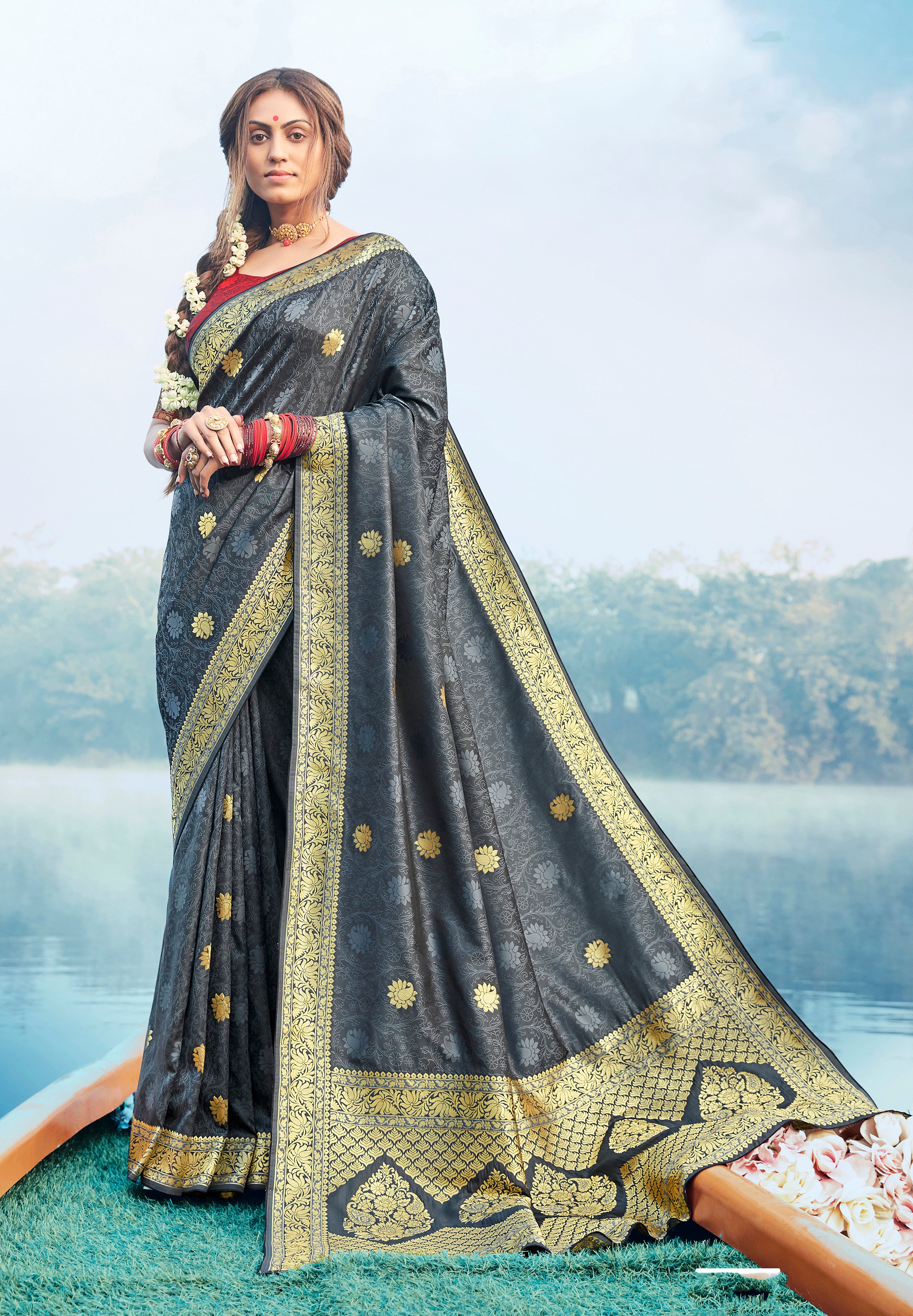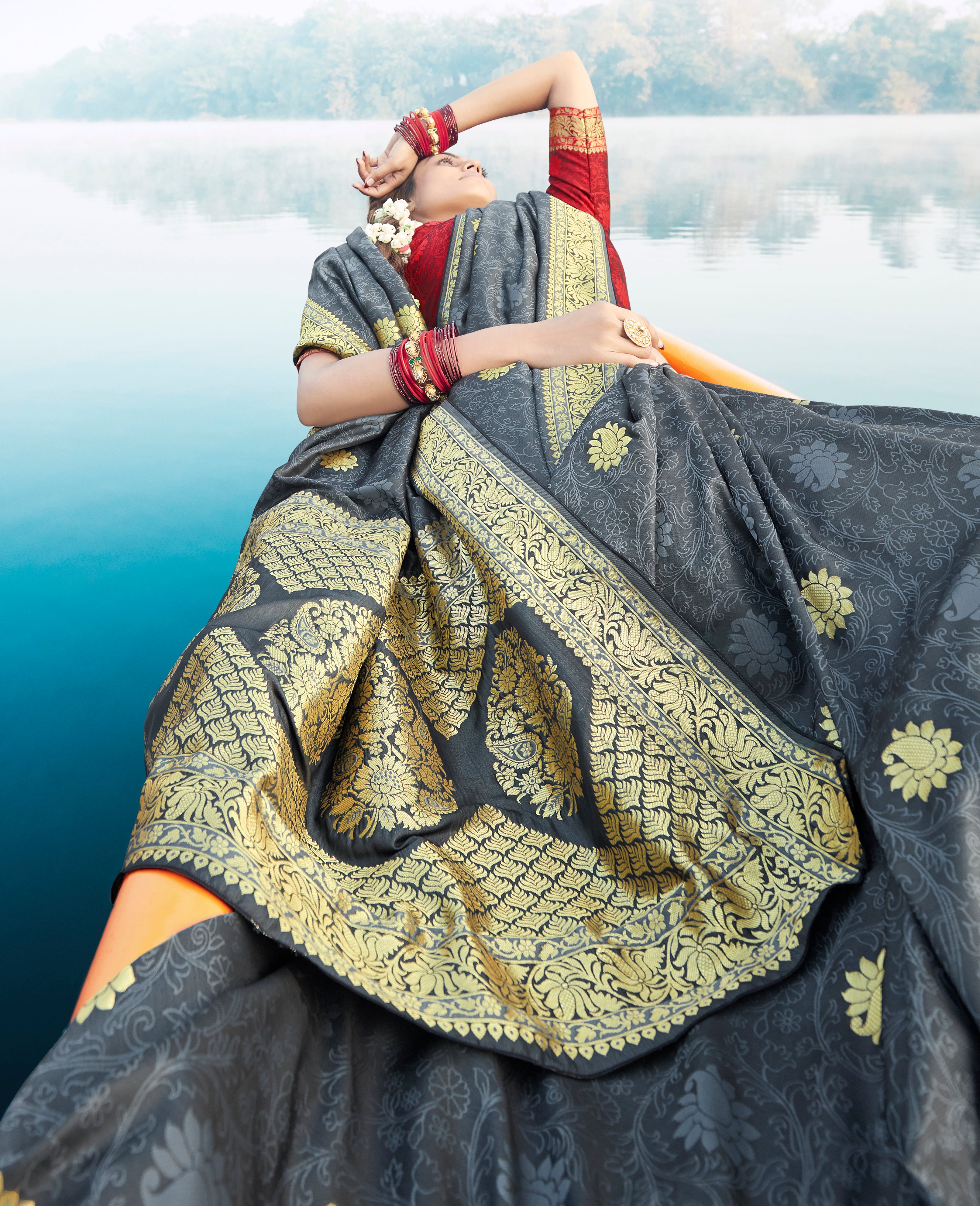 Monjolika Fashion Presents Be A Stunner In Festive Parties And Function With This Charming Grey Color Designer Saree. This Festive Wear Banarasi Silk Saree Is Decorated With Modish Weaving Work. The Saree Comes Along With Matching Red Color Banarasi Silk Unstitched Blouse Piece.