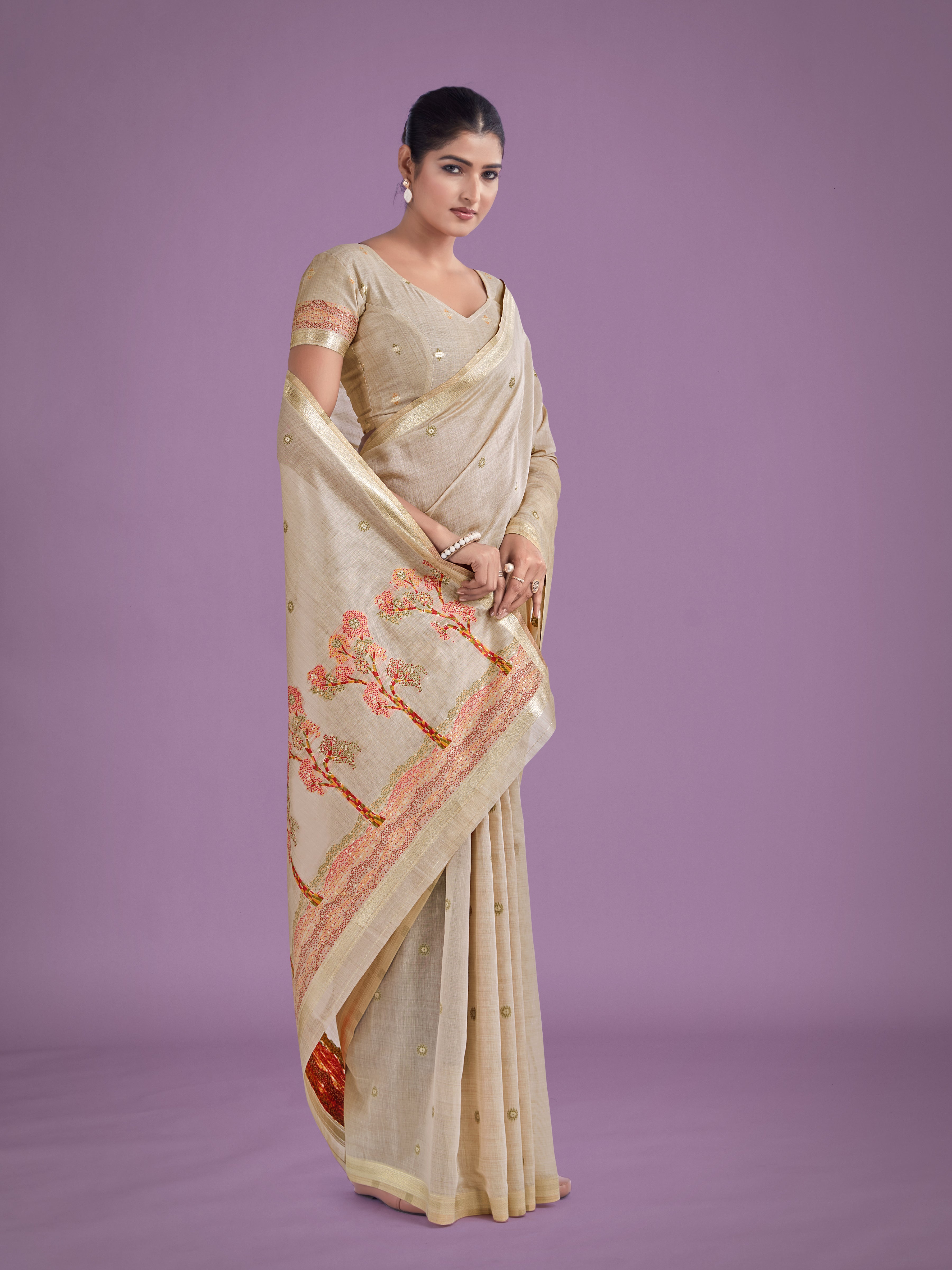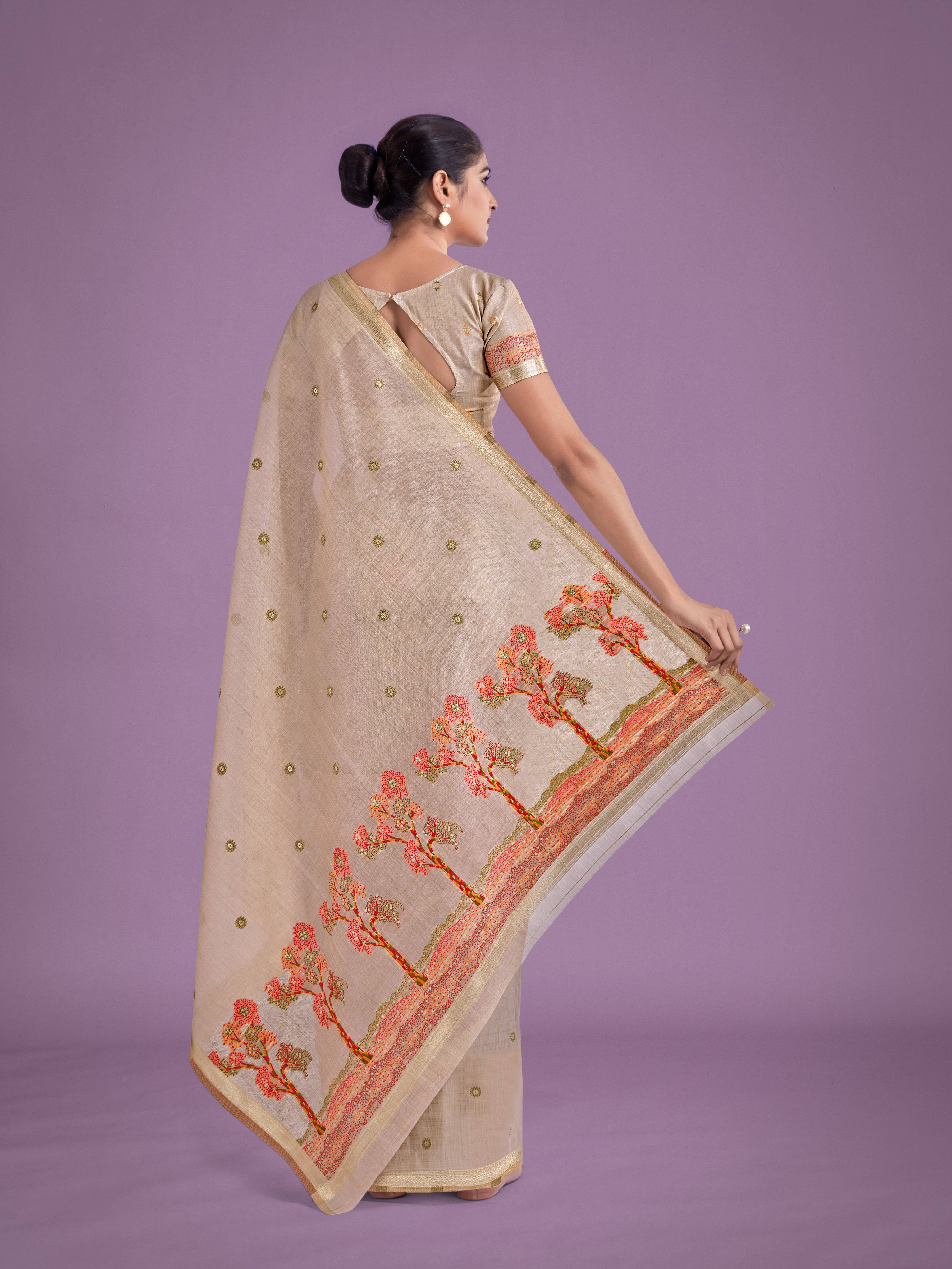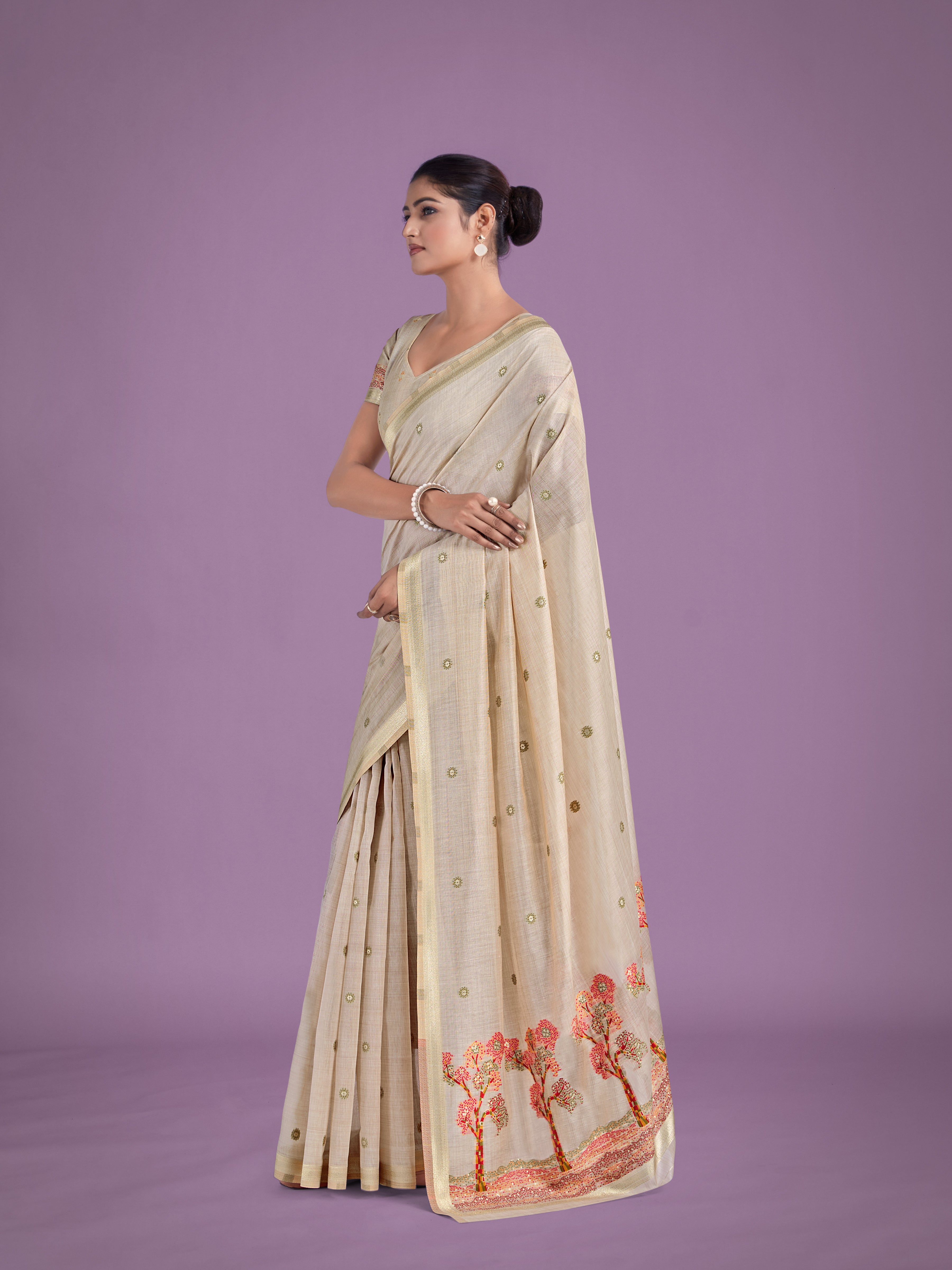 Saree Work : Woven Butti ,Golden Zari border work || Blouse: Woven work