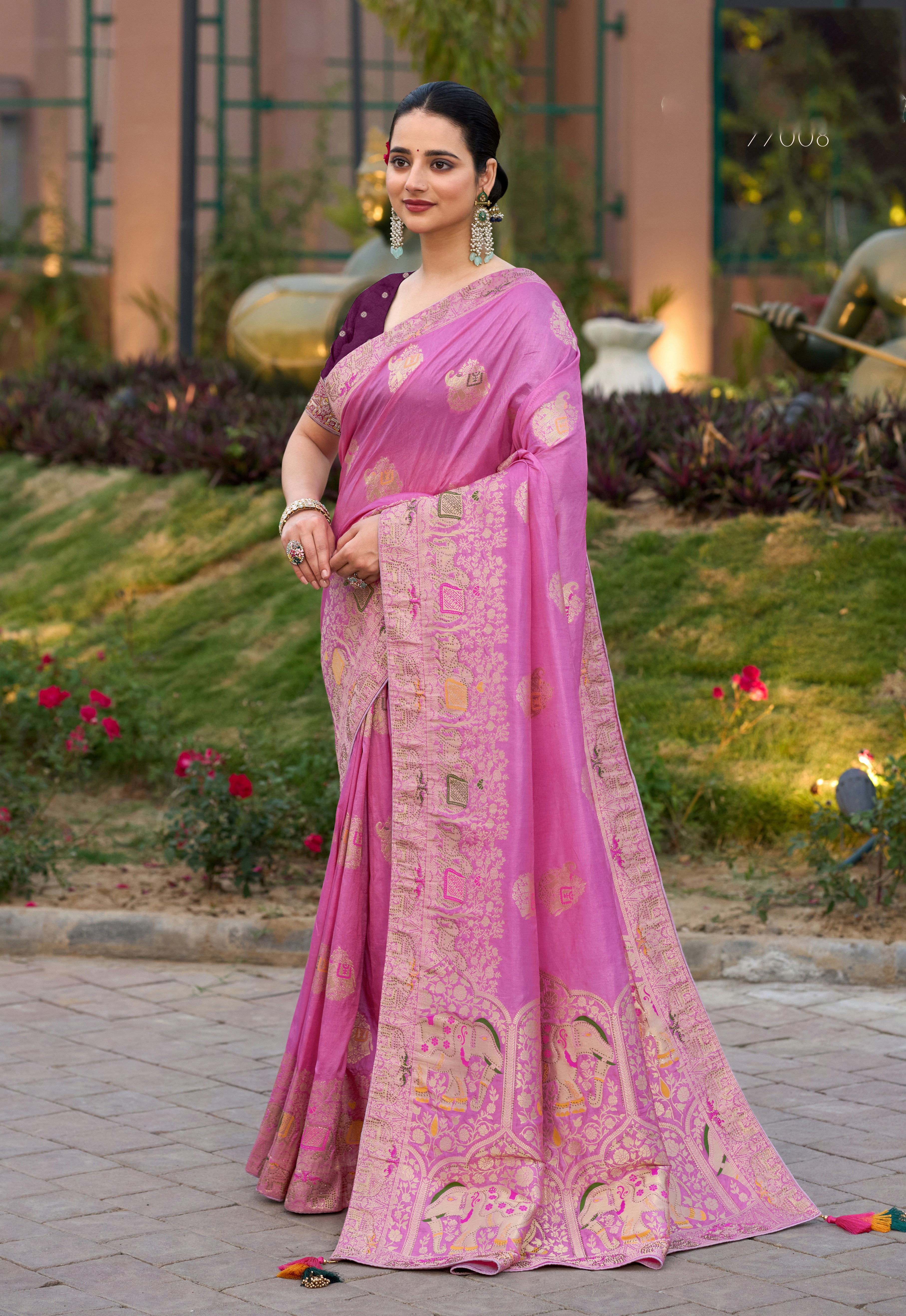 Add a vibrant burst of colour for your wardrobe with this Rose Pink Dola silk classic saree. The ethnic jacquard work and weaving work over a dress adds a sign of elegance statement for your look. Comes with matching blouse. (Slight variation in color, fabric & work is possible. Model images are only representative.)