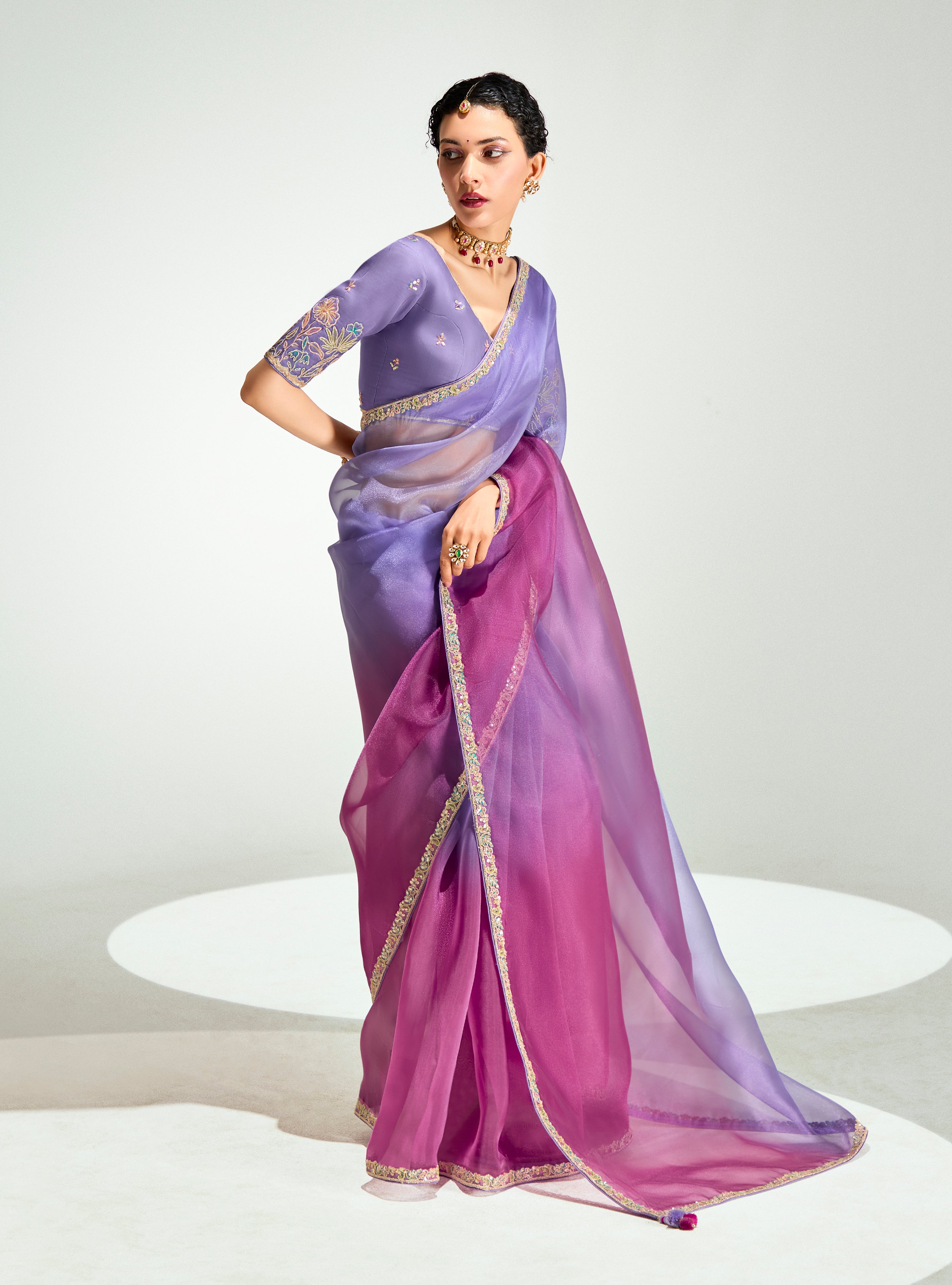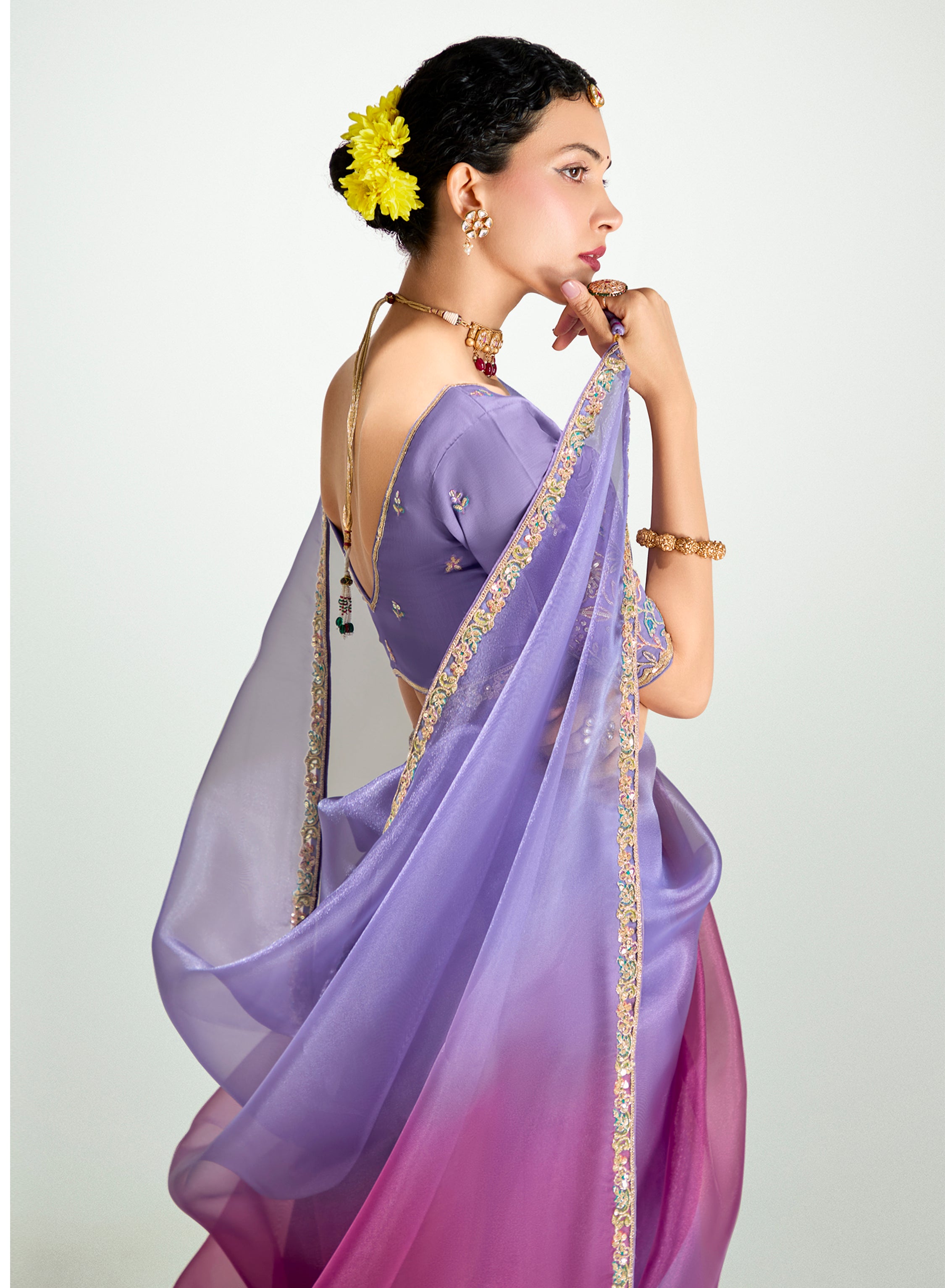 This Lavender And Magenta Shaded Tissue Organza Saree is a delightful mix of soft charm and intricate craft, perfect for your festive and traditional moments. Made from lightweight tissue silk, it dazzles with hand-embroidered resham thread, sparkling sequins, and playful tassels along the border and pallu. The matching satin silk blouse is a showstopper too, featuring handwork embroidery with beads and sequins on the neckline, sleeves, and back.