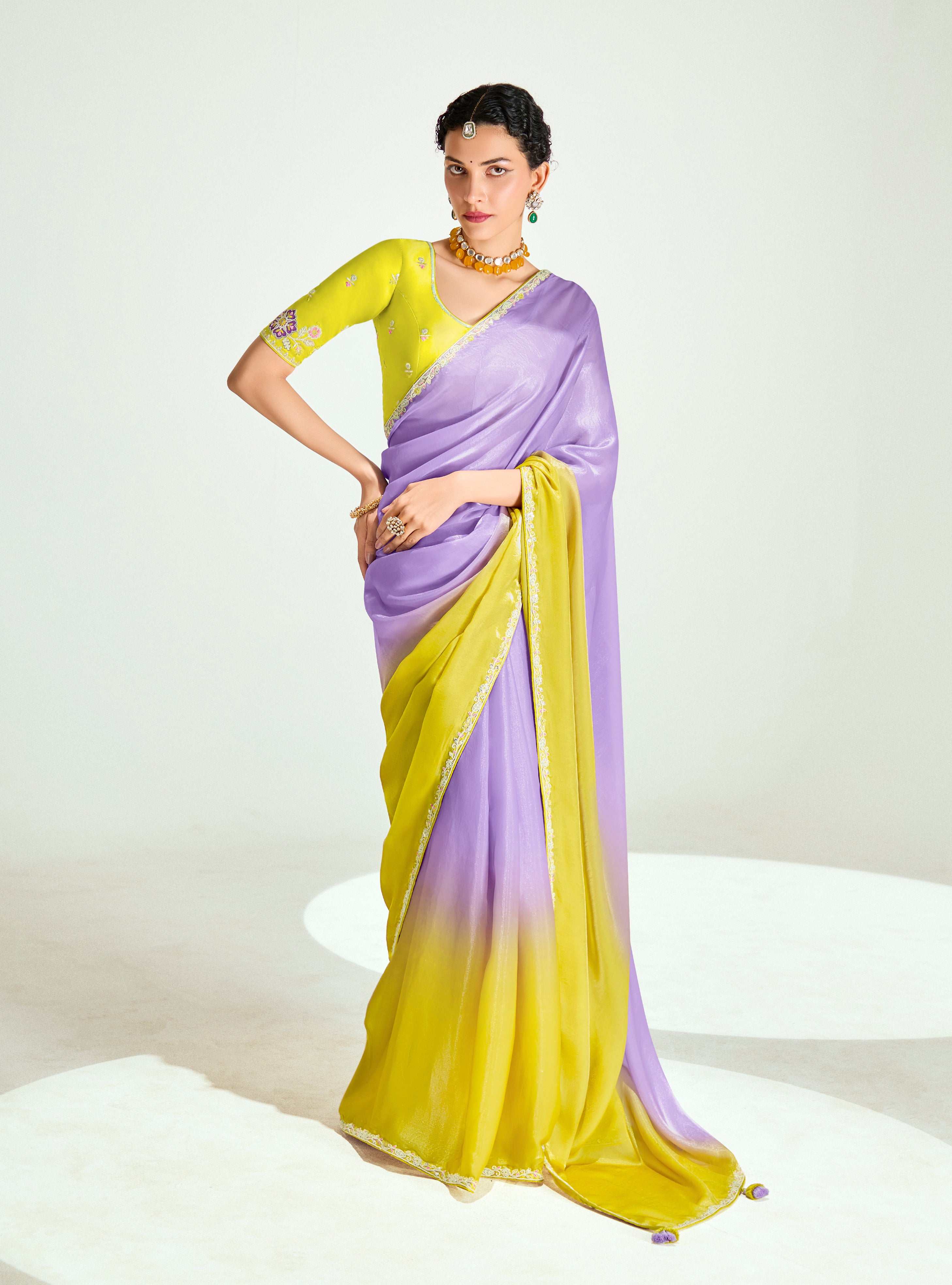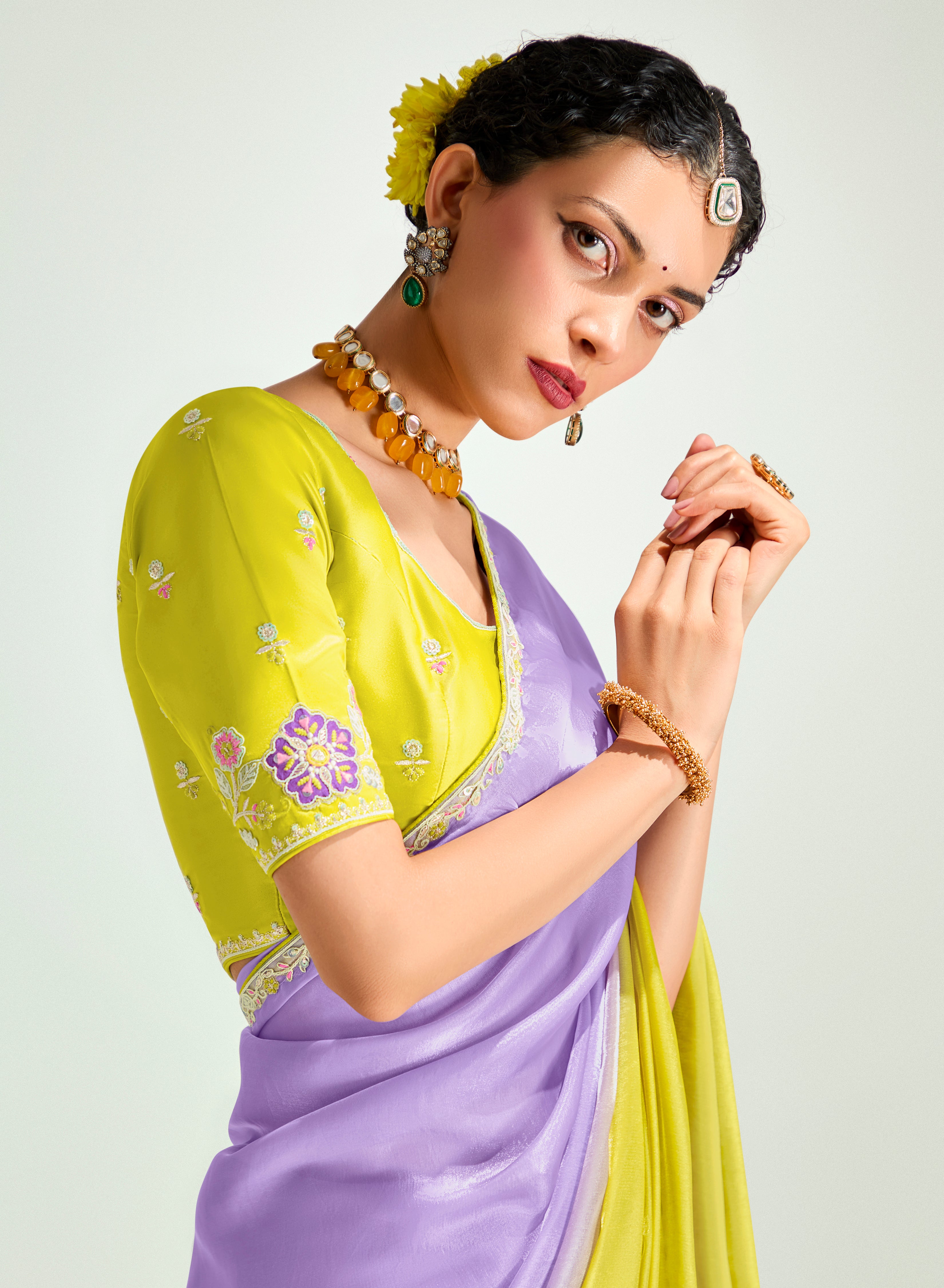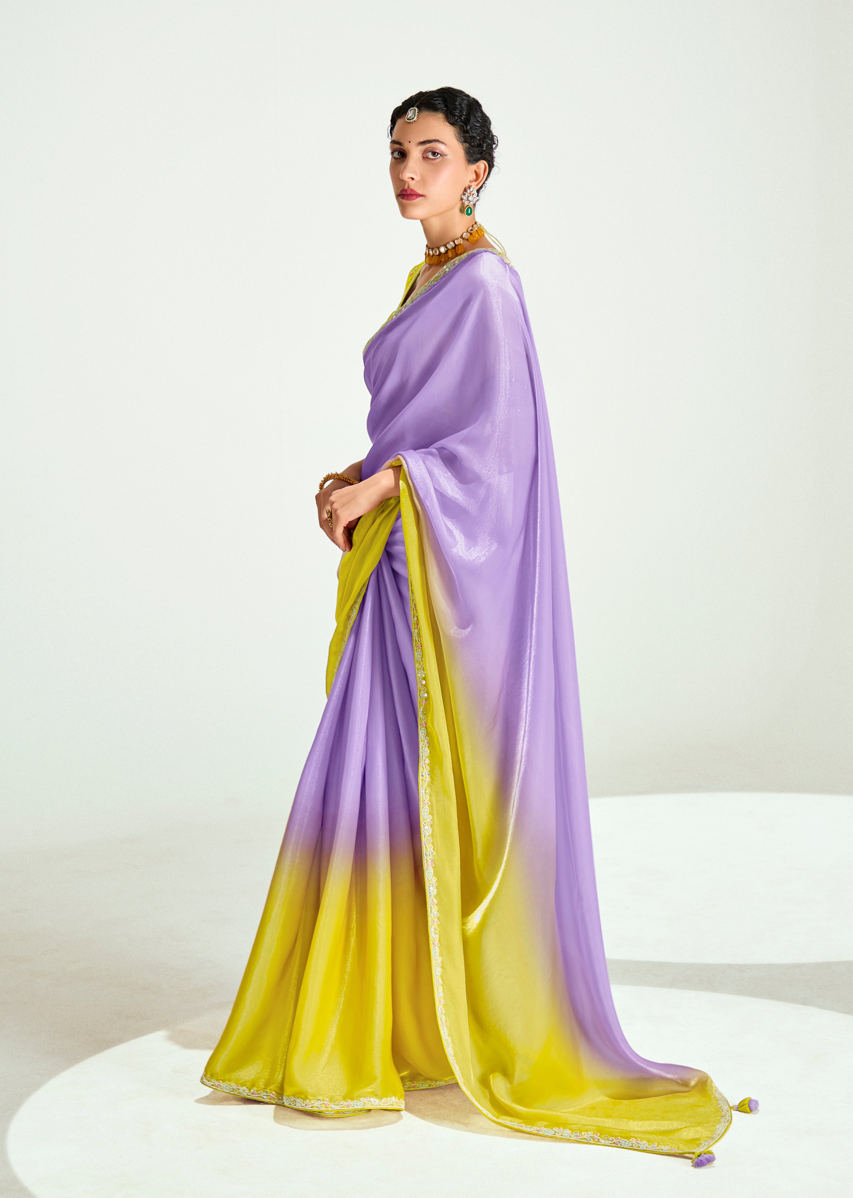 This Lavender And Yellow Shaded Tissue Organza Saree is a delightful mix of soft charm and intricate craft, perfect for your festive and traditional moments. Made from lightweight tissue silk, it dazzles with hand-embroidered resham thread, sparkling sequins, and playful tassels along the border and pallu. The matching satin silk blouse is a showstopper too, featuring handwork embroidery with beads and sequins on the neckline, sleeves, and back.