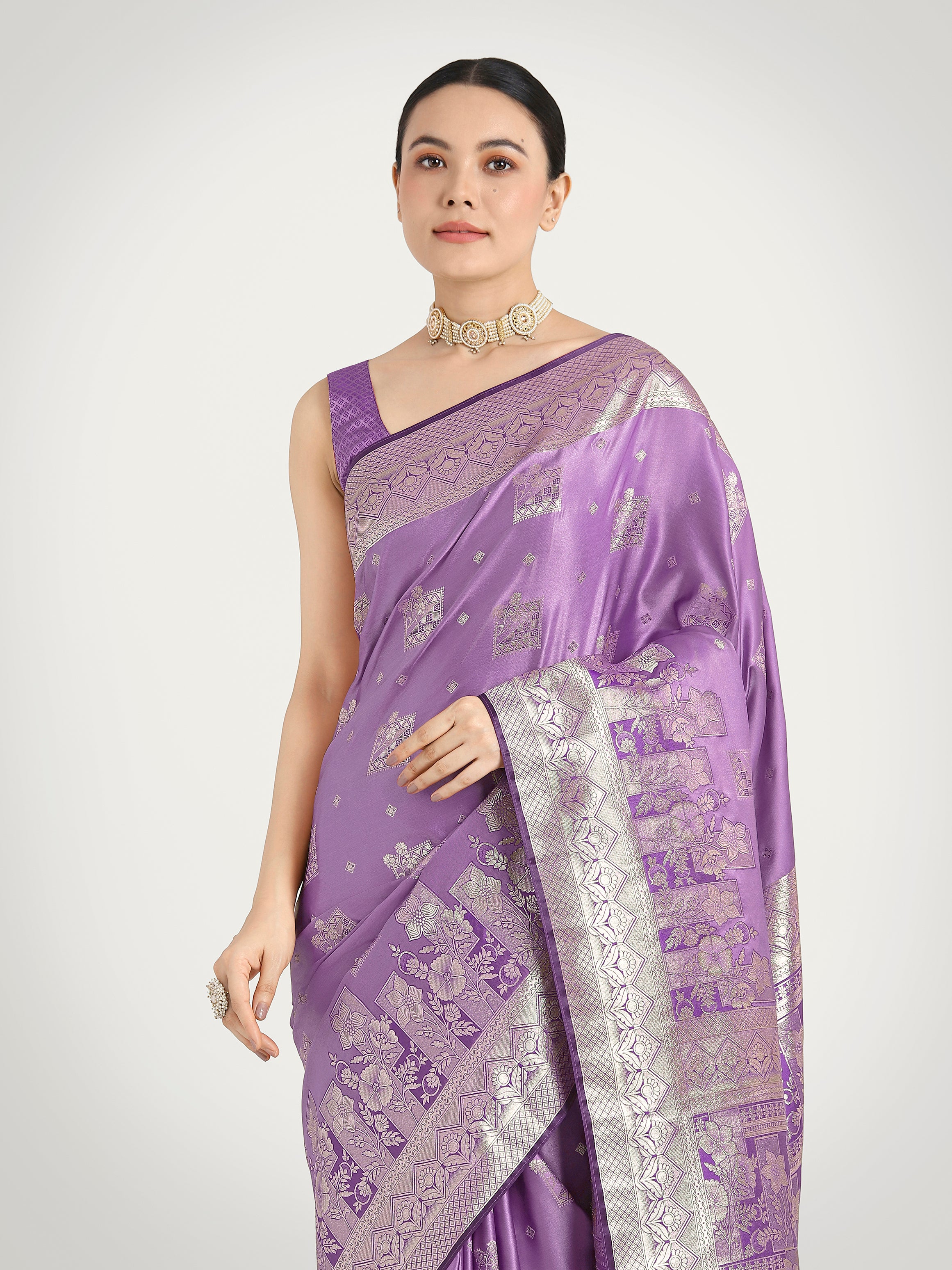 We have ensemble a symphony of enchanting piece to restyle your senses. Real beauty comes out from your dressing style with this Lavender Banarasi satin silk traditional saree. This attire is showing some really mesmerizing and innovative patterns with weaving work. Comes with matching blouse. (Slight variation in color, fabric & work is possible. Model images are only representative.)