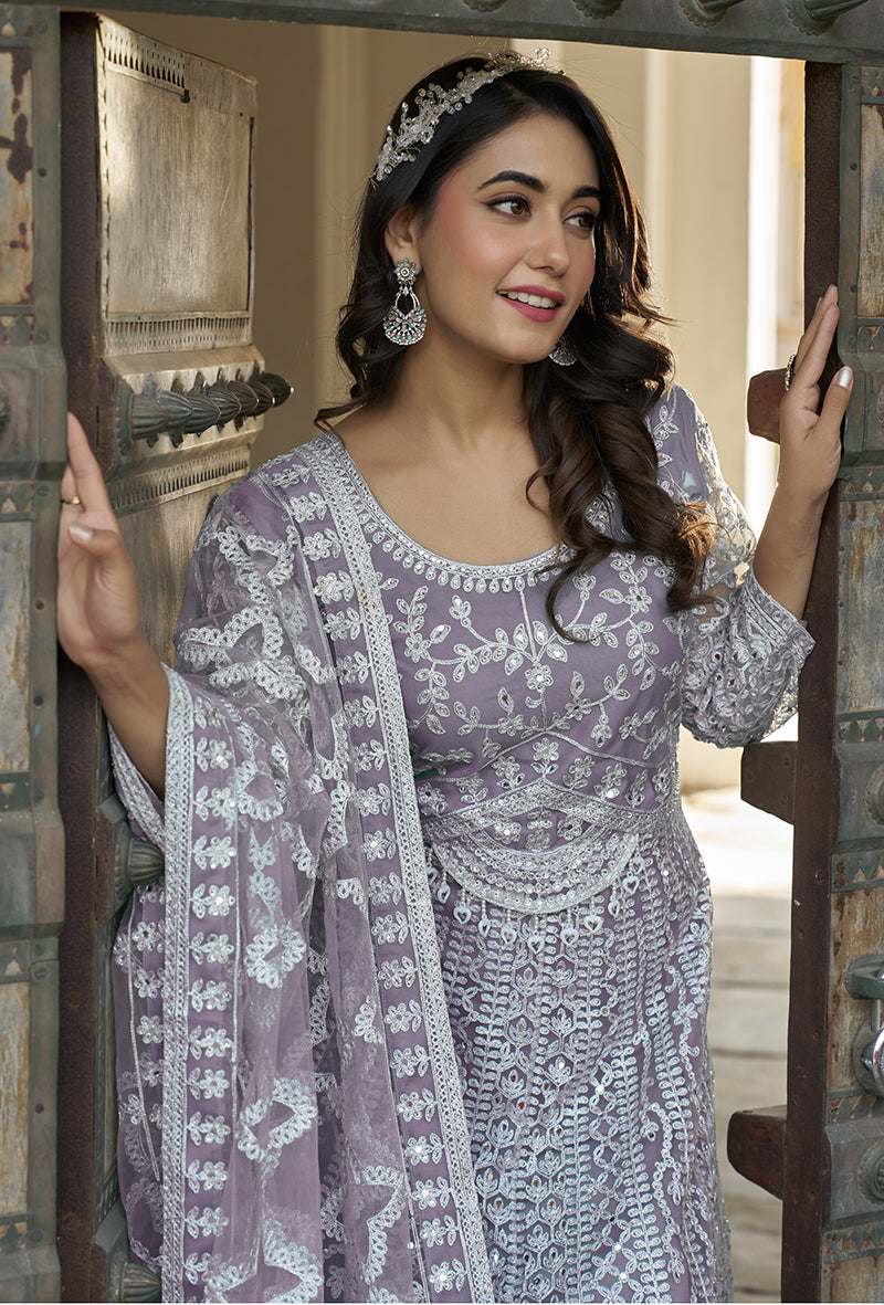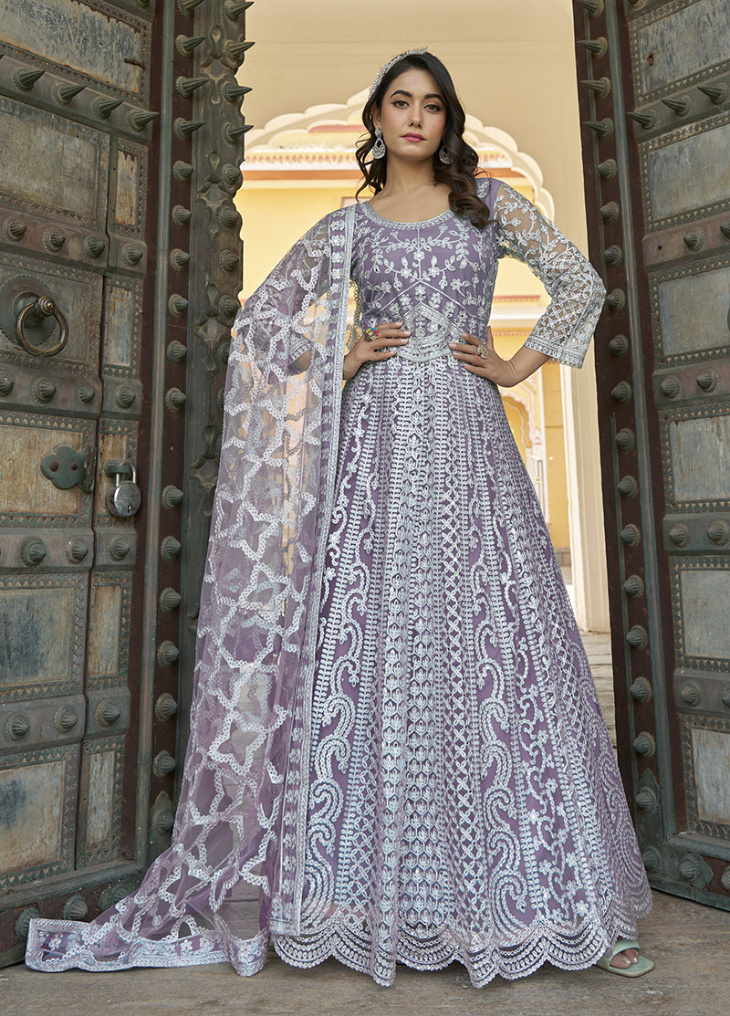 Stay Ahead In Style With This Lavender Color Real Butterfly net Trendy Anarkali Salwar Suit. The Ethnic stone mirror Embroidered Work At The Apparel Adds A Sign Of Splendor Statement For Your Look. Comes With Matching Dupatta.