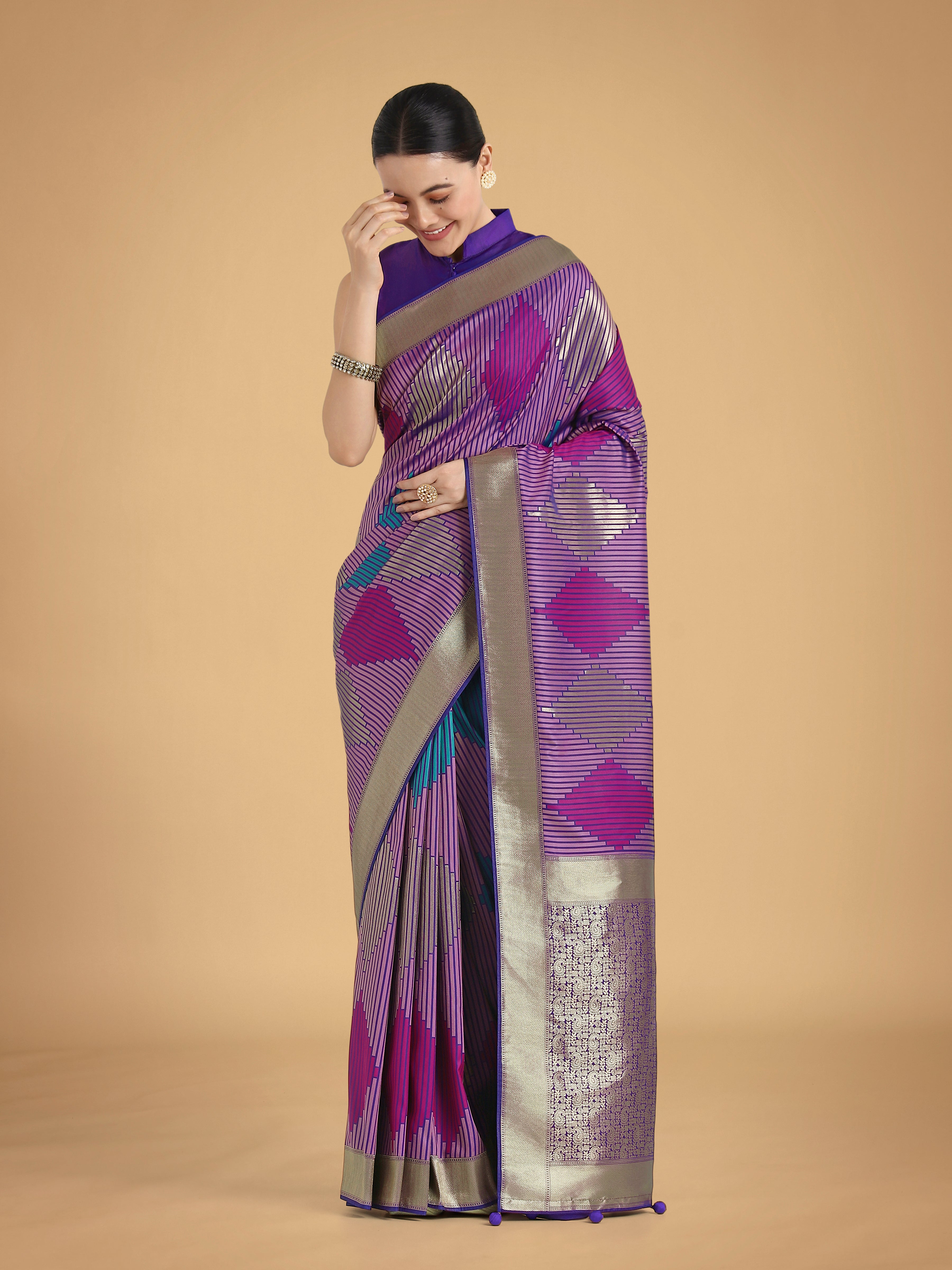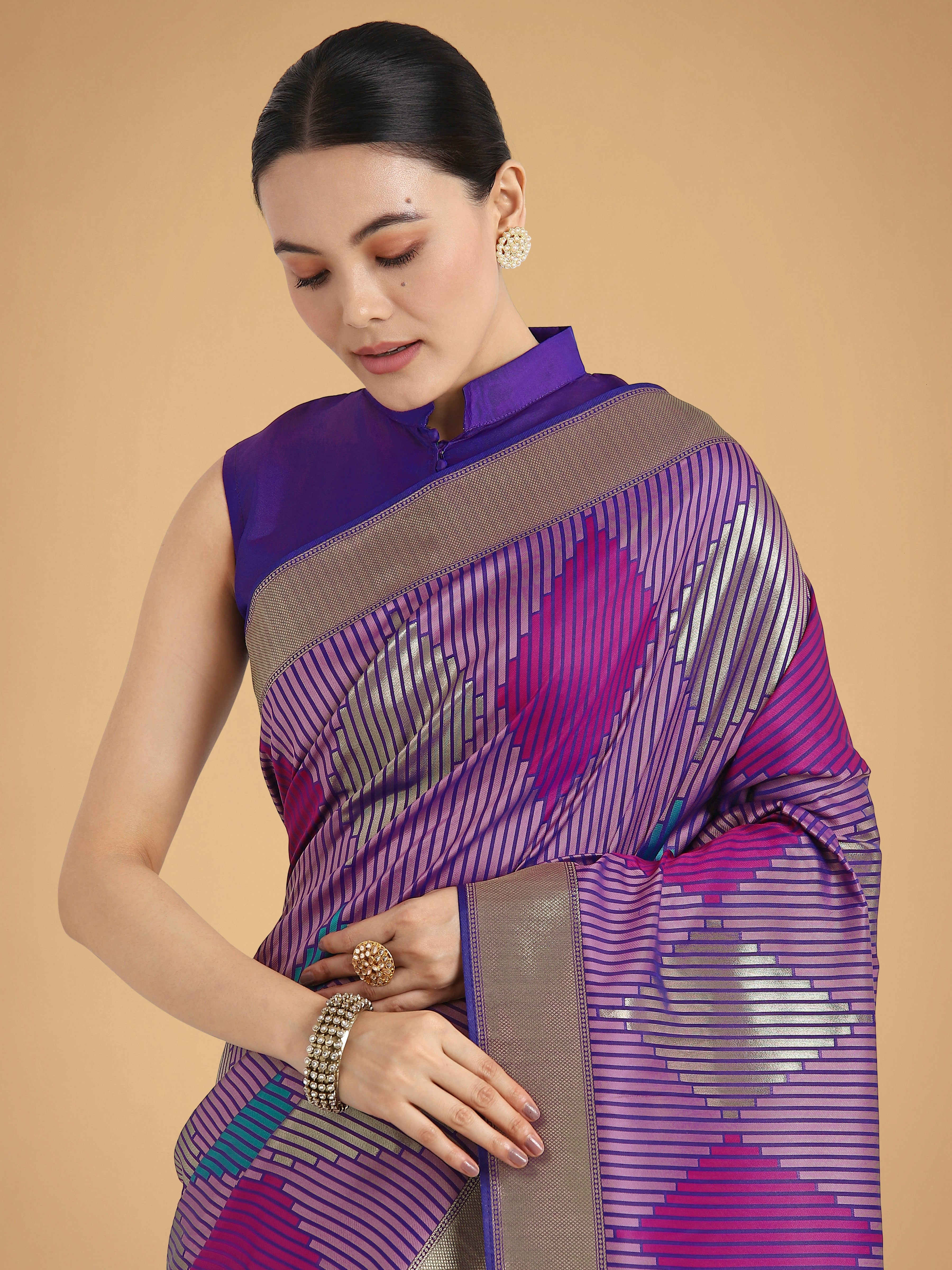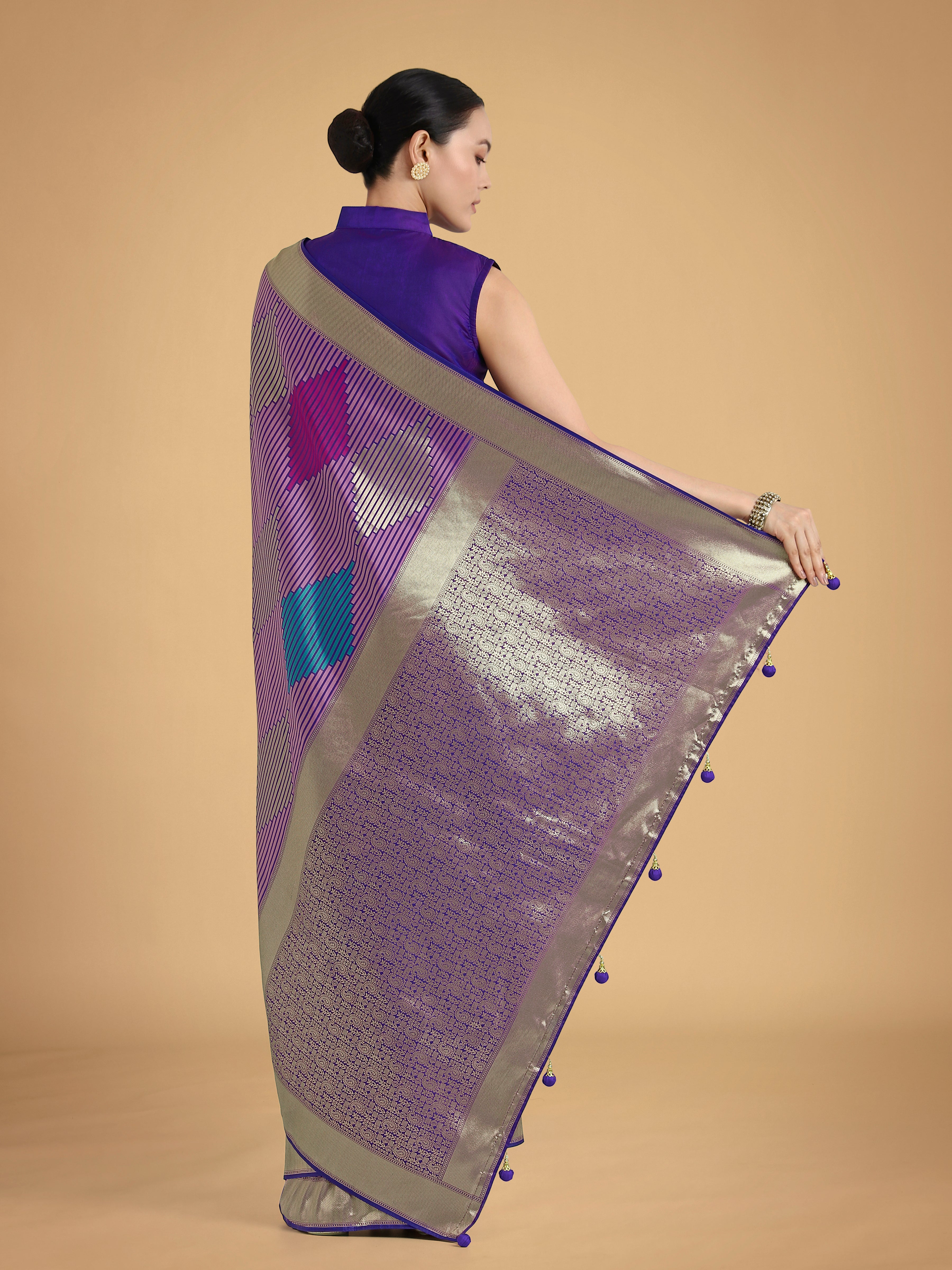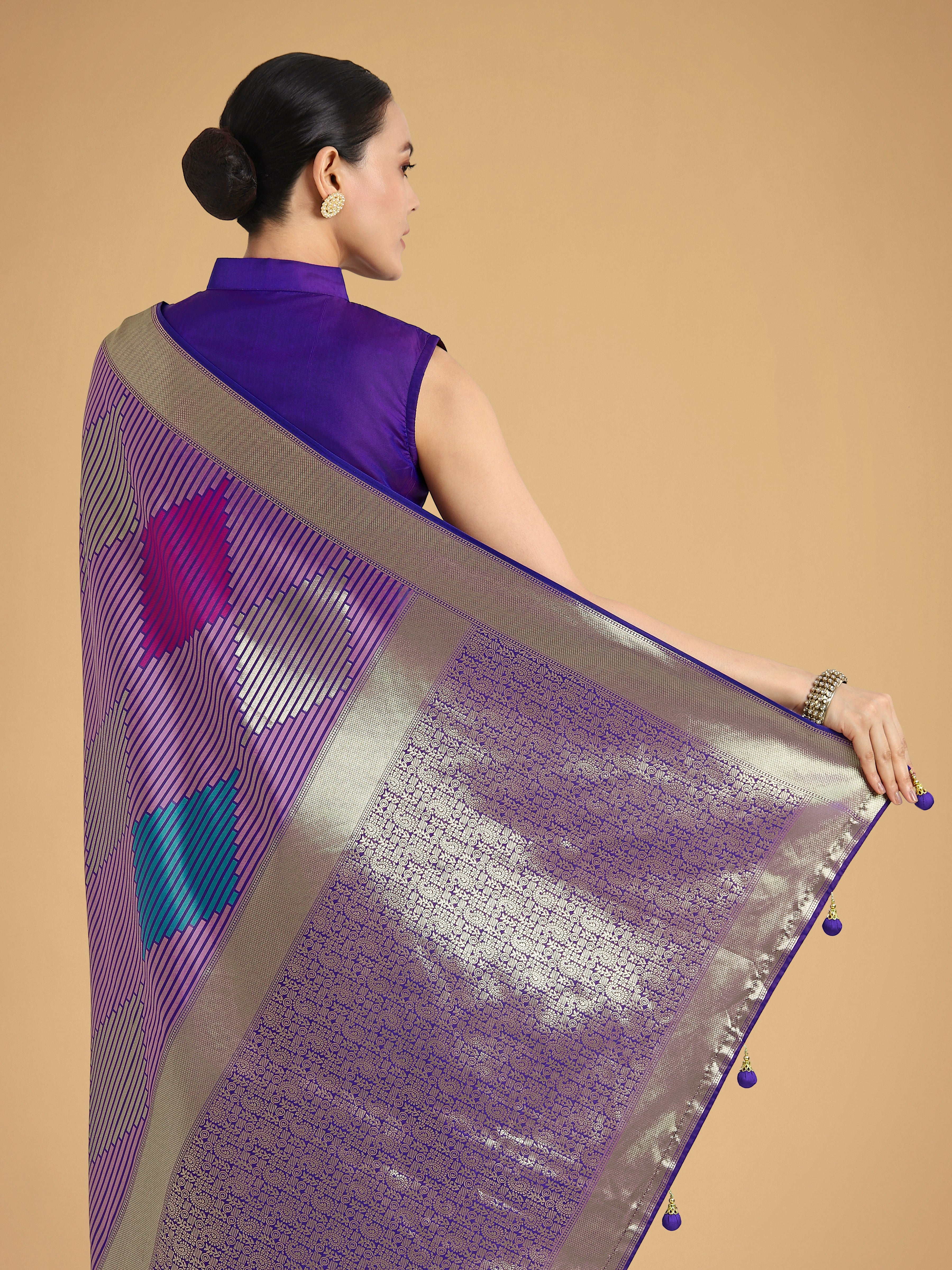 An outstanding Lavender colour Banarasi satin silk classic saree will make you look extremely stylish and graceful. The interesting geomatric print and woven work in the course of the dress is awe inspiring. Comes with matching blouse. (Slight variation in color, fabric & work is possible. Model images are only representative.)