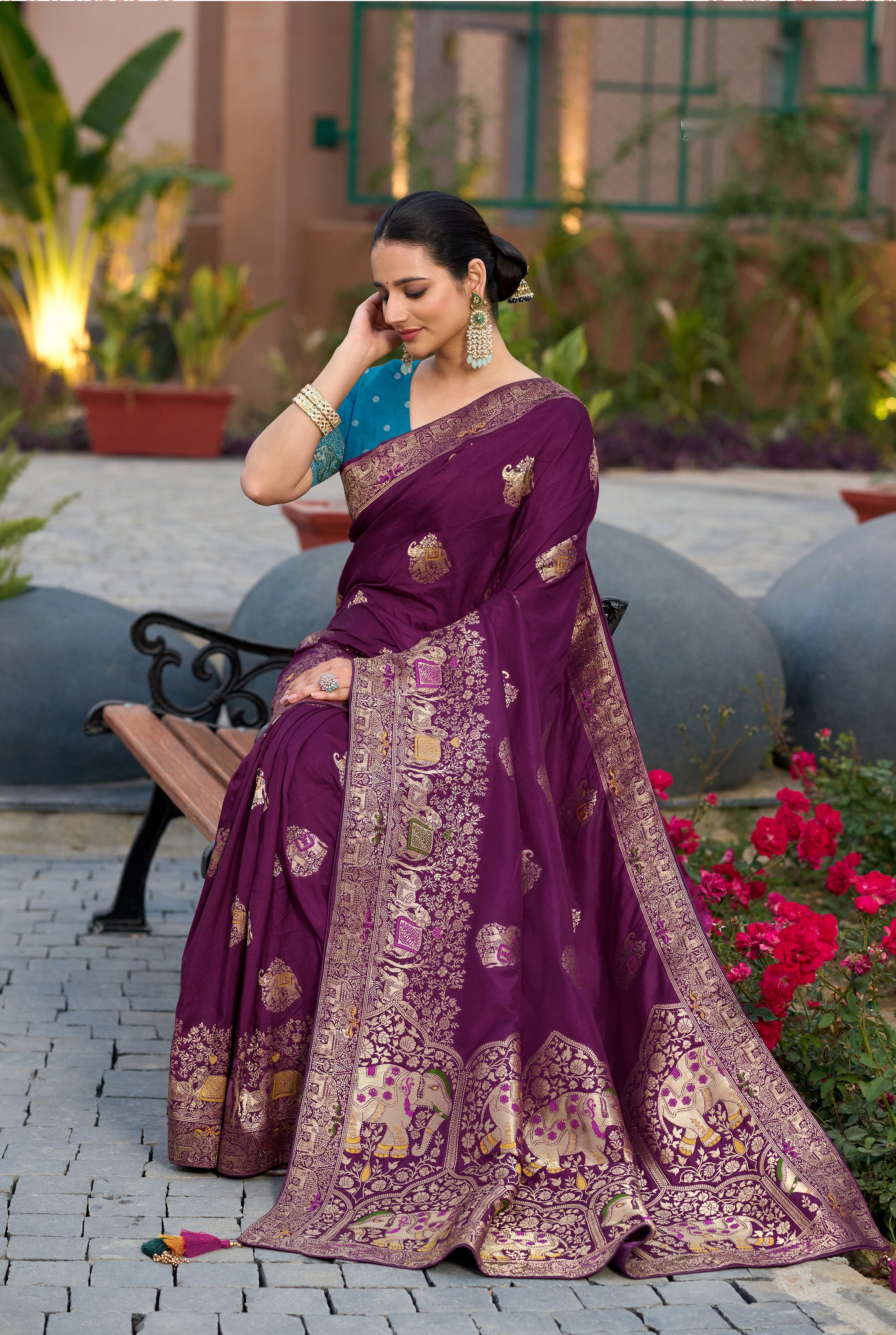 Add a vibrant burst of colour for your wardrobe with this Purple Dola silk classic saree. The ethnic jacquard work and weaving work over a dress adds a sign of elegance statement for your look. Comes with matching blue blouse. (Slight variation in color, fabric & work is possible. Model images are only representative.)
