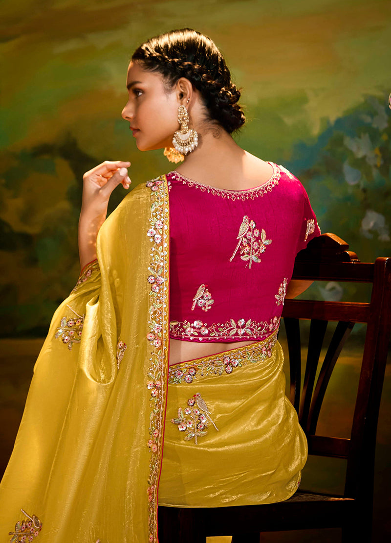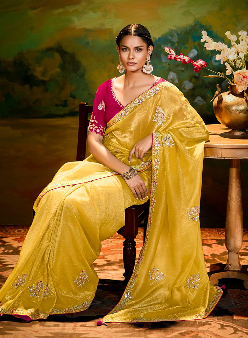 Exquisite and elegant, this Bronze Yellow Zari Embroidery Designer Crush Tissue Silk Saree showcases intricate craftsmanship with its delicate embroidery & sequins work. The luxurious blend of tissue silk fabric adds a graceful sheen, making it a perfect choice for festive occasions and celebrations. Drape yourself in this timeless piece for a regal and sophisticated look.