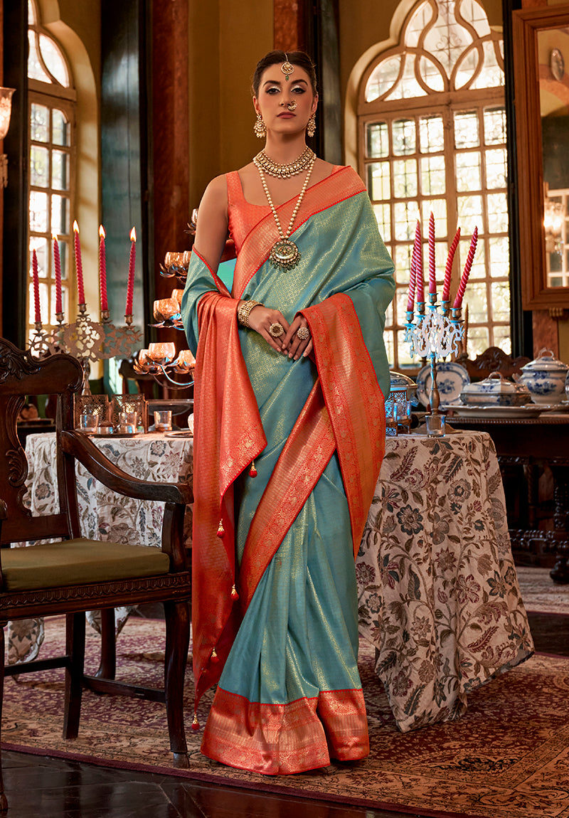 A celebration of timeless weaving, this light blue Kanjivaram silk saree is understated opulence. The rich hue is complemented by traditional gold zari detailing—ideal for those who appreciate quiet luxury with a cultural soul.