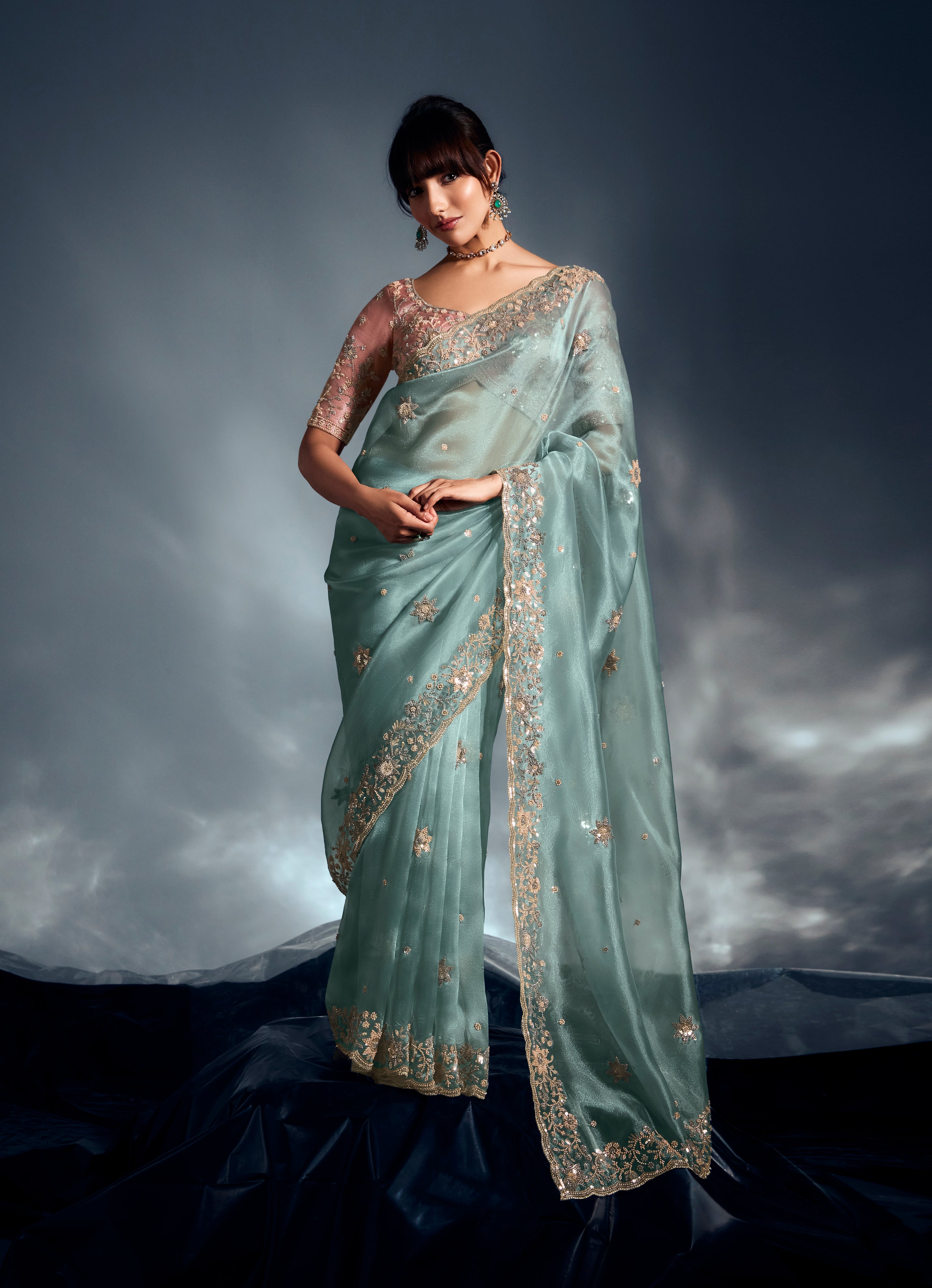 Step into elegance with our Light Blue Tissue Organza Saree, beautifully crafted with intricate moti, cutdana, sequins, and khatli handwork that adds a luxurious shimmer to every drape. Designed for women who want to make a statement, this saree blends sheer sophistication with contemporary style. Its lightweight organza fabric flows gracefully, making it the perfect choice for party wear, cocktail evenings, and festive celebrations. The detailed border work enhances its regal charm, ensuring all eyes stay on you. Comes with unstiched blouse.
