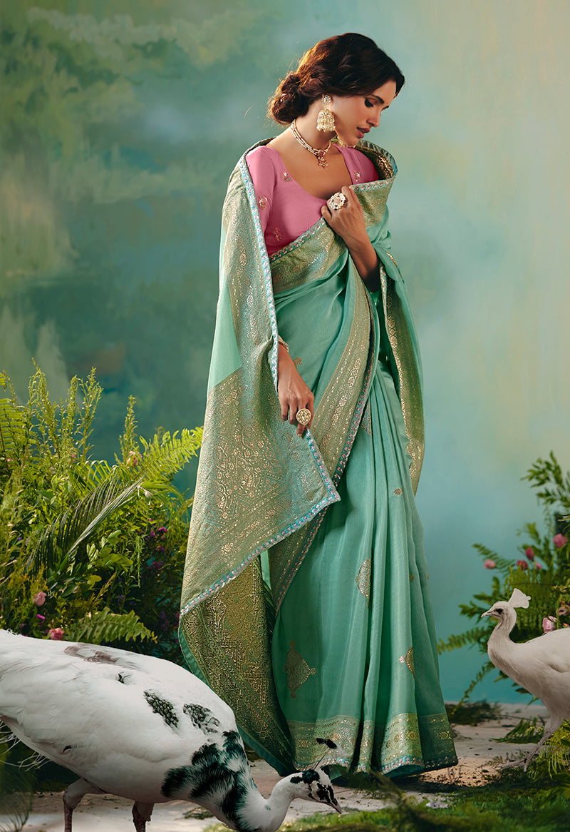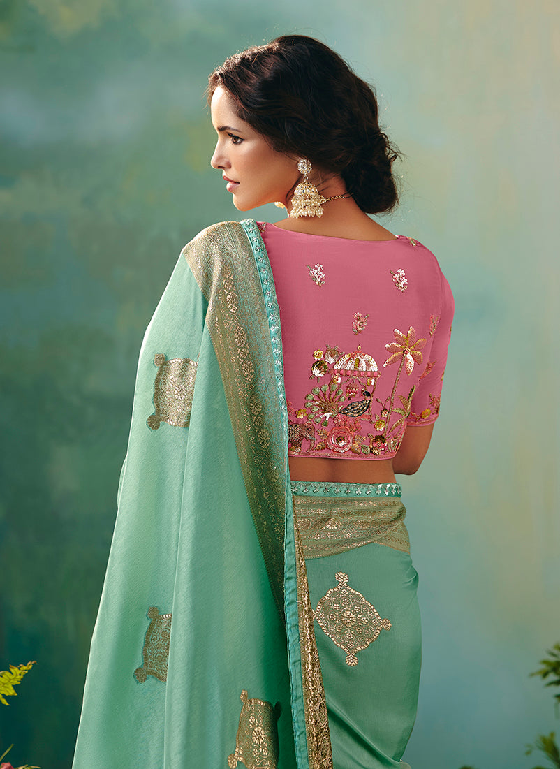 If you are a diva who loves to turn heads wherever you go and this delightful drape is a must have item for your closet. Get the simplicity and grace with this Light blue Viscose Dola Silk With Zari Weaving Embroidery Worked classic saree. This lovely attire is looking extra beautiful with embelishment of embroidered work. Comes with matching blouse. (Slight variation in color, fabric & work is possible. Model images are only representative.)