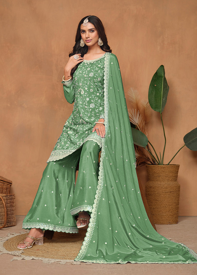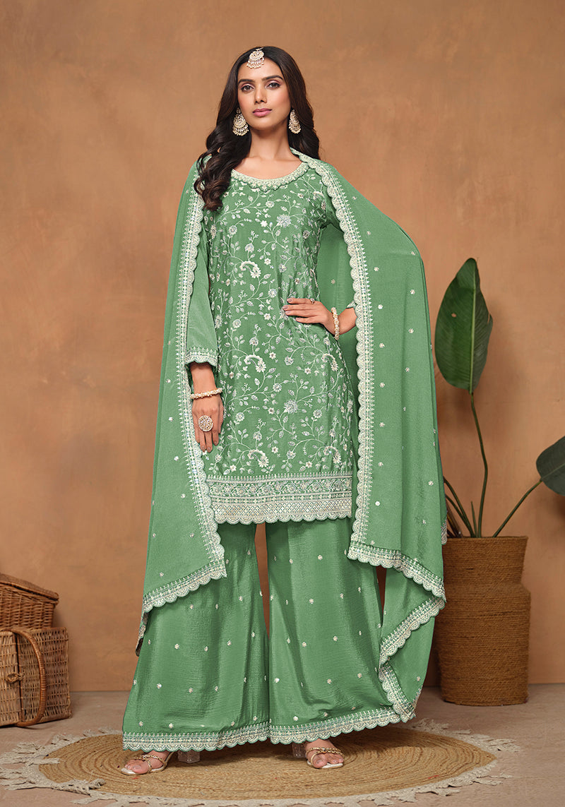Monjolika Fashion Presents An superb light green chinon readymade designer salwar suit will make you look quite stylish and graceful. The ethnic resham and sequence work at the apparel adds a sign of magnificence statement with a look.