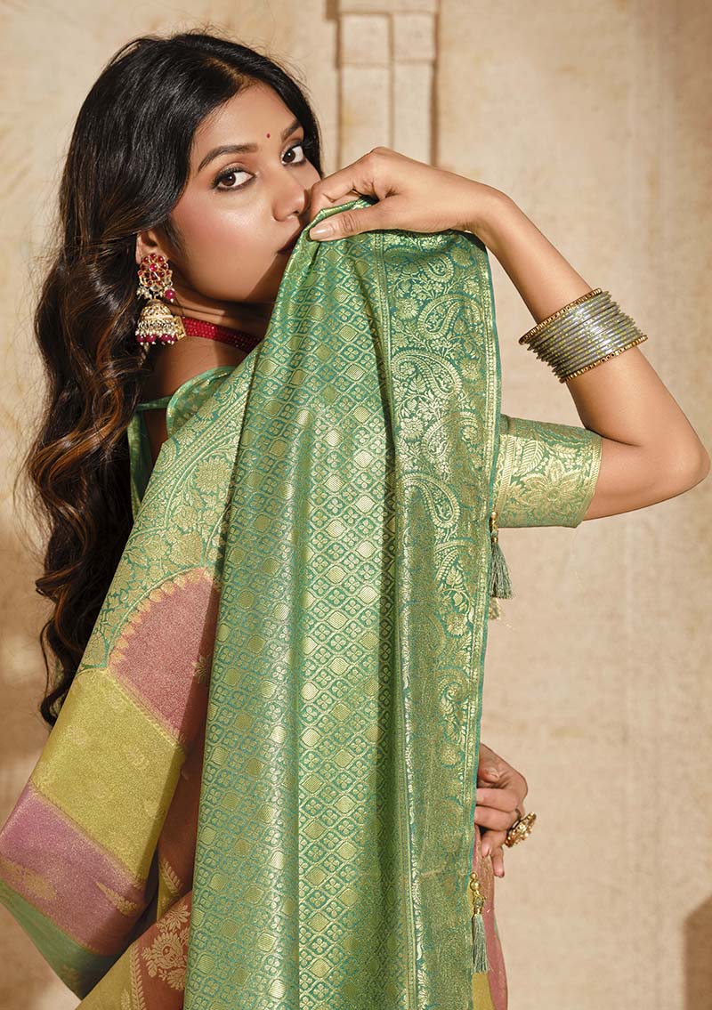 Famous designers tend to give reign to their imagination and create clothes that look interesting and guided by the desire to attract attention. Add a small burst of shade for any wardrobe with this Turquoise color silk and tissue classic saree. The enticing weaving and zari work a significant element of this attire. Comes with matching blouse.