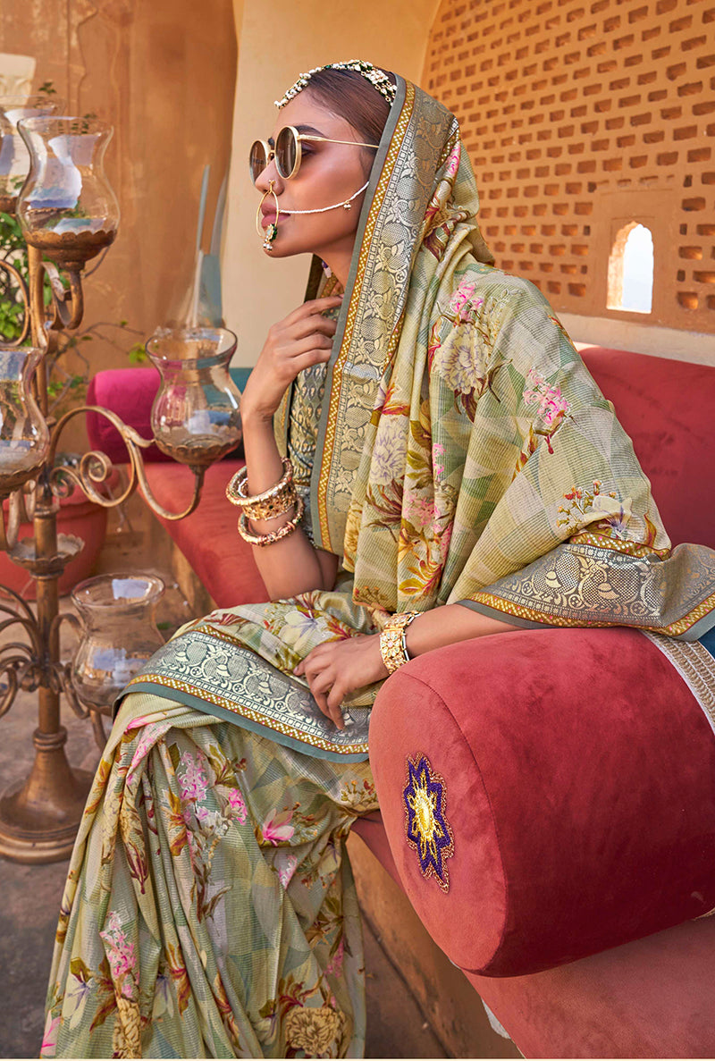 Allure the crowd adorning this Light Green colored silk blend saree crafted with floral print enhanced by woven border and tasseled pallu. Paired with a matching colored printed silk blend blouse. The unstitched blouse can be customized upto 42 inches. Do note: All the accessories shown are for styling purposes only.