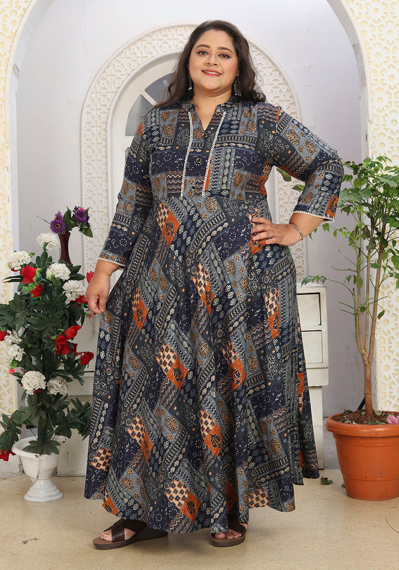 Make the heads flip when you dress up with this Navy blue Print Flared Kurti. The , fancy Print and zari work on attire personifies the complete appearance.