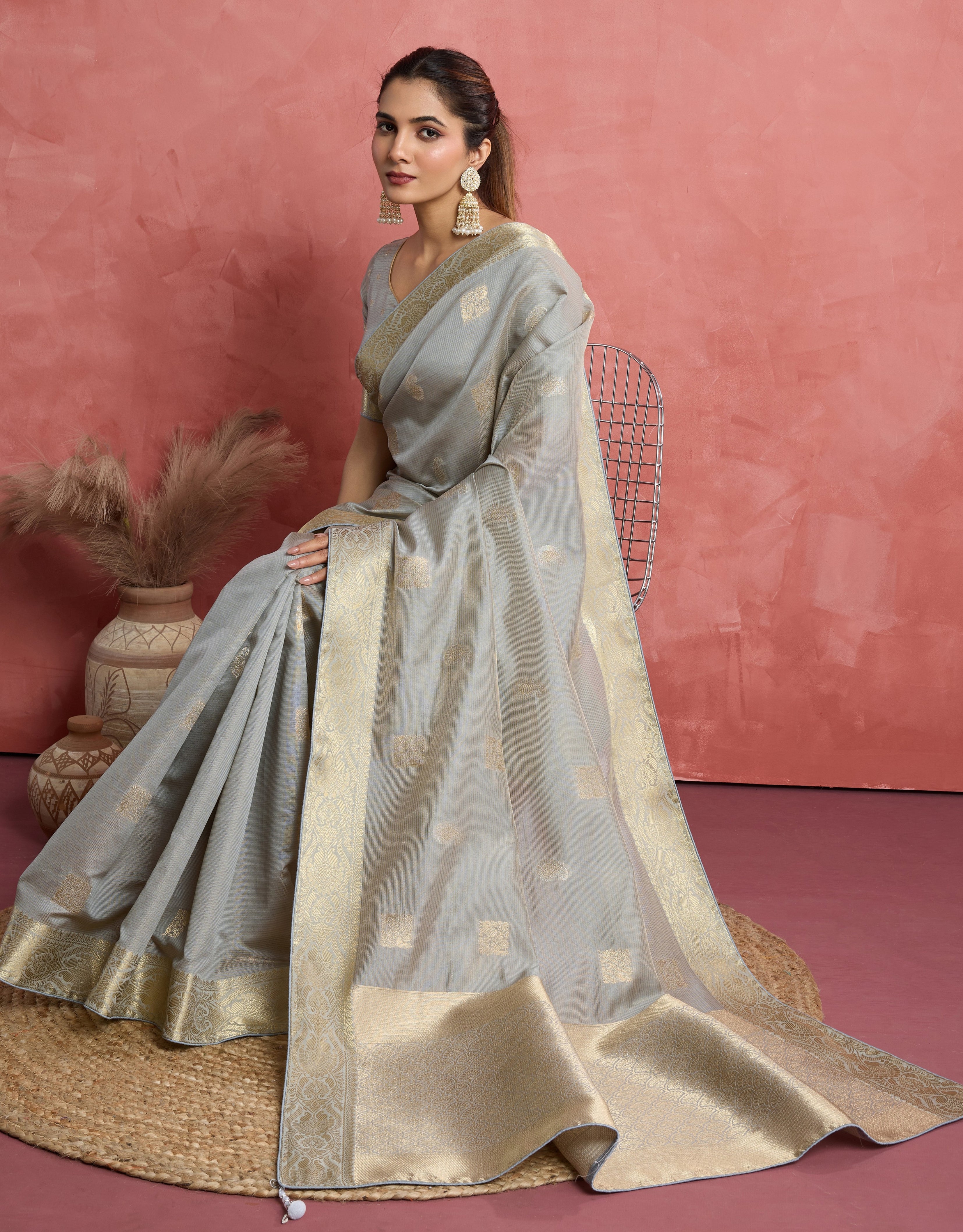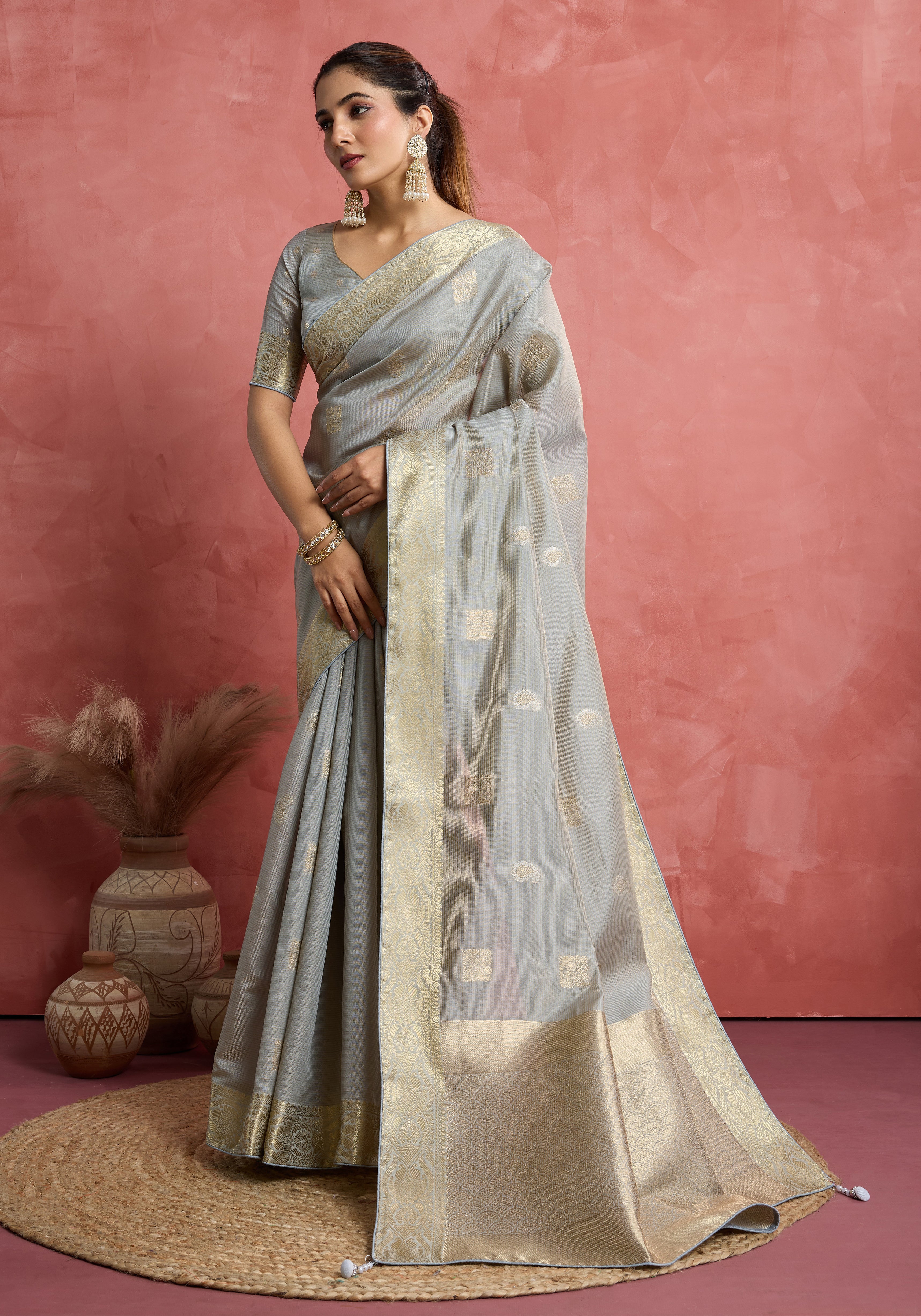 Give in to the exotic confluence of today and tomorrow in this beautiful attire. Spread the aura of freshness with this Light Grey silk classic saree showing a touch of sensuality. This attire is showing some really mesmerizing and innovative butta patterns border, plain and weaving work. Comes with matching blouse.