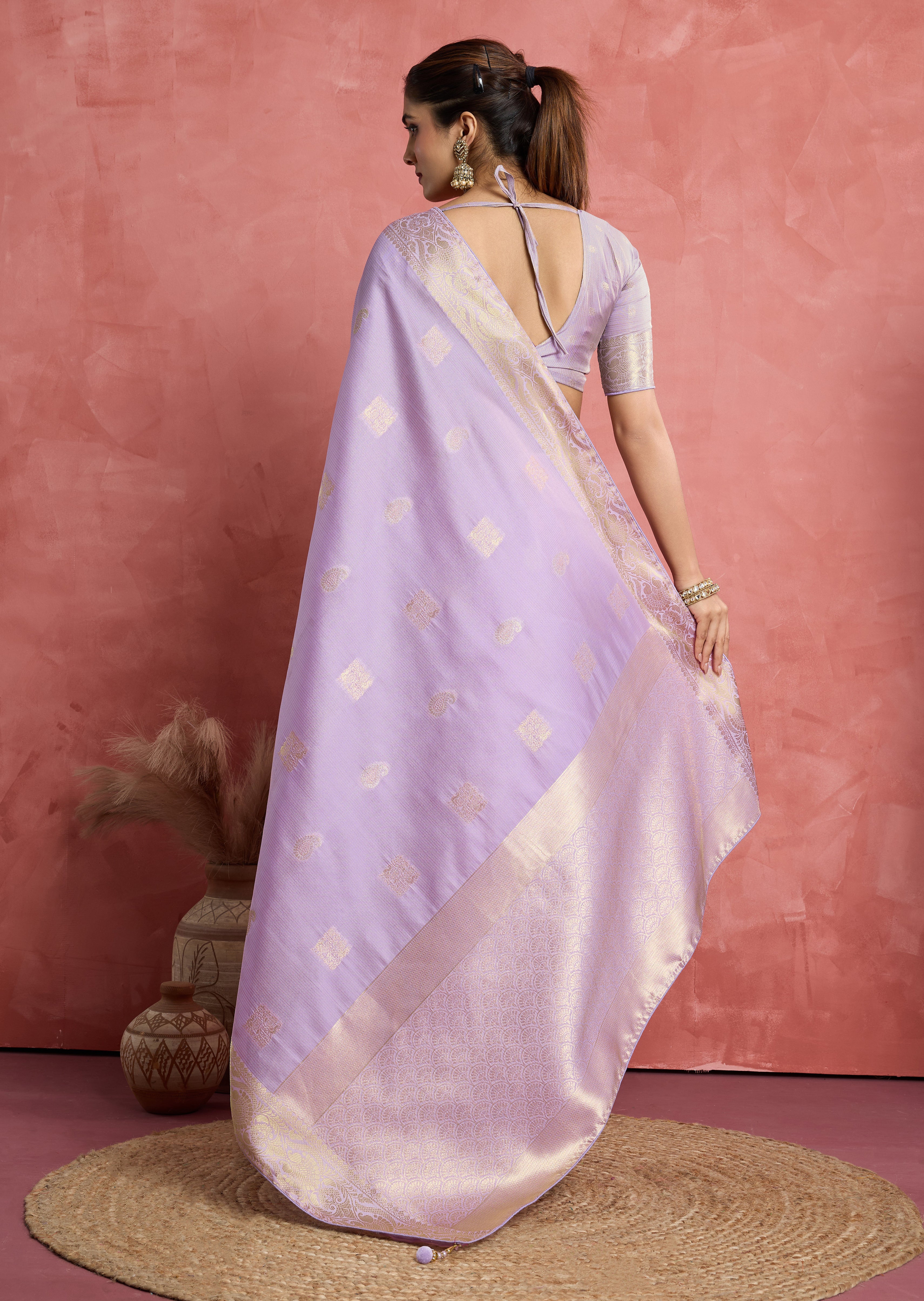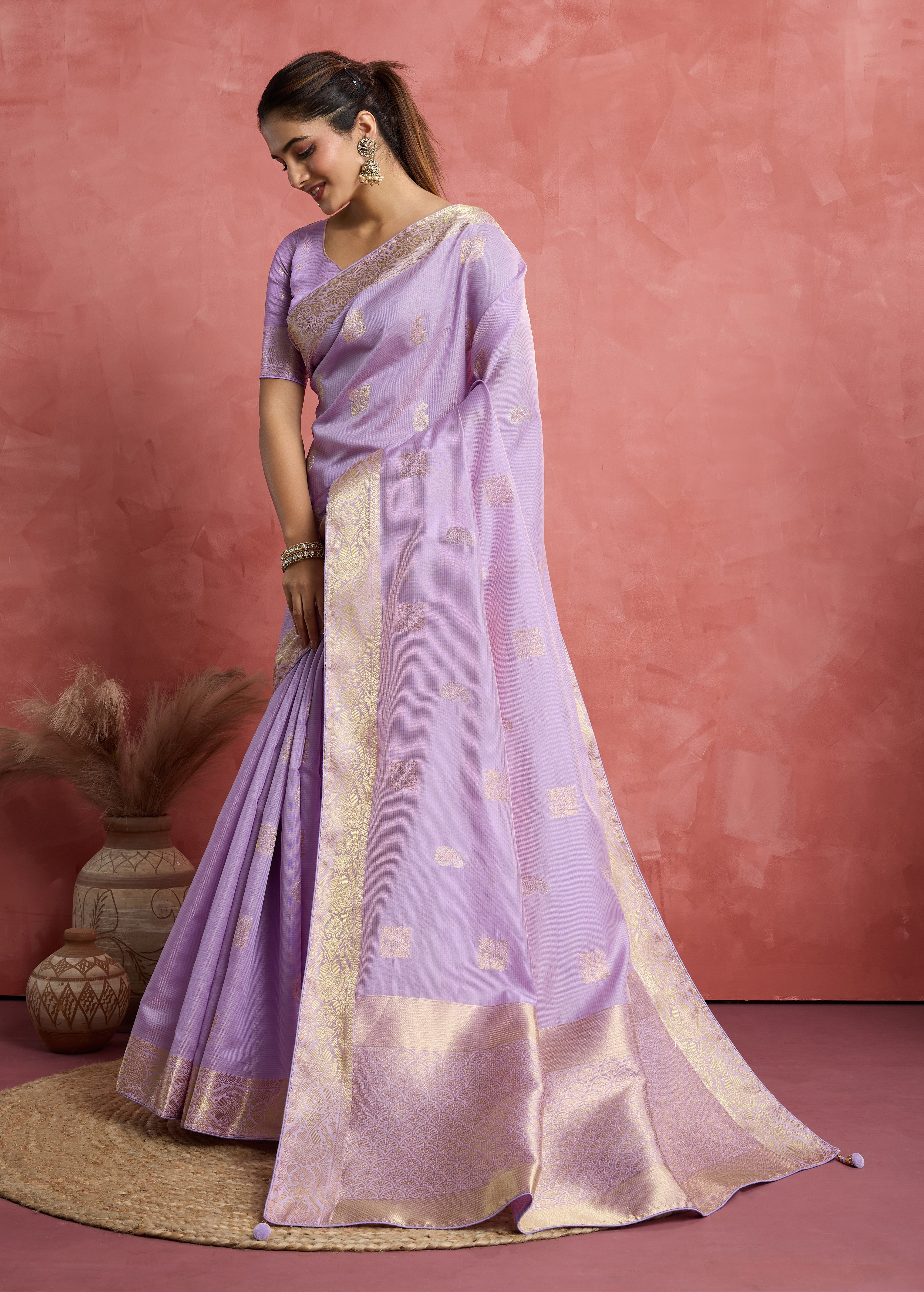 Give in to the exotic confluence of today and tomorrow in this beautiful attire. Spread the aura of freshness with this Light Lilac silk classic saree showing a touch of sensuality. This attire is showing some really mesmerizing and innovative butta patterns border, plain and weaving work. Comes with matching blouse.