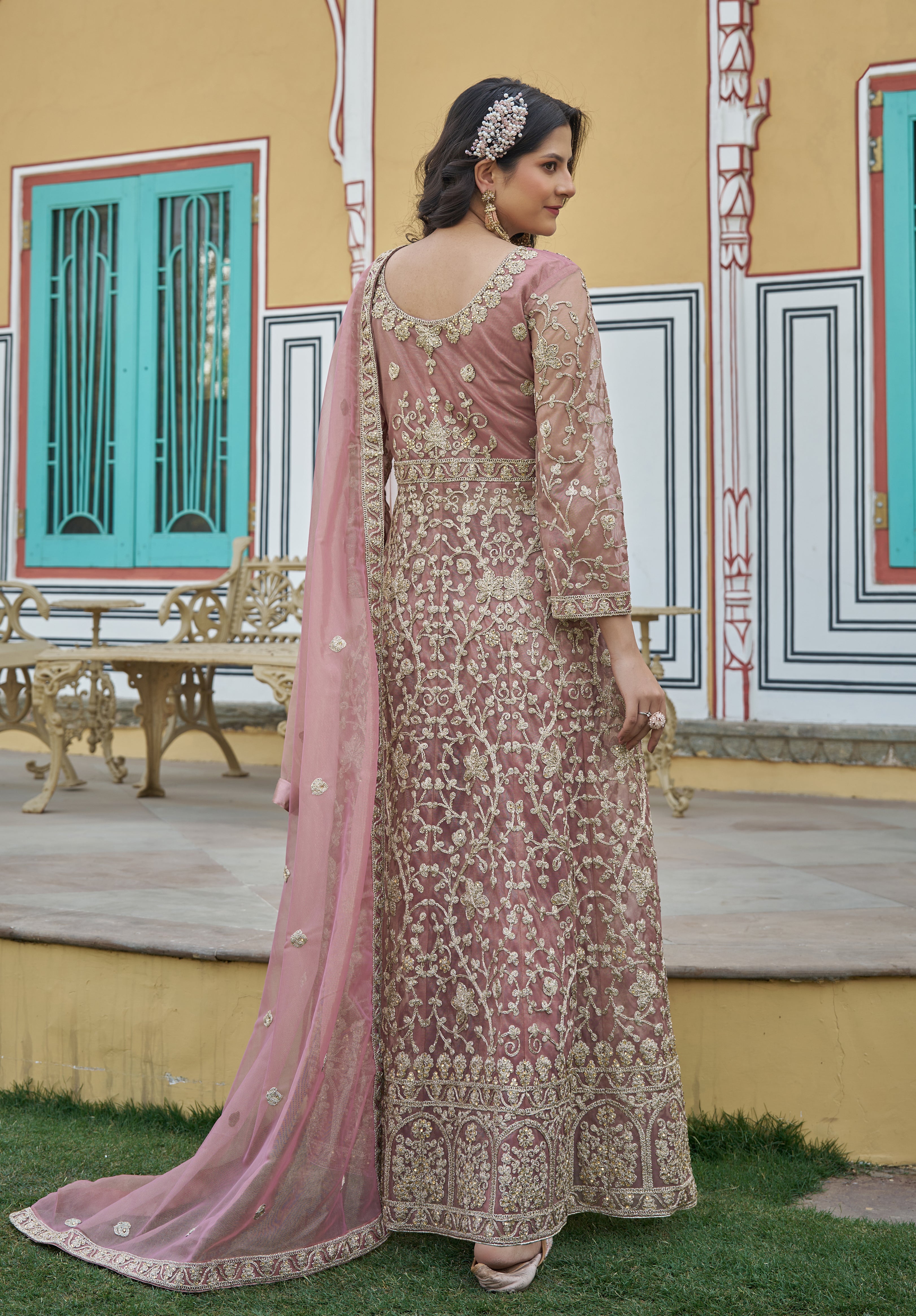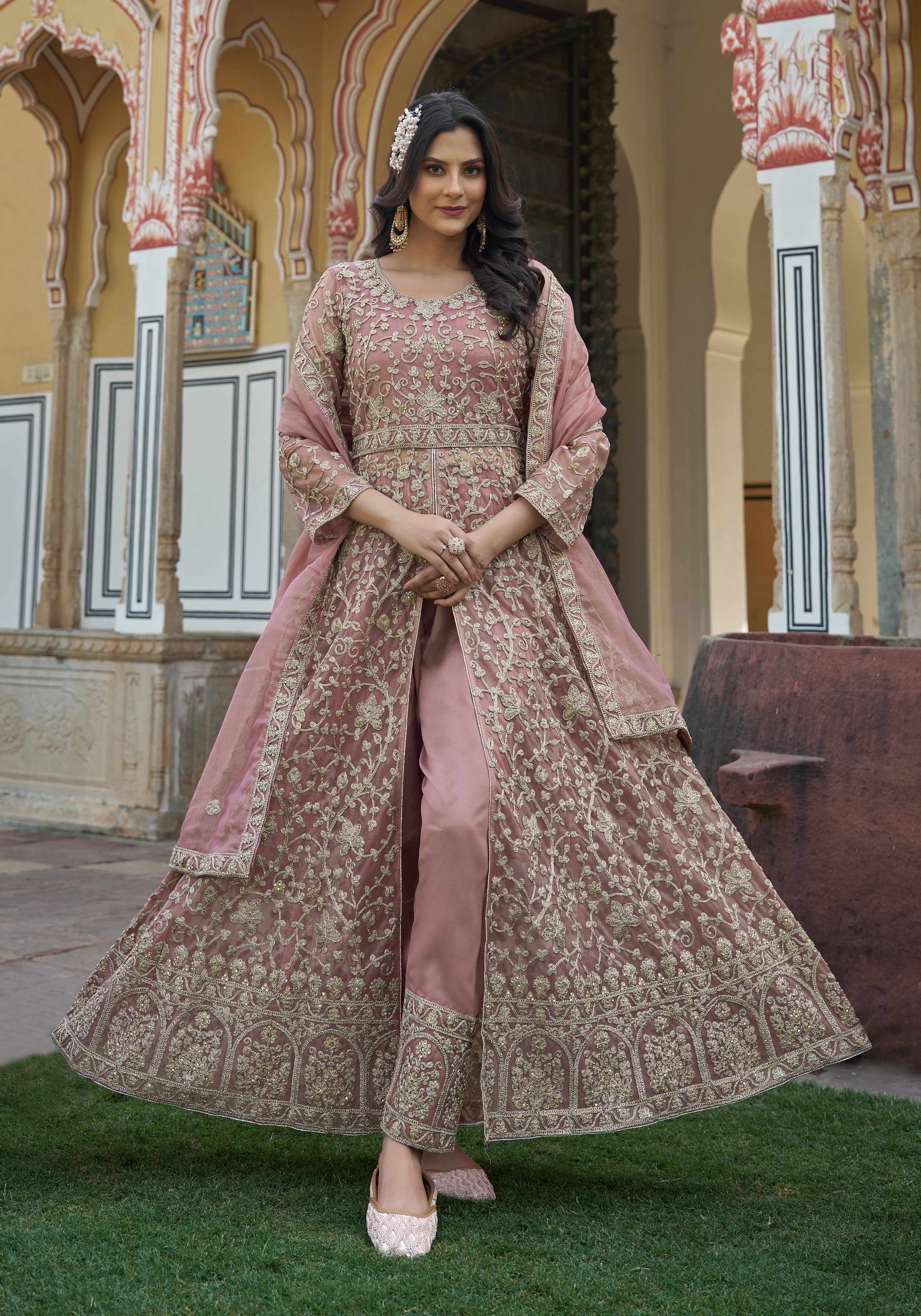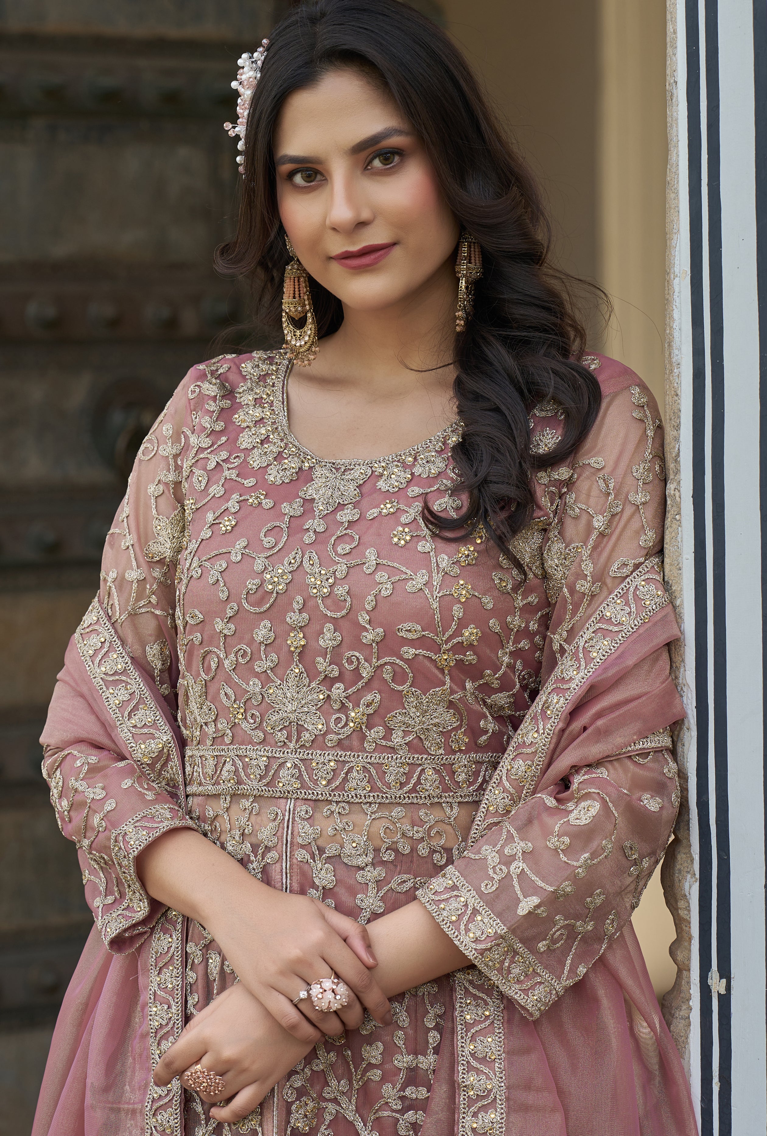 This light mauve net designer salwar suit is including the appealing glamorous showing the feel of cute and graceful. The ethnic embroidered and stone work over a attire adds a sign of splendor statement for the look. Comes with matching bottom and dupatta. Note:- Bottom comes unstiched you can stiched bottom as per your requirement skirt or pent. (Slight variation in color, fabric & work is possible. Model images are only representative.)