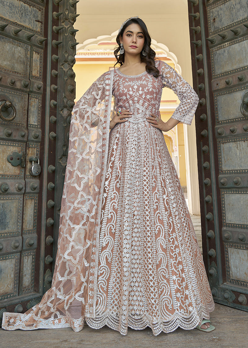 Stay Ahead In Style With This Light Peach Color Real Butterfly net Trendy Anarkali Salwar Suit. The Ethnic stone mirror Embroidered Work At The Apparel Adds A Sign Of Splendor Statement For Your Look. Comes With Matching Dupatta.