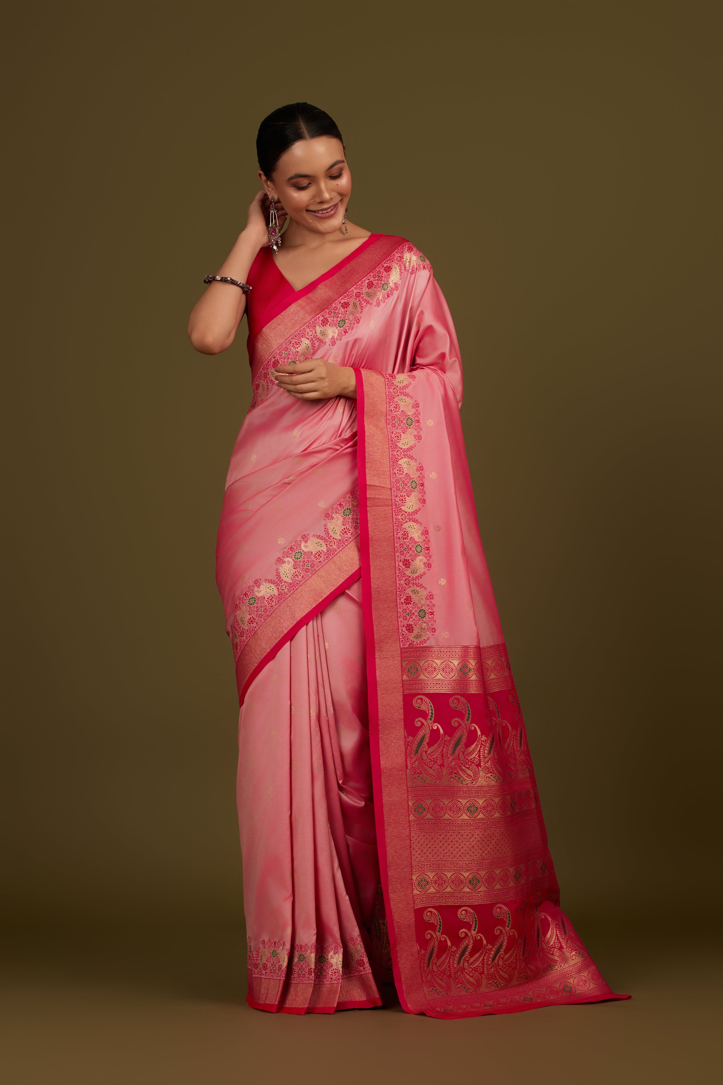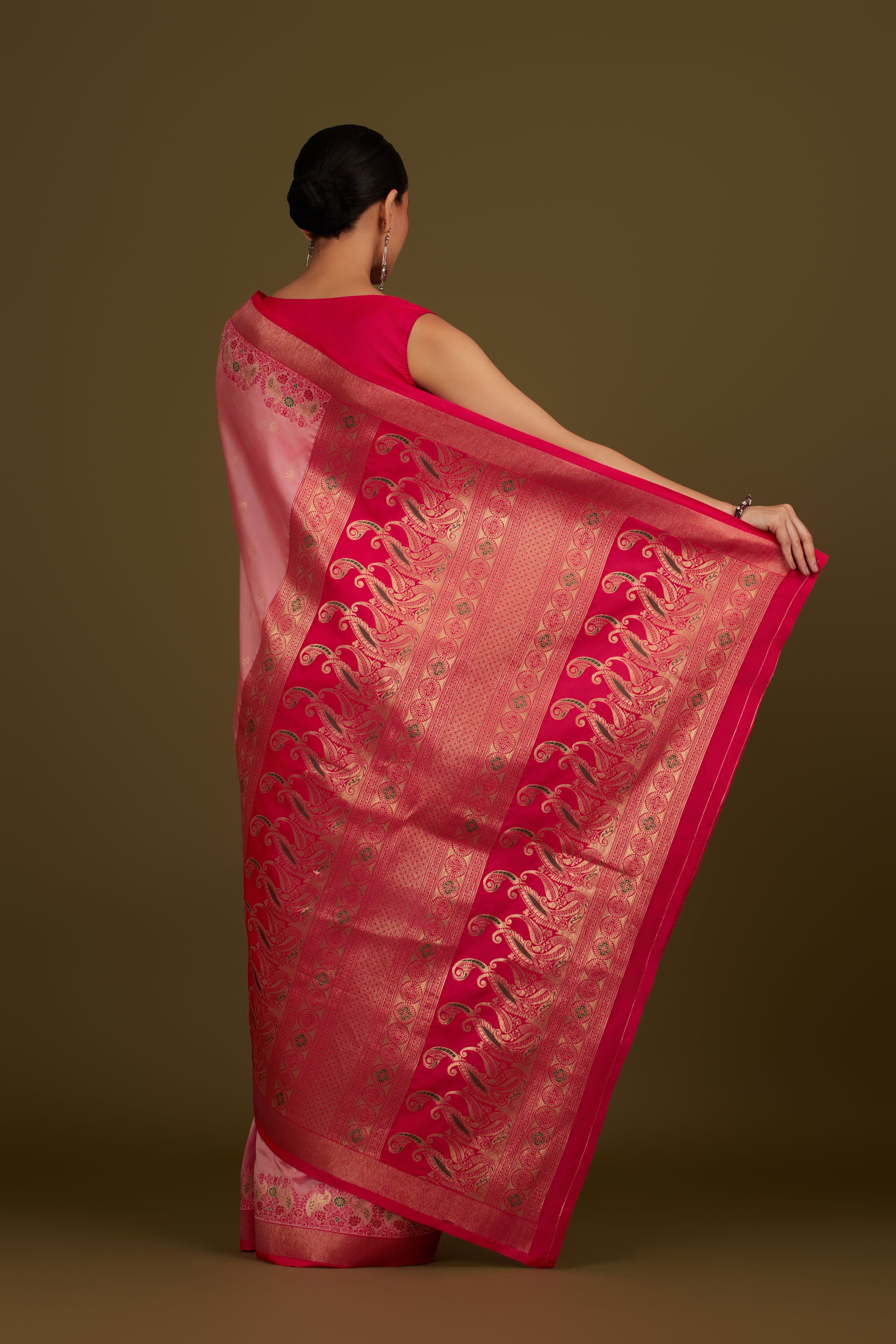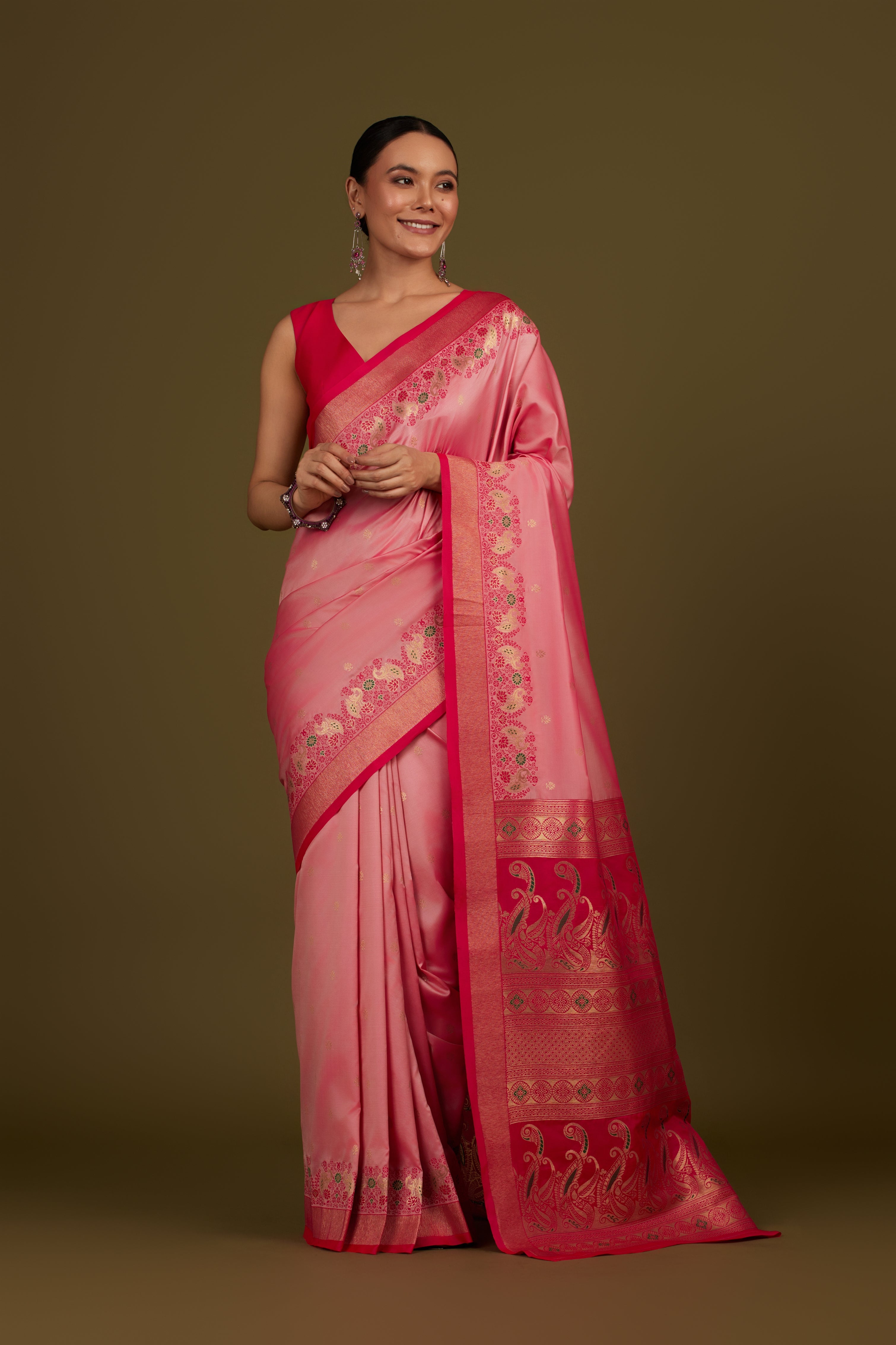 Light Pink Banarasi Silk Blend Saree, Featuring A Graceful Paisley Pattern That Is Intricately Woven With Shimmering Zari. The Saree Is Enhanced By A Rich Contrast Pallu, Adding An Exquisite Touch Of Color And Contrast.
