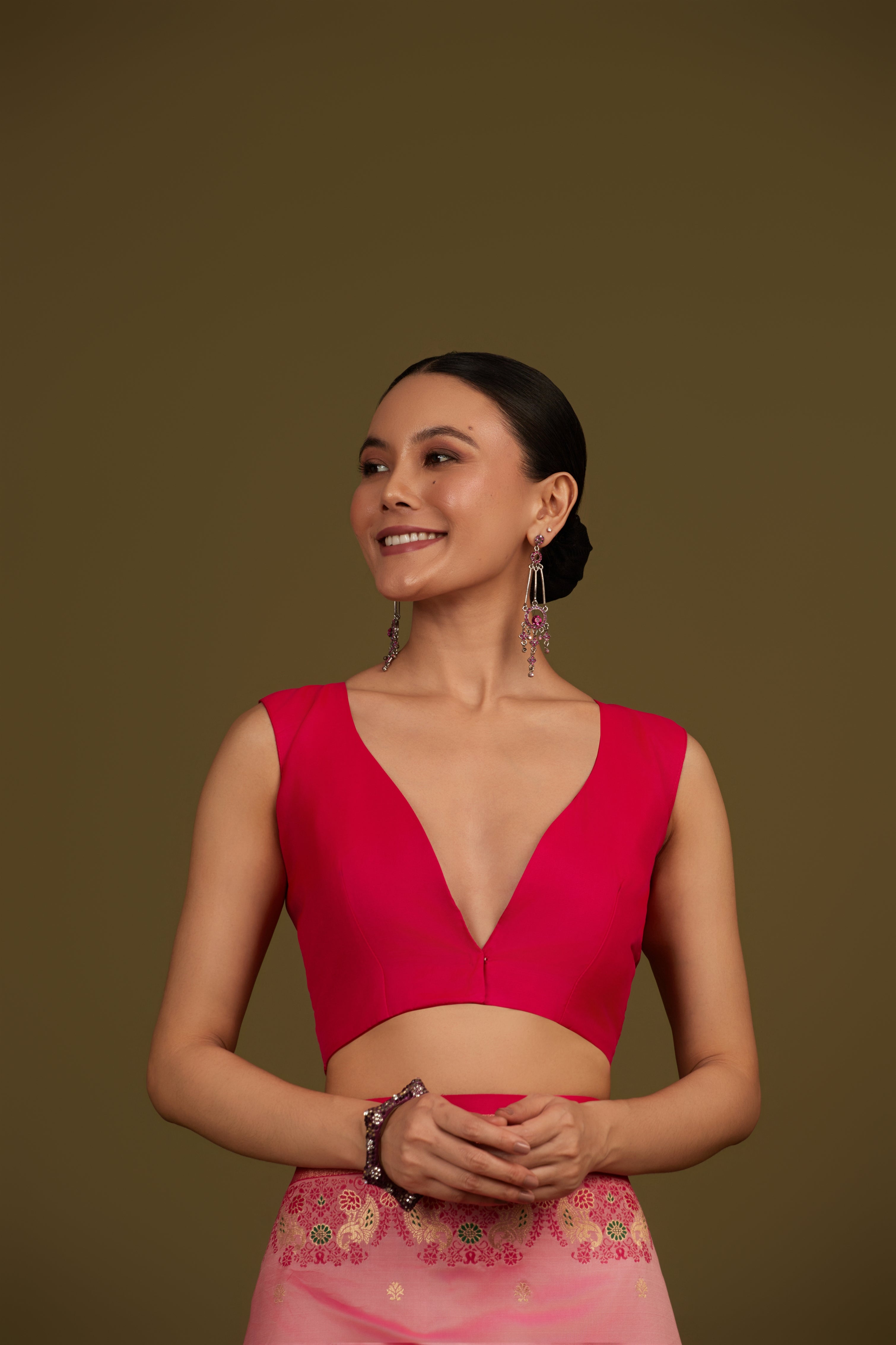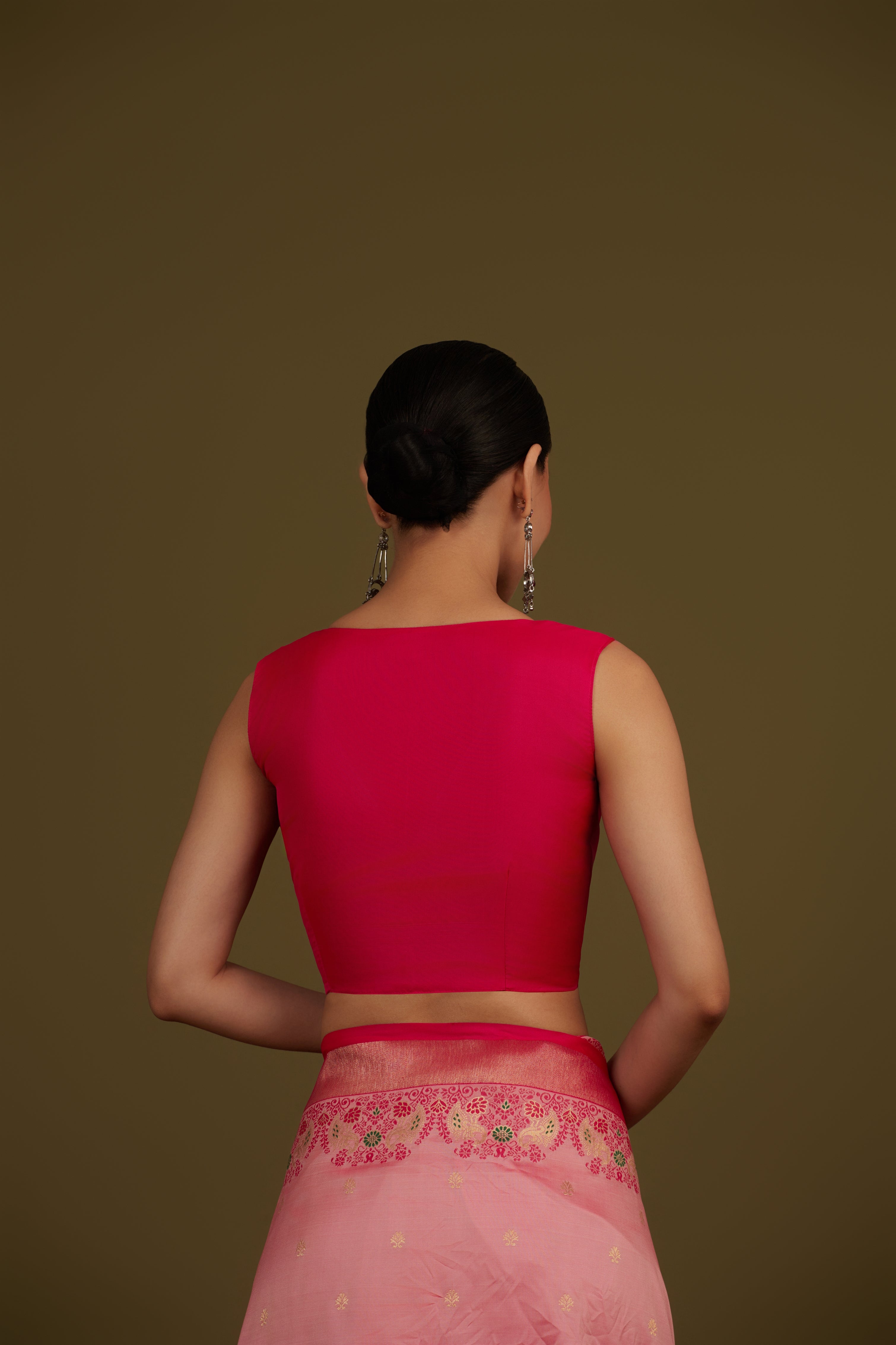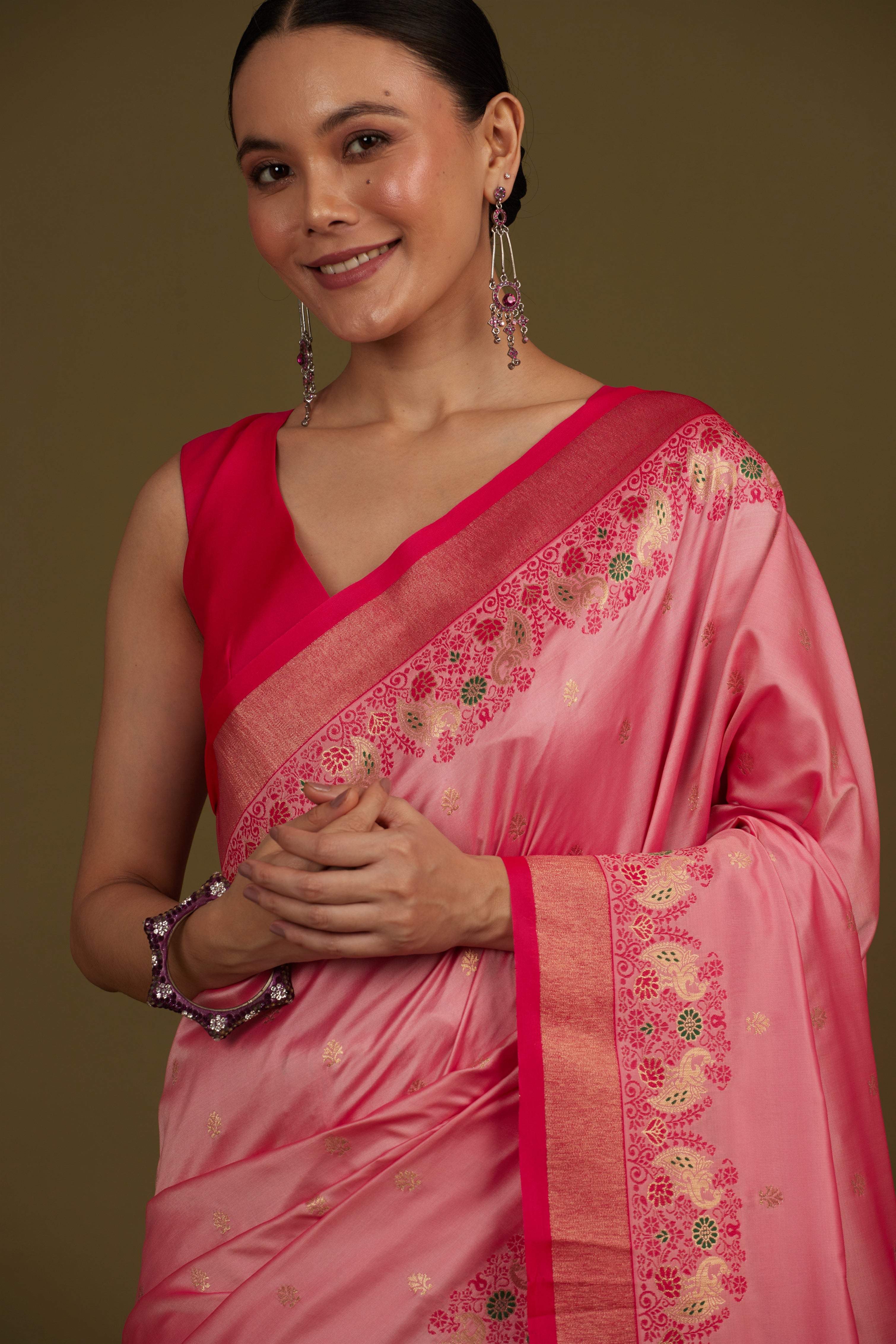 Light Pink Banarasi Silk Blend Saree, Featuring A Graceful Paisley Pattern That Is Intricately Woven With Shimmering Zari. The Saree Is Enhanced By A Rich Contrast Pallu, Adding An Exquisite Touch Of Color And Contrast.