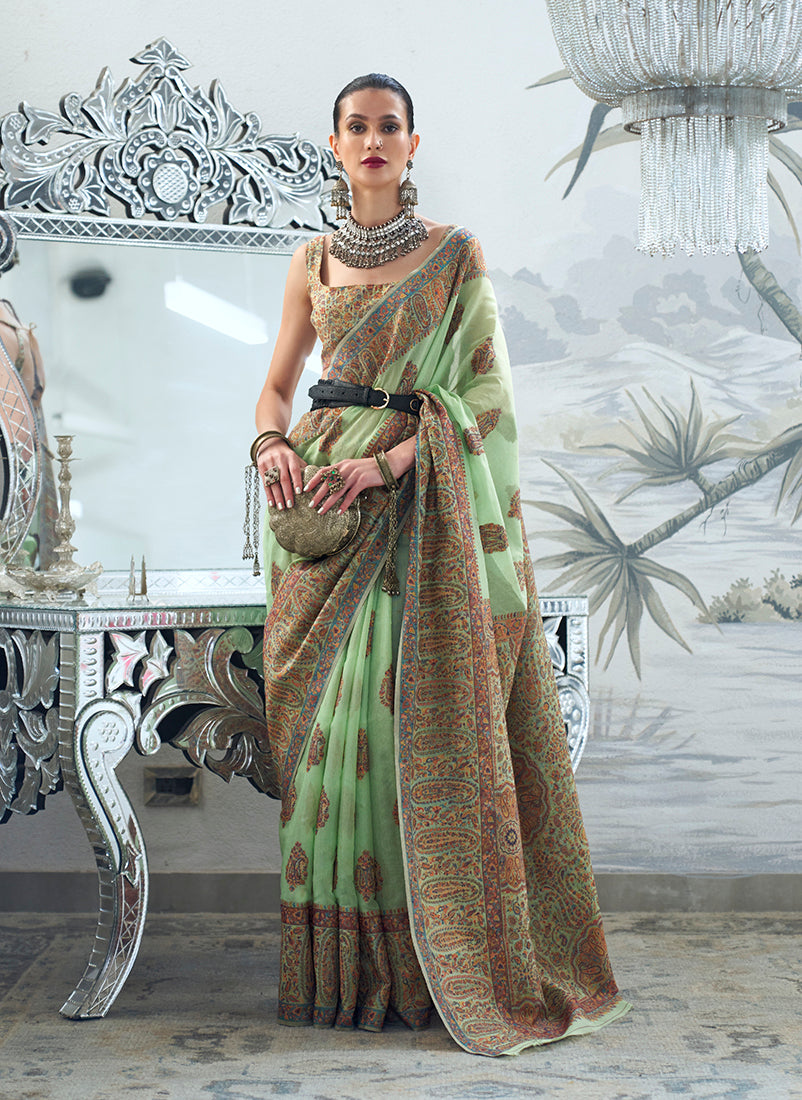 Monjolika Fashion bring out your inner queen with this lightweight silk saree, designed with a pashmina-like finish and adorned with intricate Kashmiri Zari detailing. A celebration of Indian textile artistry in every thread.