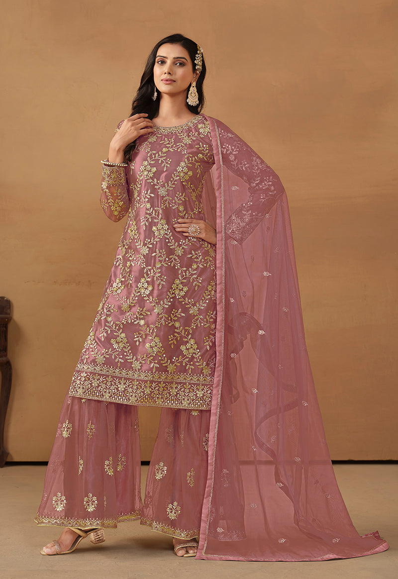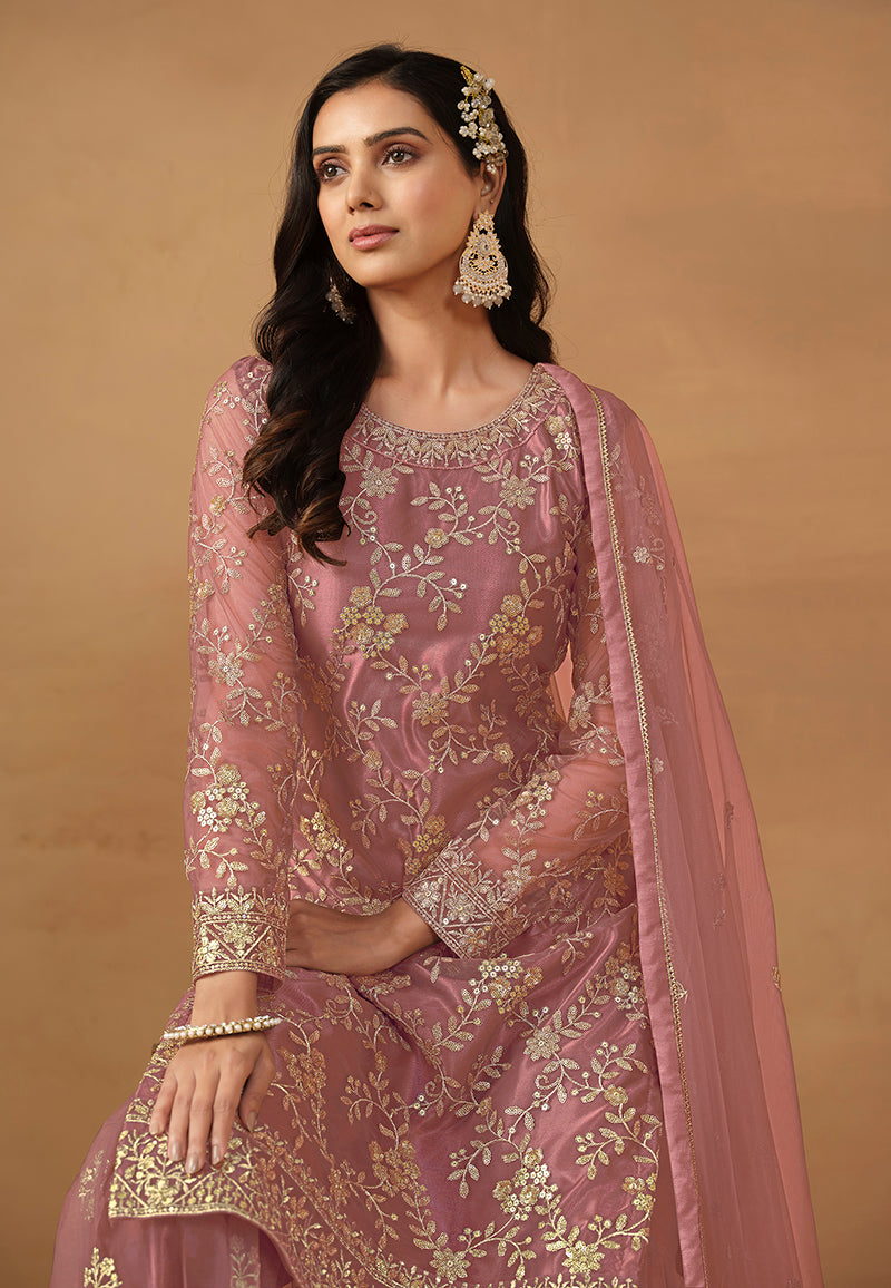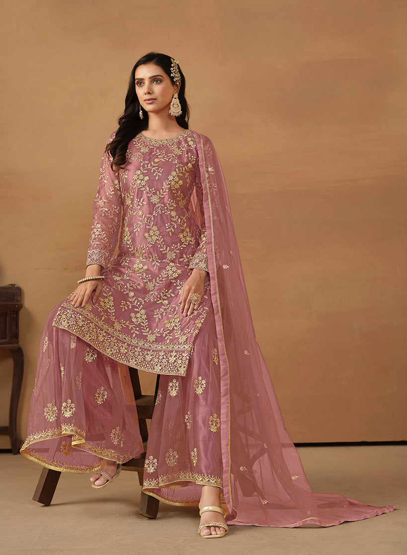 Monjolika fashion presents look sensationally awesome in this Light Pink color net trendy sharara suit. This ravishing attire is amazingly embroidered with zari and sequins work. Comes with matching bottom and dupatta. Sharara suit is known for its elegance and comfort, and it’s often chosen for festive occasions, weddings, and formal events. This semi stitched suit can be stitched upto size 42".